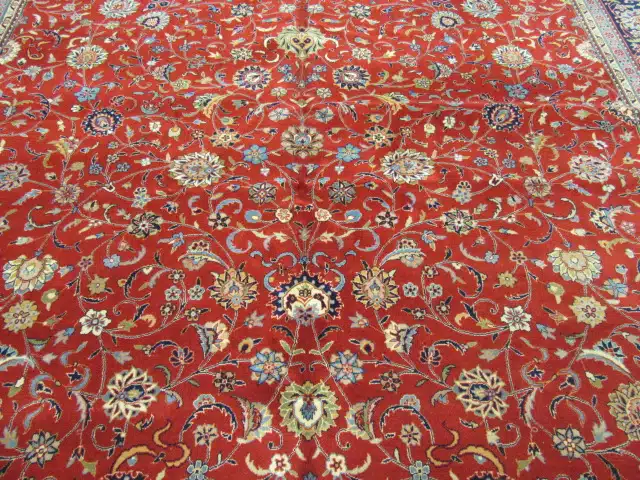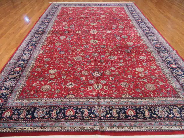 This impressive large Chinese Kashan design rug features a vibrant red field covered in elegant floral medallions and scrolling vines, framed by deep navy borders. Hand-knotted in wool, it delivers rich color and exceptional durability. See the long description for more details.