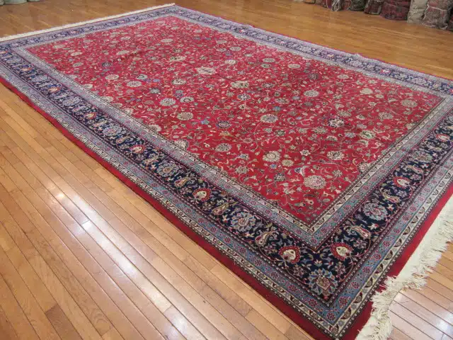 An 10×16 rug like this one is ideal for spacious living rooms, formal dining areas, or large open-plan spaces under long tables and sofas. The bold red field brings warmth and energy to the room, while the blue borders provide grounding contrast. Wool makes it comfortable for barefoot walking, resistant to wear, and simple to maintain with regular vacuuming.