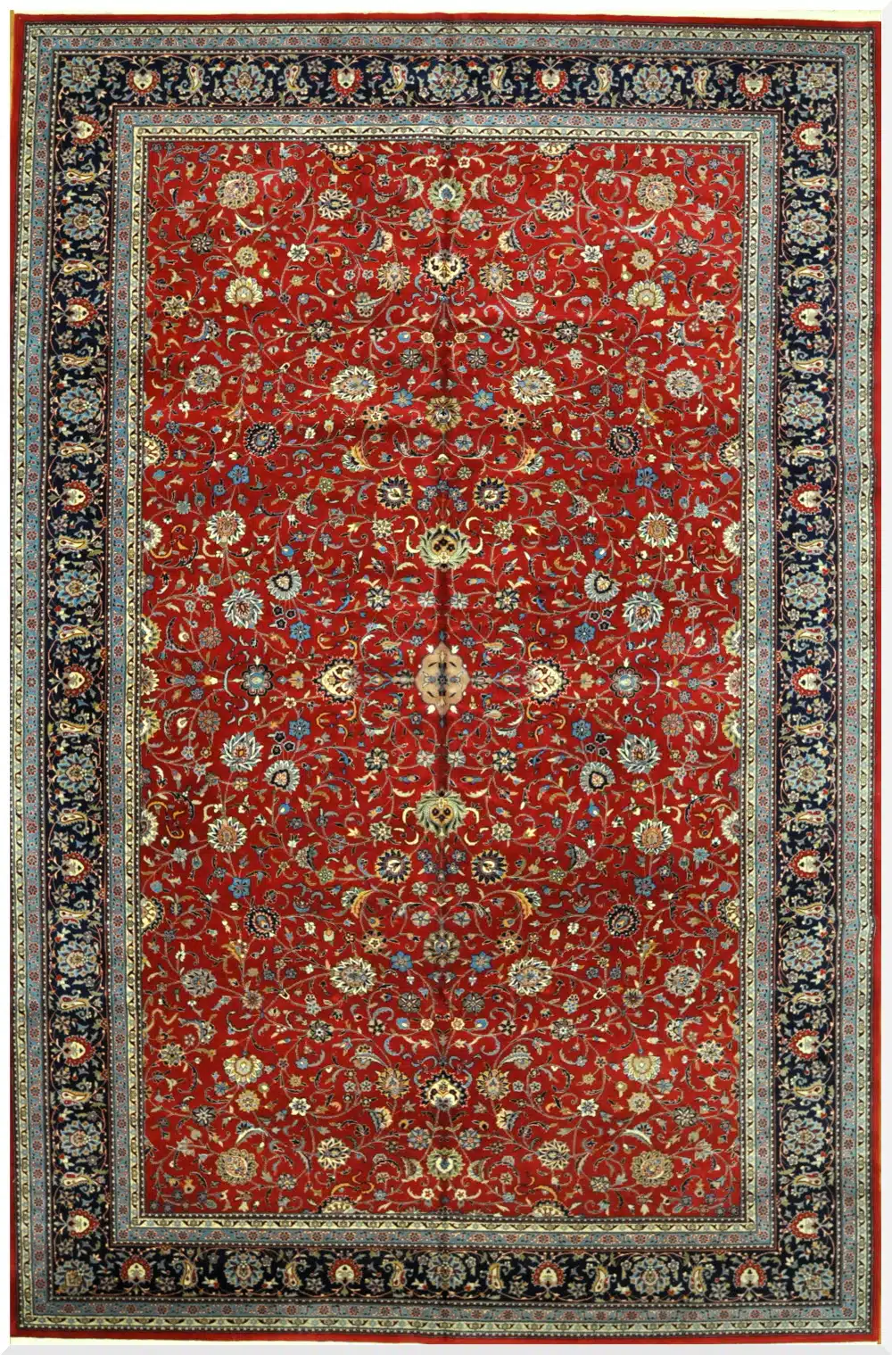 This large hand-knotted Chinese rug follows the classic Kashan design with an all-over pattern of repeating floral medallions, vines, and palmettes spread across a deep red background. A central medallion is surrounded by scrolling flowers and leaves, while the wide navy borders feature intricate corner spandrels and multiple guard borders for added depth. The overall layout creates a sense of movement and balance in this oversized piece.