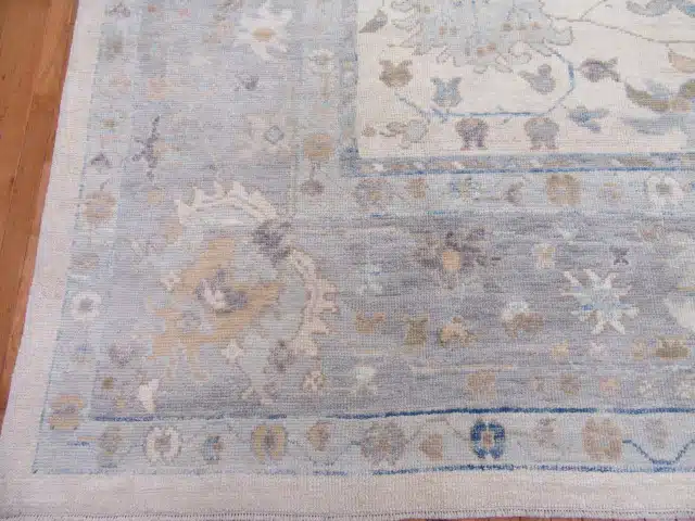 This large handmade Turkish Oushak rug features a grand, open composition with a prominent central medallion surrounded by flowing floral vines, large palmettes, and corner spandrels on a gentle pale blue field. Multiple wide borders with repeating motifs in warm beige and gold tones frame the design, creating an airy and sophisticated appearance. Subtle abrash and soft color blending give it a timeless, vintage-inspired look while the rug remains in pristine new condition.