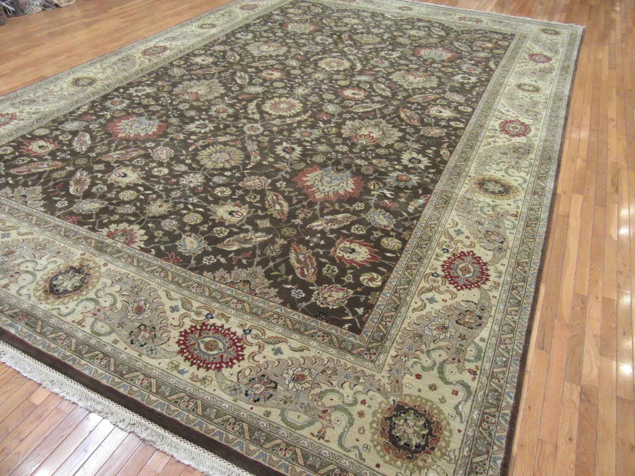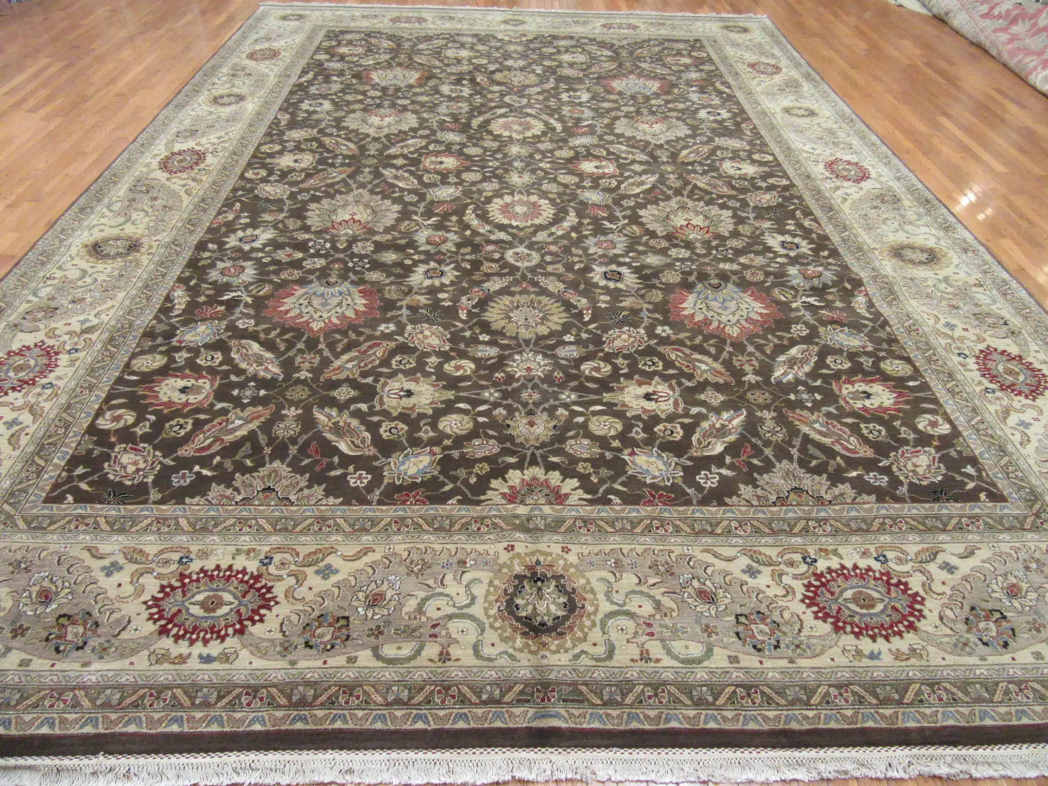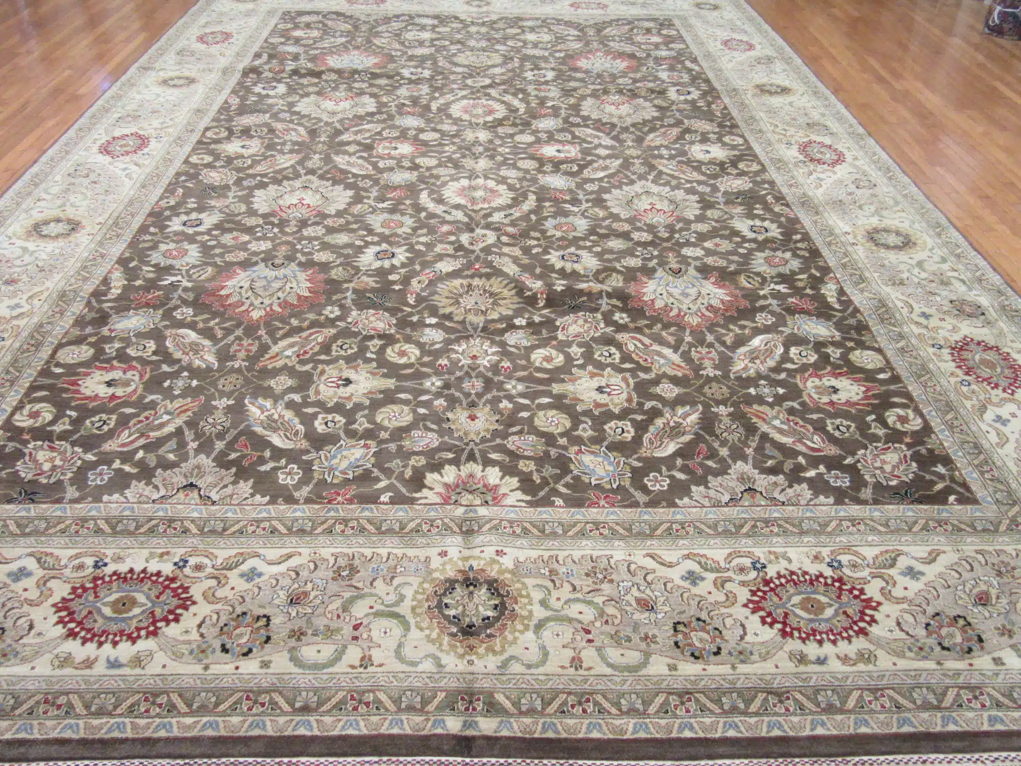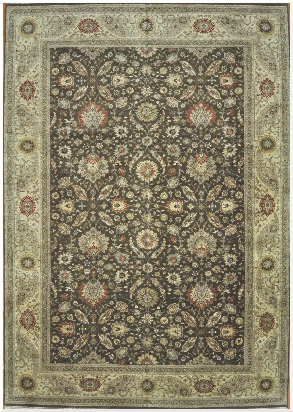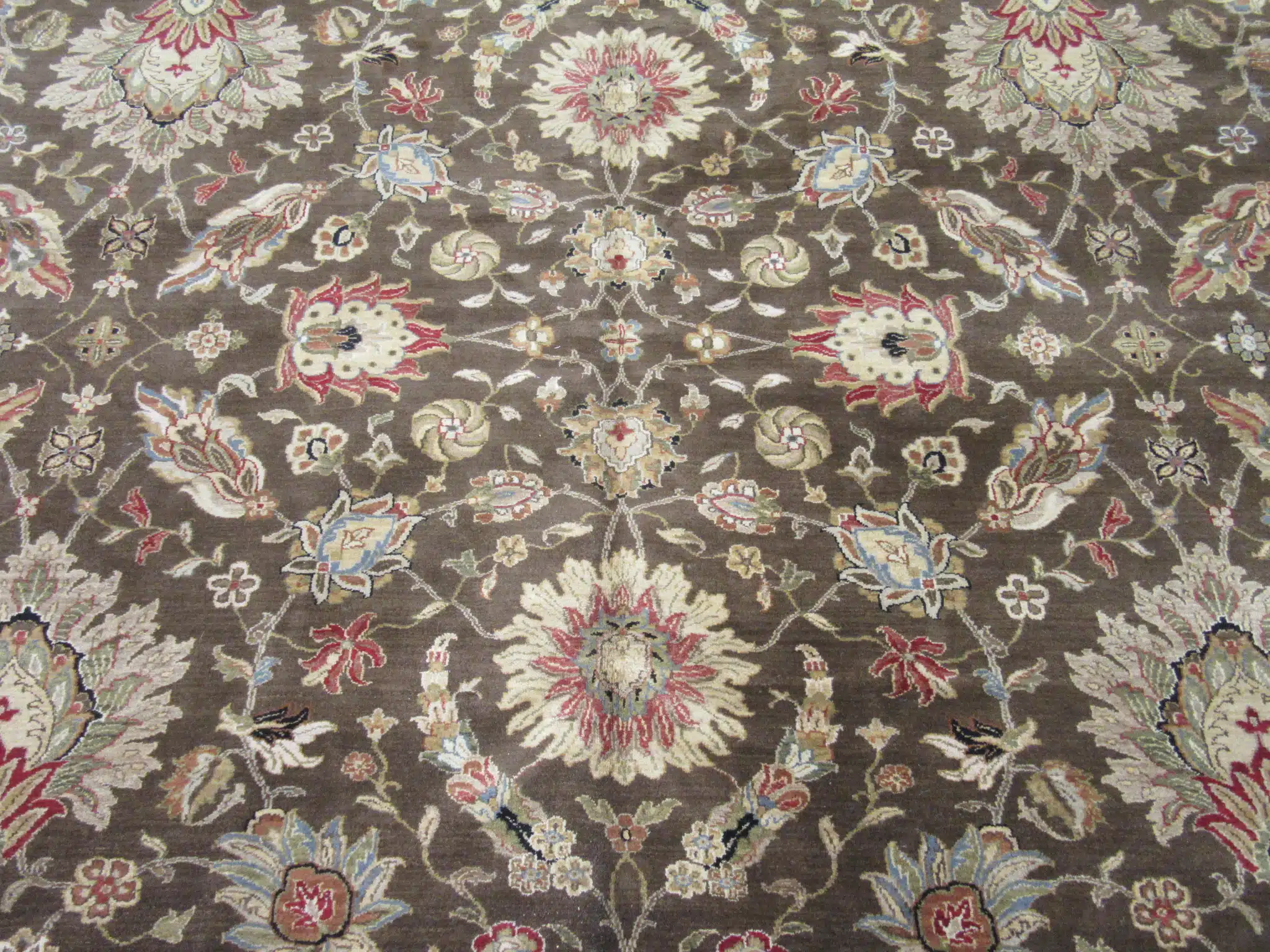 This large-scale hand-knotted rug is inspired by classic Persian Kashan designs, expertly crafted in India using traditional weaving techniques. The composition features an elegant all-over floral pattern with finely detailed palmettes, blossoms, and scrolling vines arranged in perfect symmetry across the field.