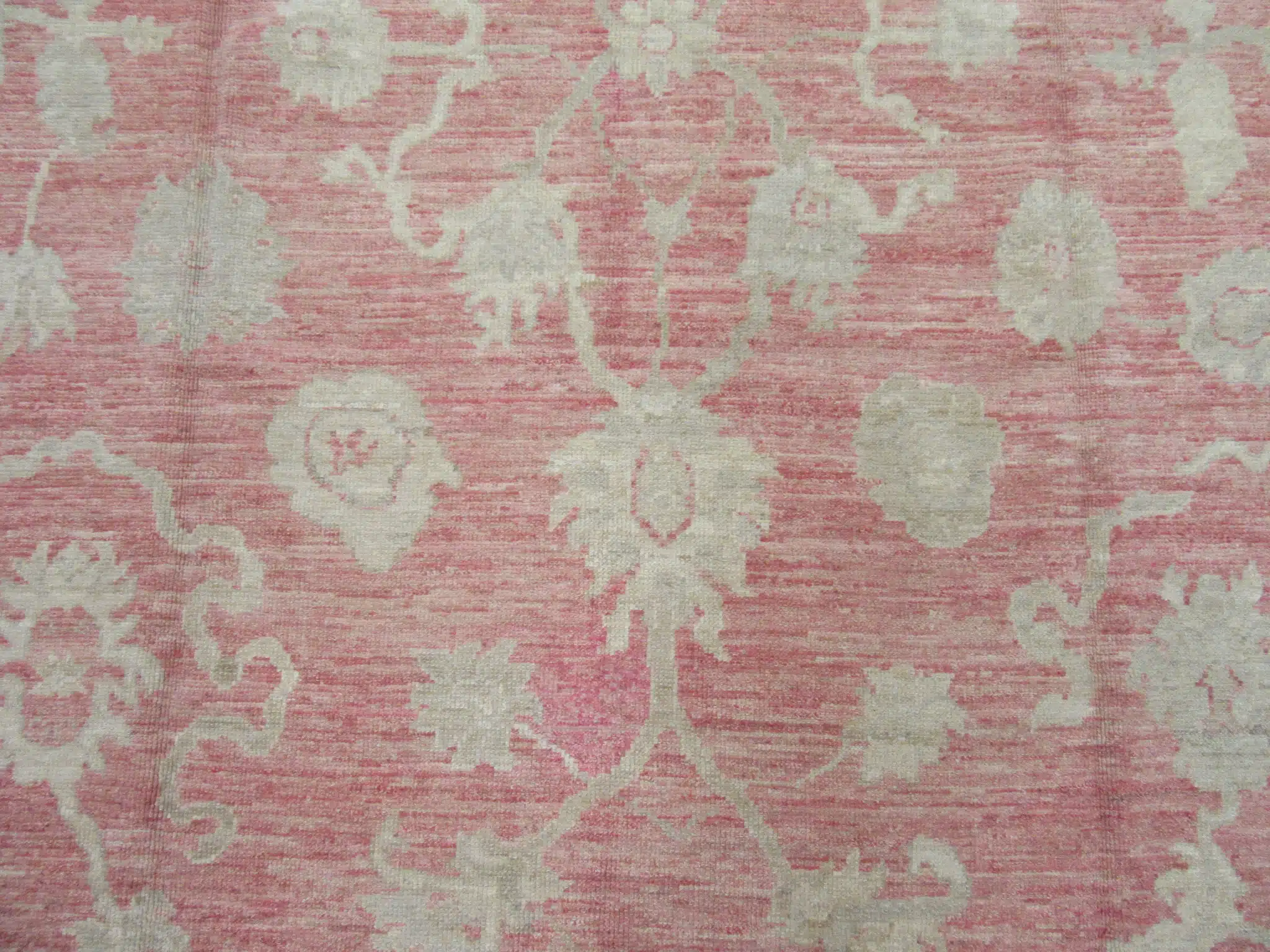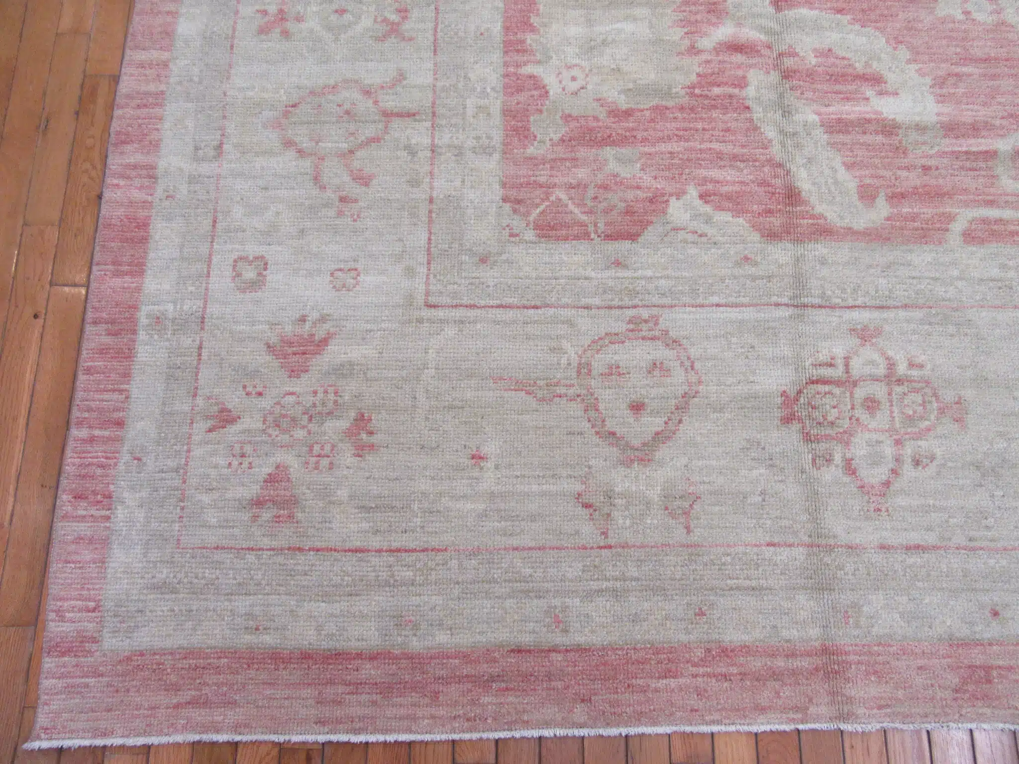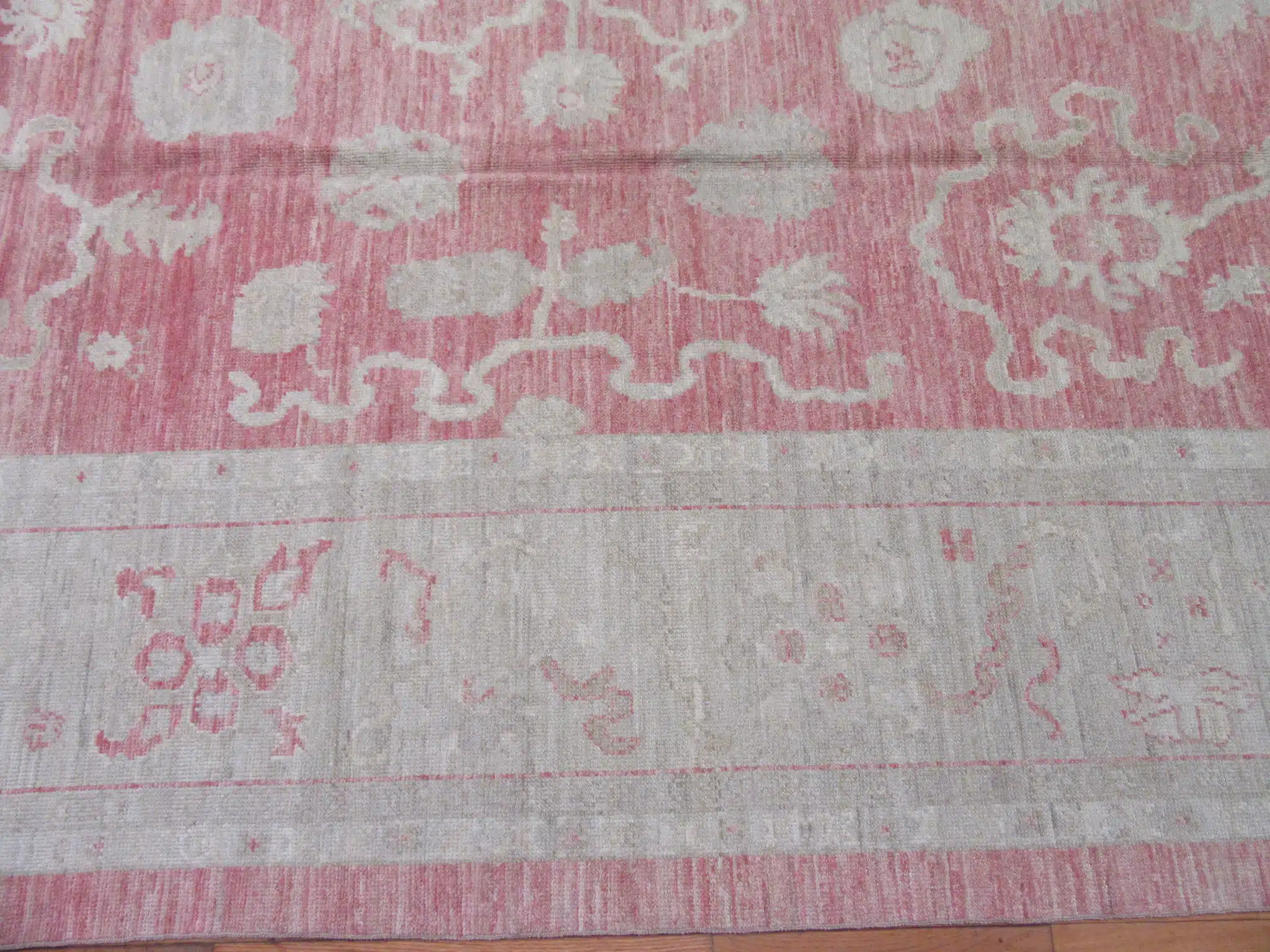 Oushak rugs are traditionally woven in the Uşak region of western Turkey, famous since the Ottoman era for their large-scale patterns and pastel or muted palettes. This contemporary piece faithfully recreates the classic style using fine hand-spun wool and natural dyes, achieving the desired vintage patina through careful abrash and washing techniques while maintaining excellent new condition and craftsmanship.