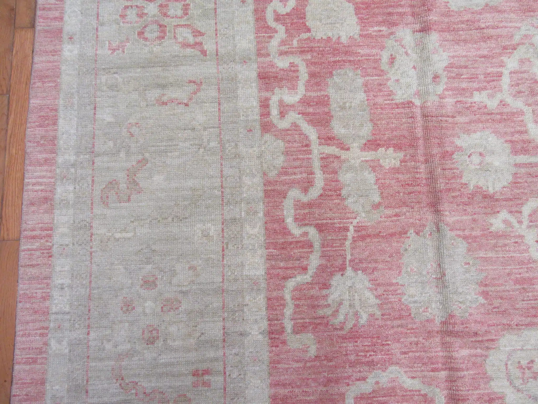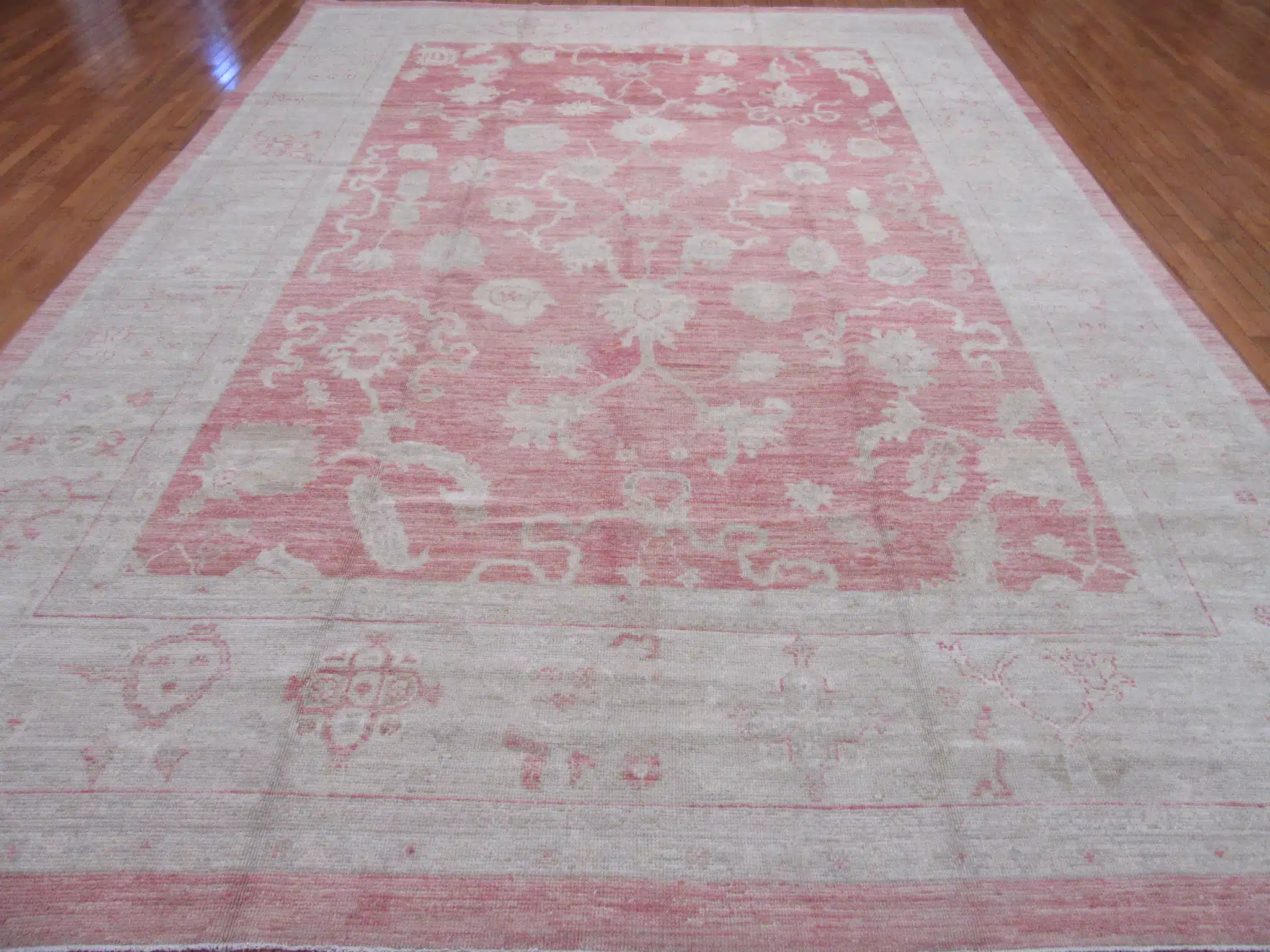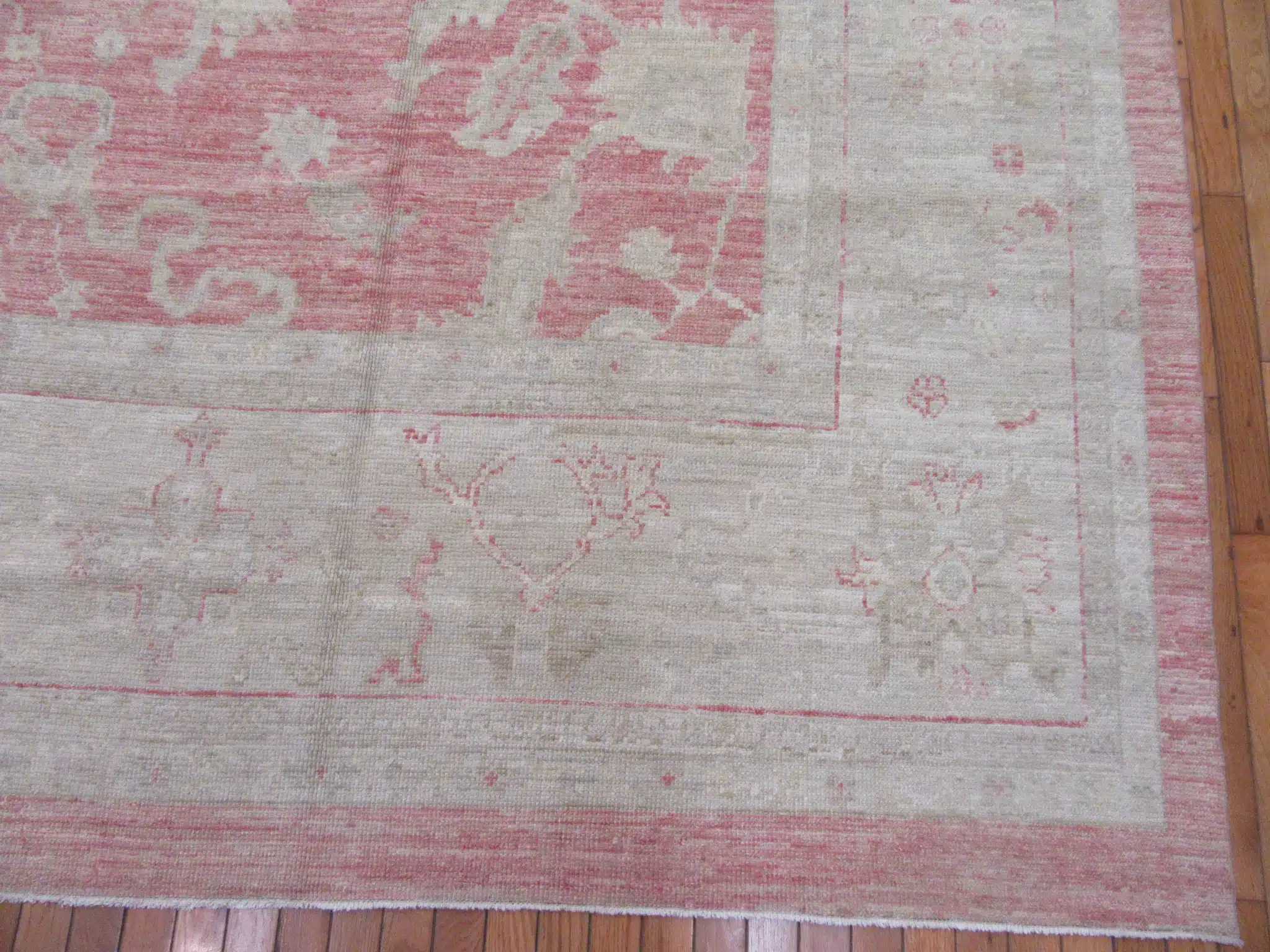 Oushak rugs are traditionally woven in the Uşak region of western Turkey, famous since the Ottoman era for their large-scale patterns and pastel or muted palettes. This contemporary piece faithfully recreates the classic style using fine hand-spun wool and natural dyes, achieving the desired vintage patina through careful abrash and washing techniques while maintaining excellent new condition and craftsmanship.