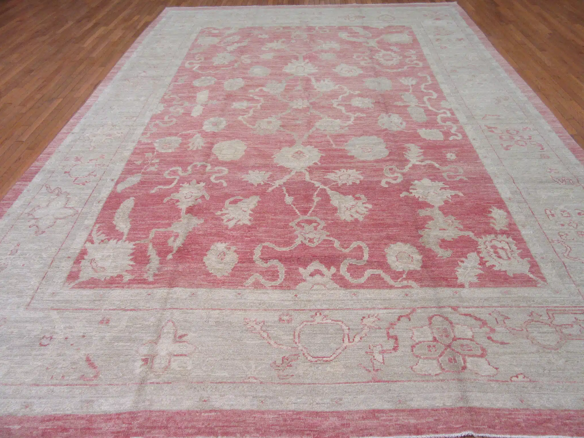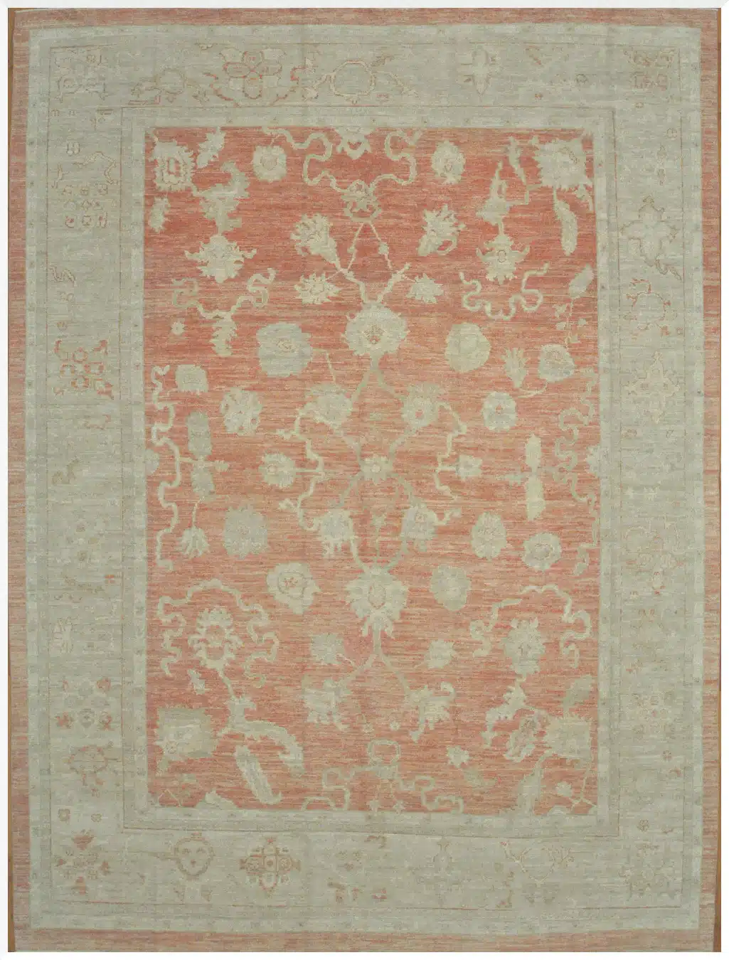 This large new hand-knotted Turkish Oushak rug features a spacious open design with a gentle central medallion surrounded by flowing vines, large floral palmettes, and corner spandrels on a soft terracotta red field. The subtle abrash in the natural dyes creates natural color variations that give it an authentic antique appearance, while multiple wide borders with repeating motifs frame the composition for a balanced and elegant look. The overall effect is calm and timeless, with the red tones softened to blend seamlessly into modern spaces.