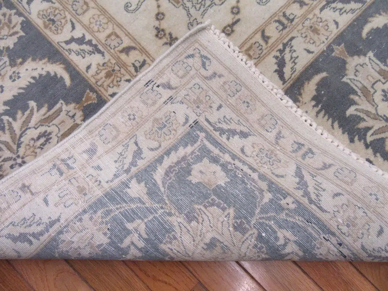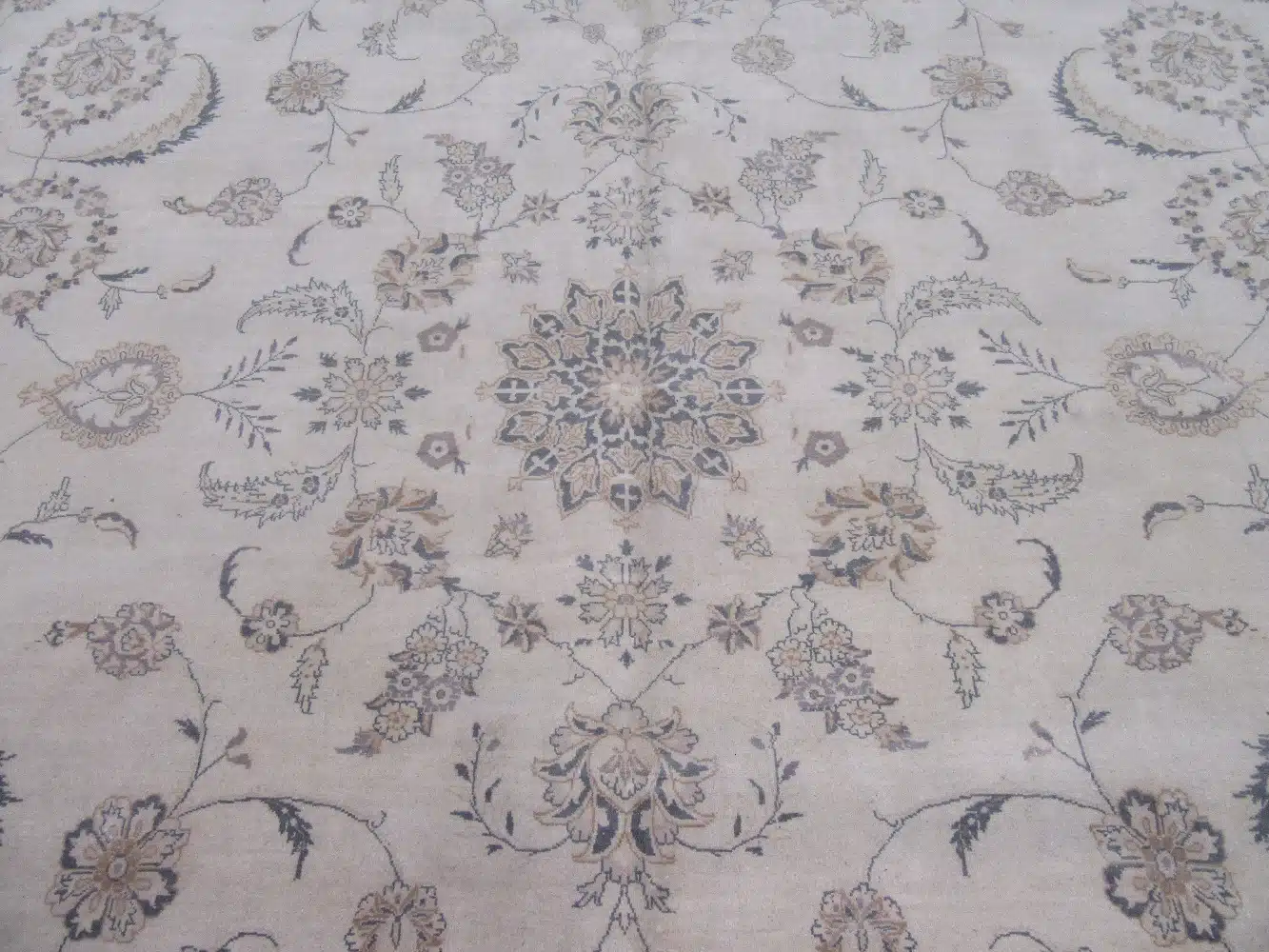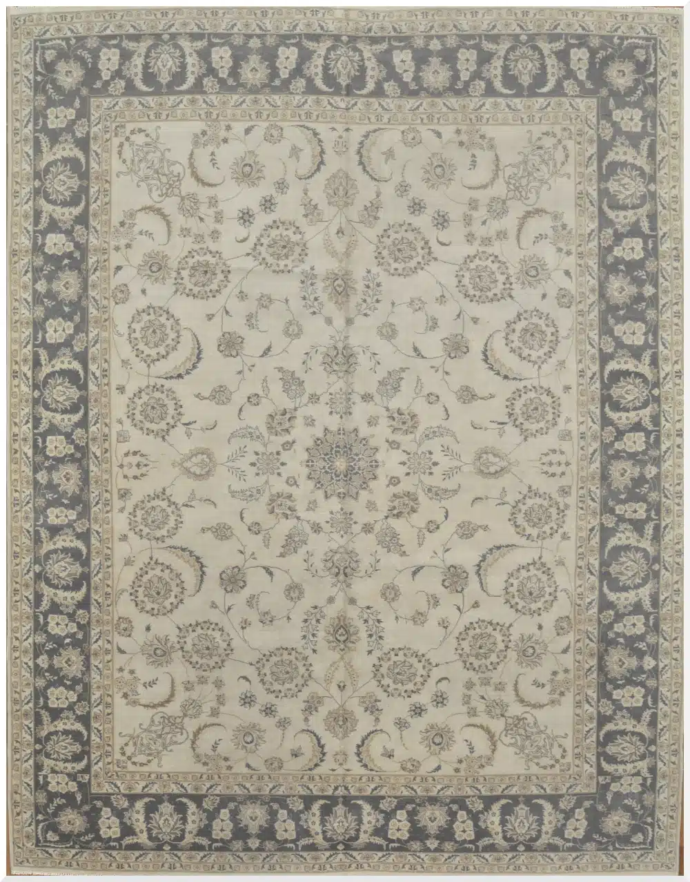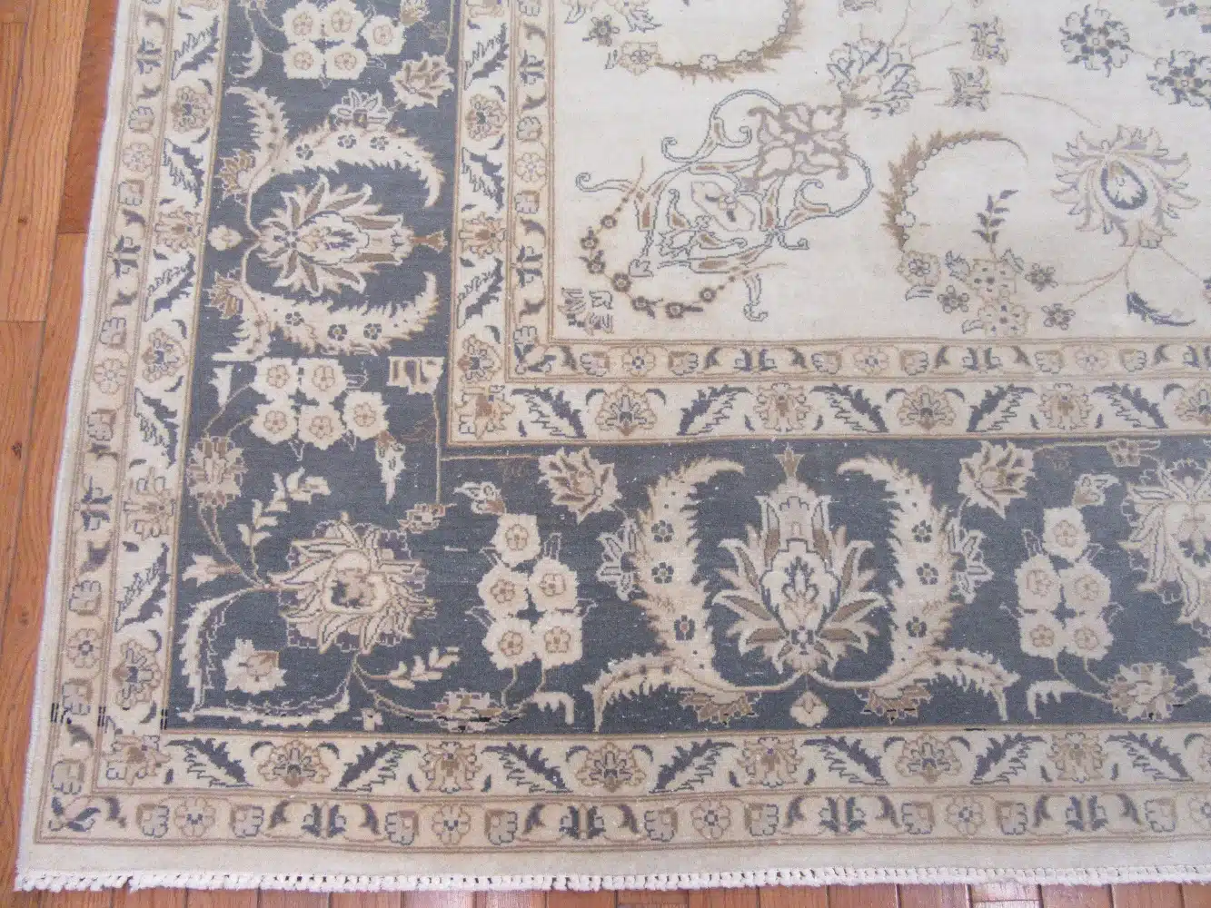 This large handmade oriental rug is crafted in Pakistan using a classic Persian Tabriz design, known for its refined floral patterns, balanced symmetry, and timeless elegance. The field features an allover arrangement of delicate floral rosettes, scrolling vines, and palmettes, creating a soft and harmonious visual rhythm across the surface of the rug.
