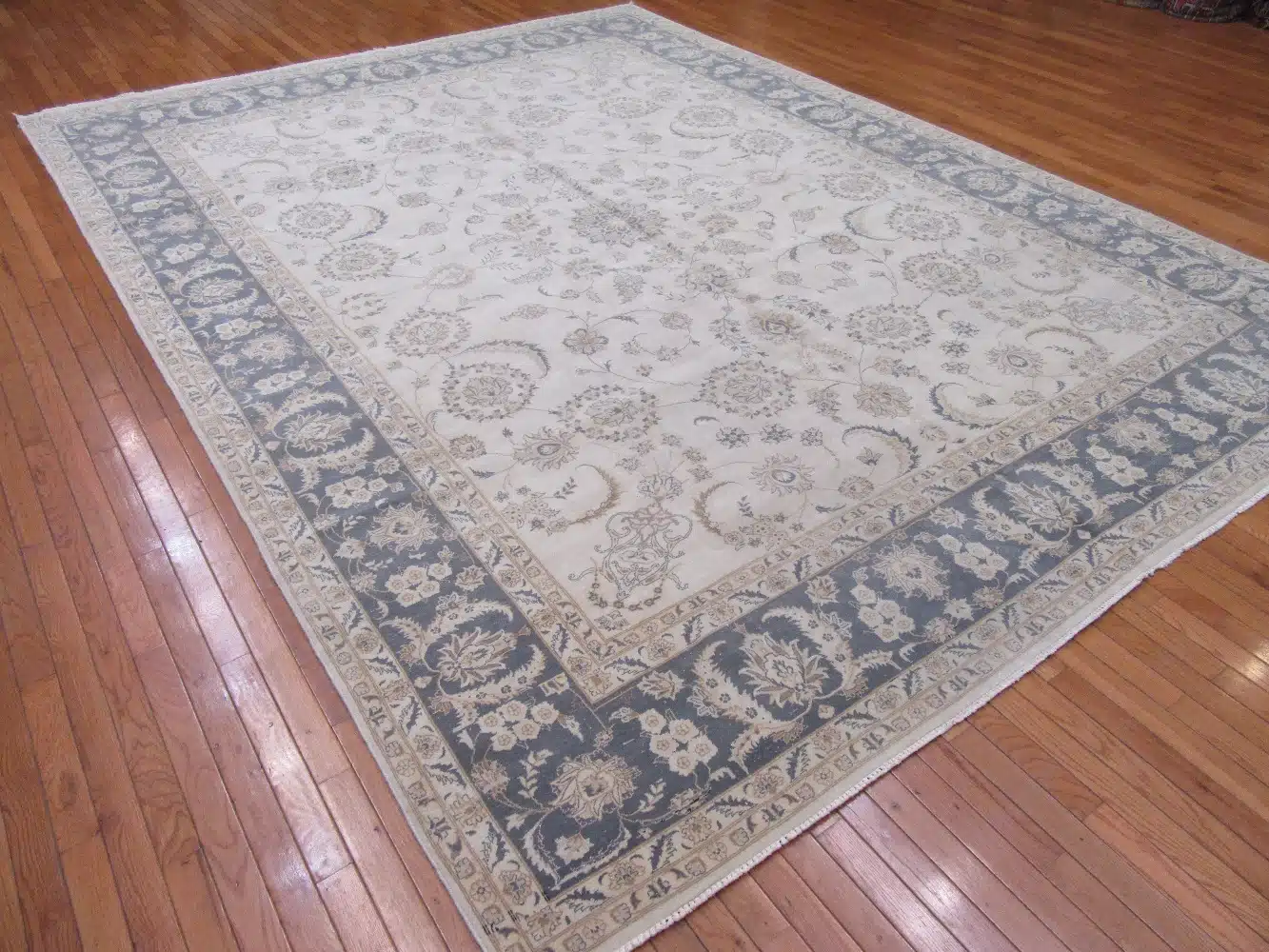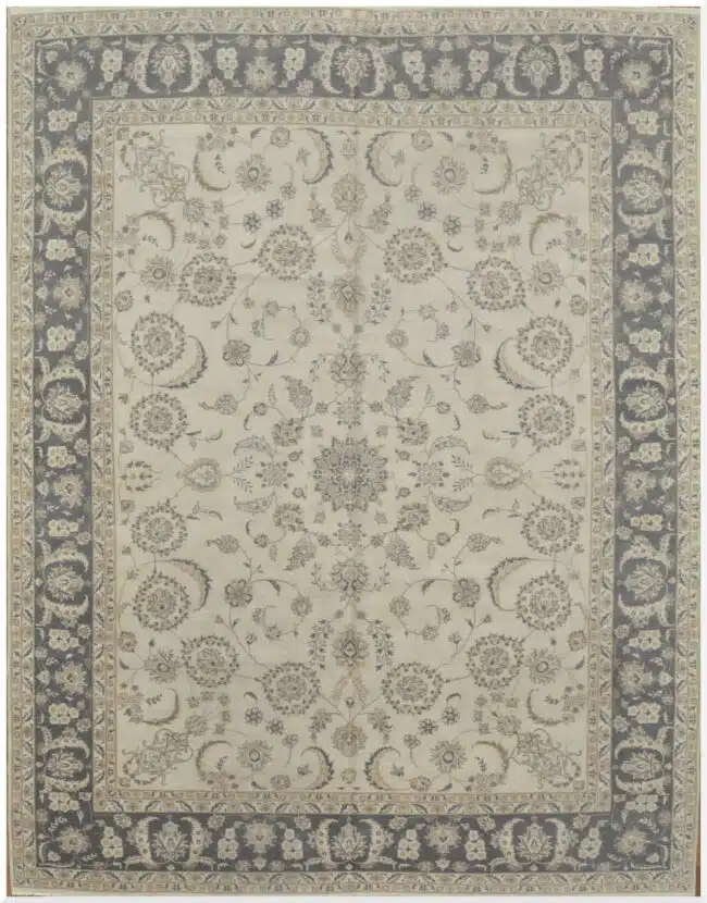 The ivory background provides a light, airy foundation, allowing the soft blue and slate gray motifs to stand out with subtle contrast. The wide border frames the field beautifully, echoing the interior floral elements and adding structure and definition without overpowering the design.