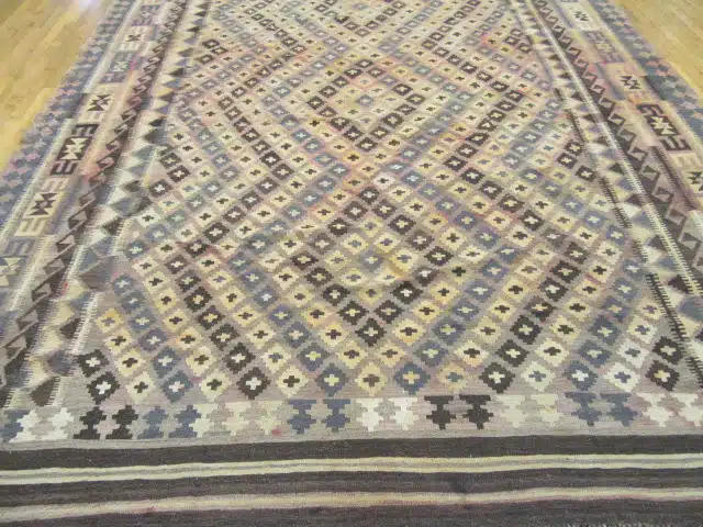 A large vintage Afghan kilim rug featuring a tribal geometric diamond pattern in soft beige tones. Flatwoven, lightweight, and ideal for expansive living or dining spaces. Read the full description to learn more.