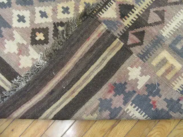 As a kilim, this rug is flatwoven rather than knotted, resulting in a lightweight yet durable construction that works especially well in large open spaces, dining areas, or long rooms where texture and pattern are desired without heaviness.