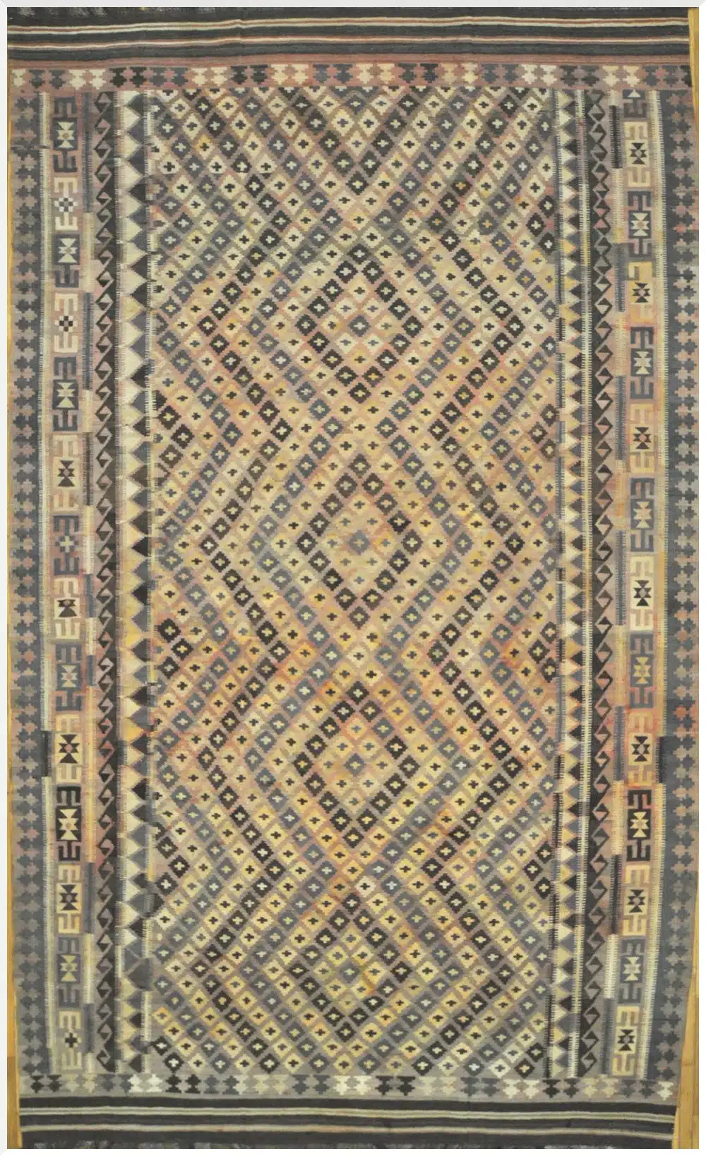 This vintage Afghan kilim rug is a large-scale tribal flatweave featuring an all-over geometric diamond pattern arranged in balanced vertical symmetry.