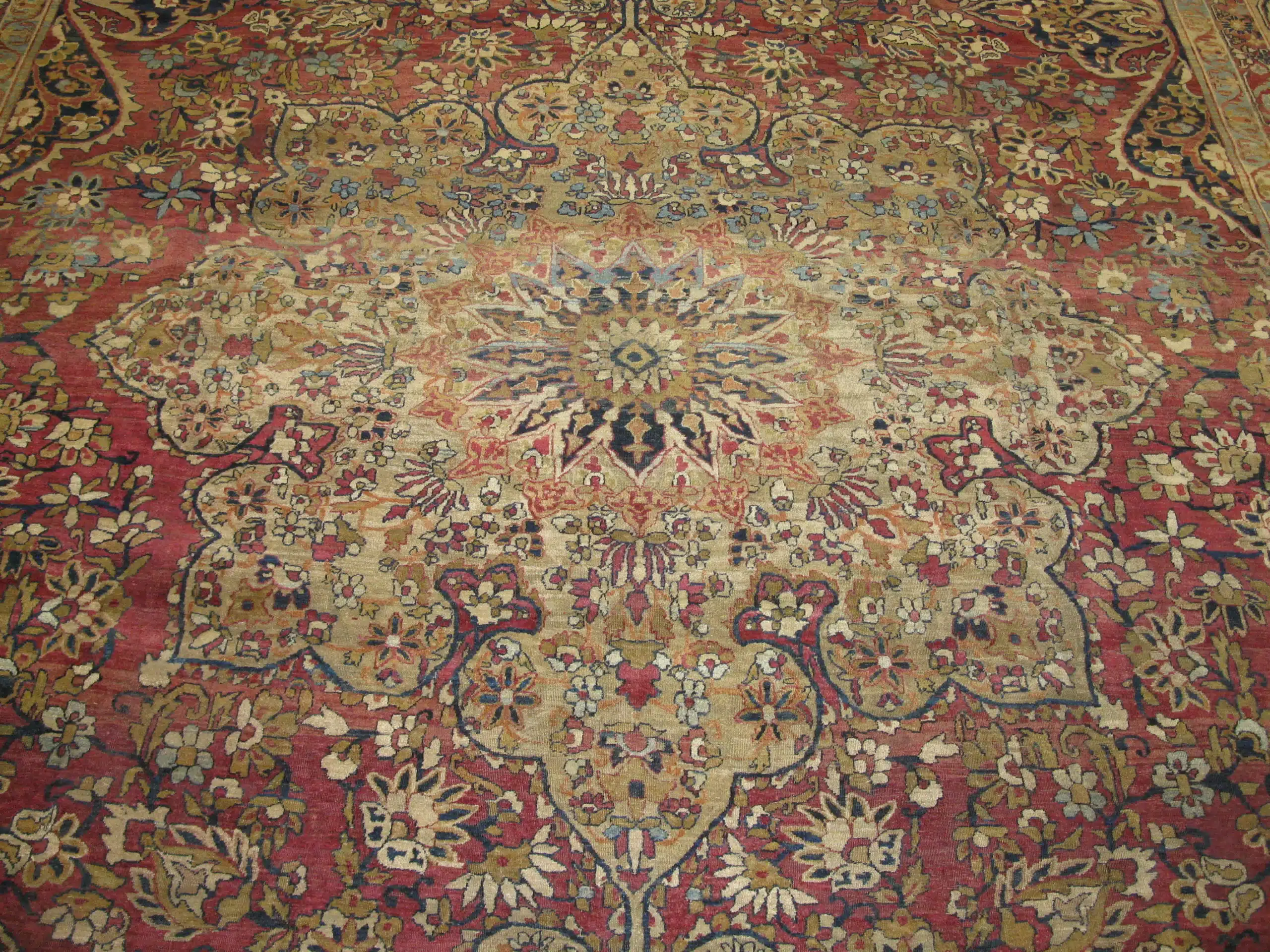 The composition is centered around a sophisticated floral medallion, radiating outward into an exquisitely detailed field filled with scrolling vines, blossoms, and delicate arabesques. The design is framed by a richly layered border that enhances the rug’s balance and visual depth without overpowering the central composition.