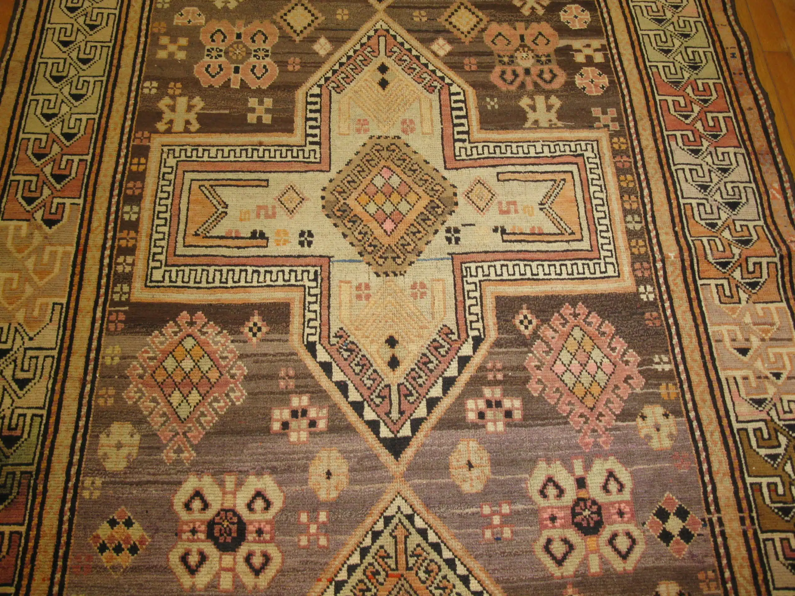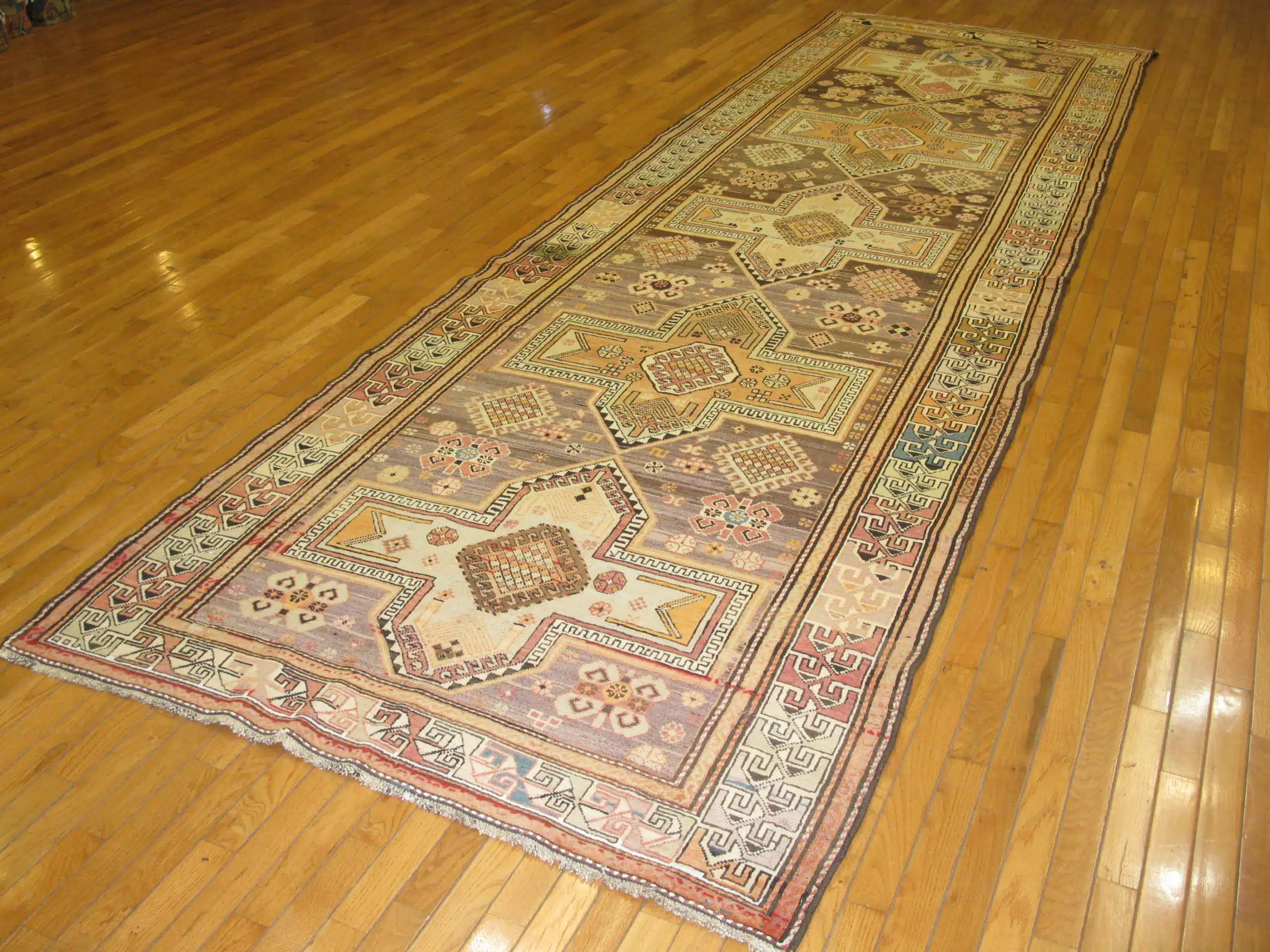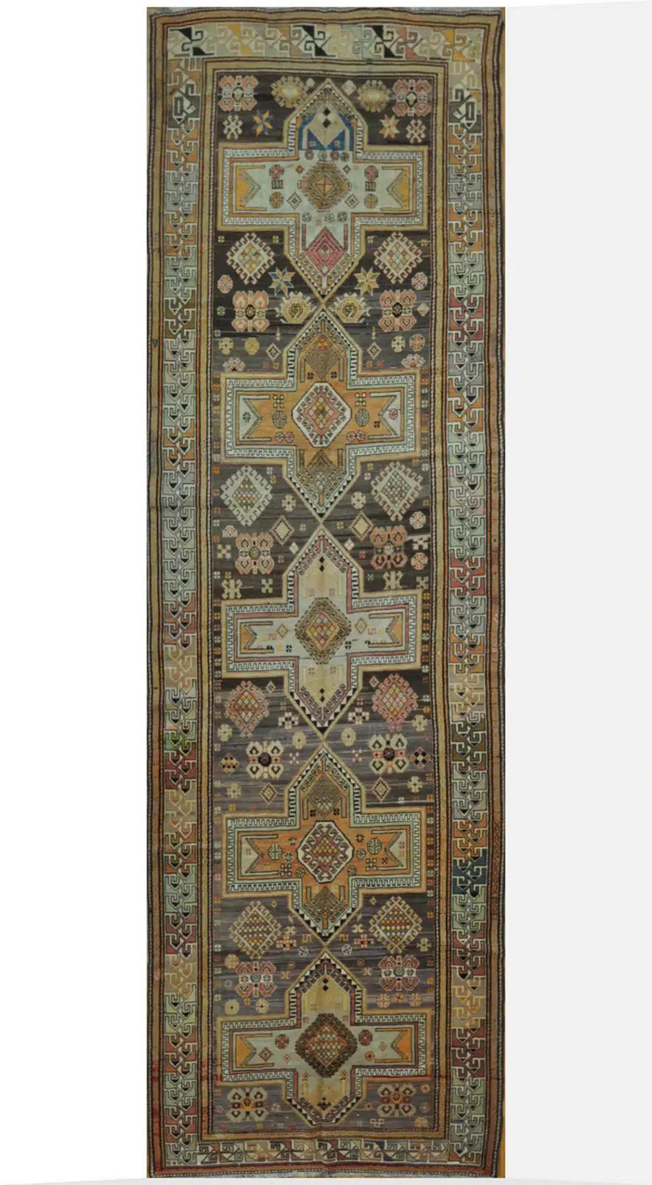 This antique Caucasian Kazak runner dates to the early 20th century and reflects the powerful nomadic weaving traditions of the Caucasus region. The elongated composition is defined by stacked geometric medallions, angular motifs, and tribal symbolism that emphasize balance, rhythm, and strength.