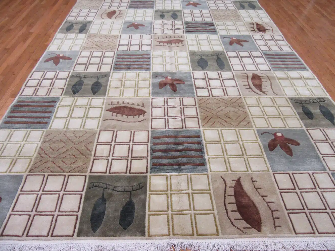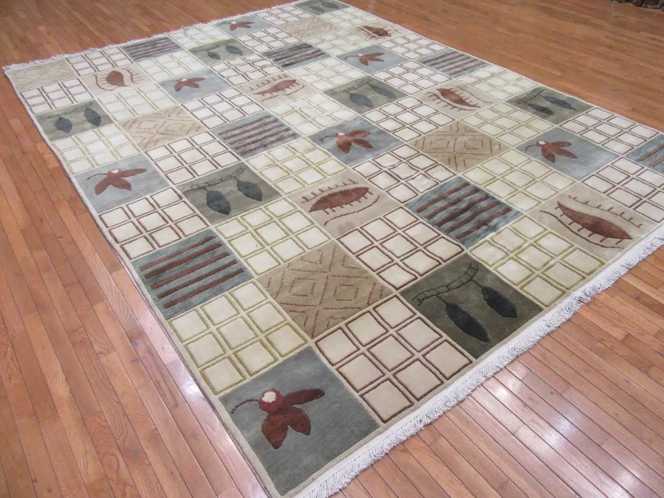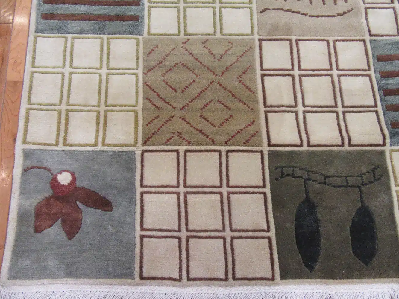 Hand knotted in India using quality wool, the rug blends modern design sensibilities with traditional craftsmanship. The muted color palette of soft greens, beiges, and charcoal tones gives the piece a refined, understated presence that works effortlessly in contemporary interiors.