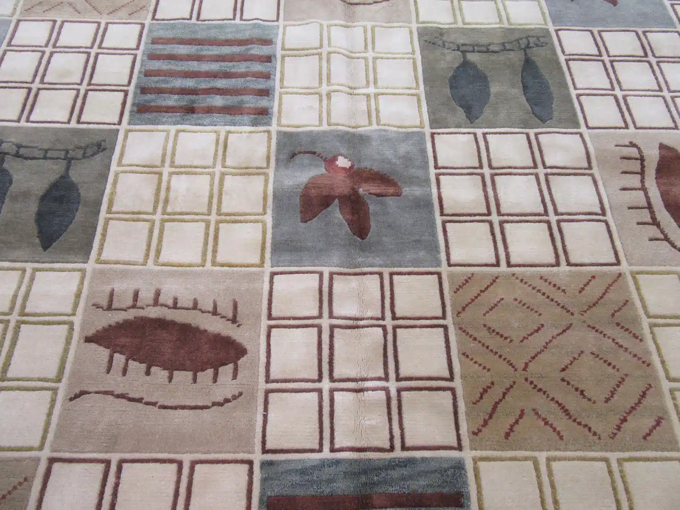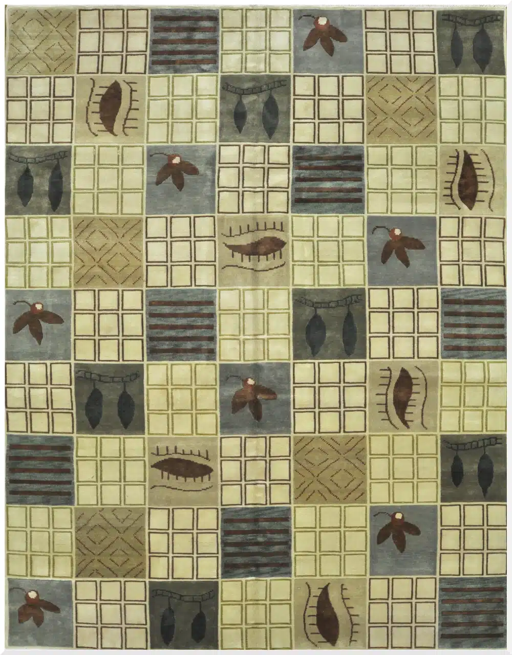 This modern handmade Oriental rug features a distinctive grid-based composition filled with abstract botanical and geometric motifs. The balanced arrangement of squares creates a calm, architectural rhythm, while subtle organic elements introduce warmth and visual interest.