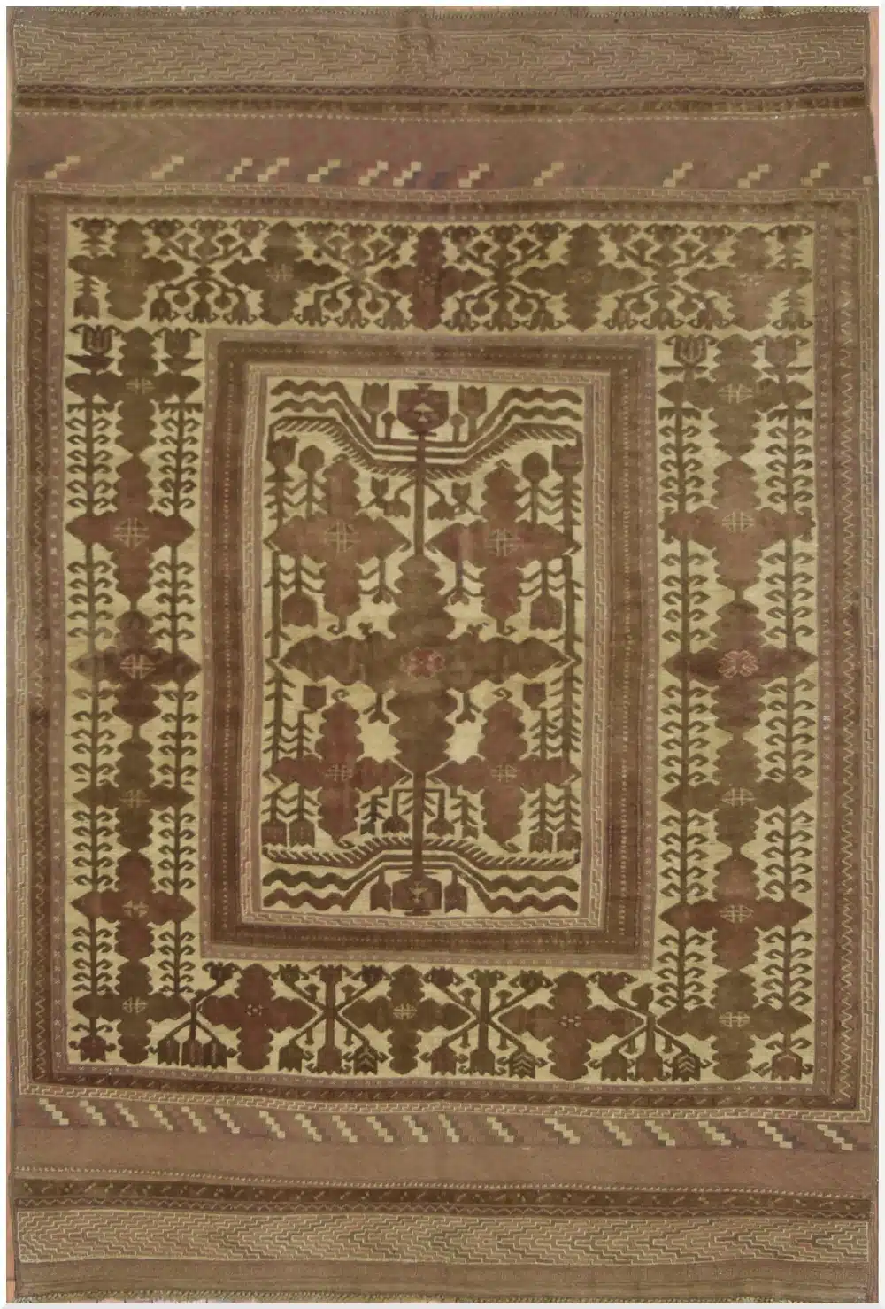 This handmade oriental rug features a traditional, nature-inspired design woven in a calming palette of warm beige and earthy brown tones. The central field is framed by layered borders filled with stylized botanical and tribal motifs, creating a balanced and grounded composition.