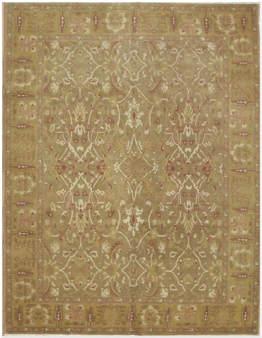 This new fine handmade Oriental rug features a classic symmetrical layout with a large central medallion surrounded by flowing vines, lotus flowers, and delicate palmettes across a warm gold field. The design is detailed yet open, with corner spandrels mirroring the center and wide borders filled with repeating floral garlands and geometric elements in soft pink and ivory. The overall effect is elegant and inviting with gentle color harmony.