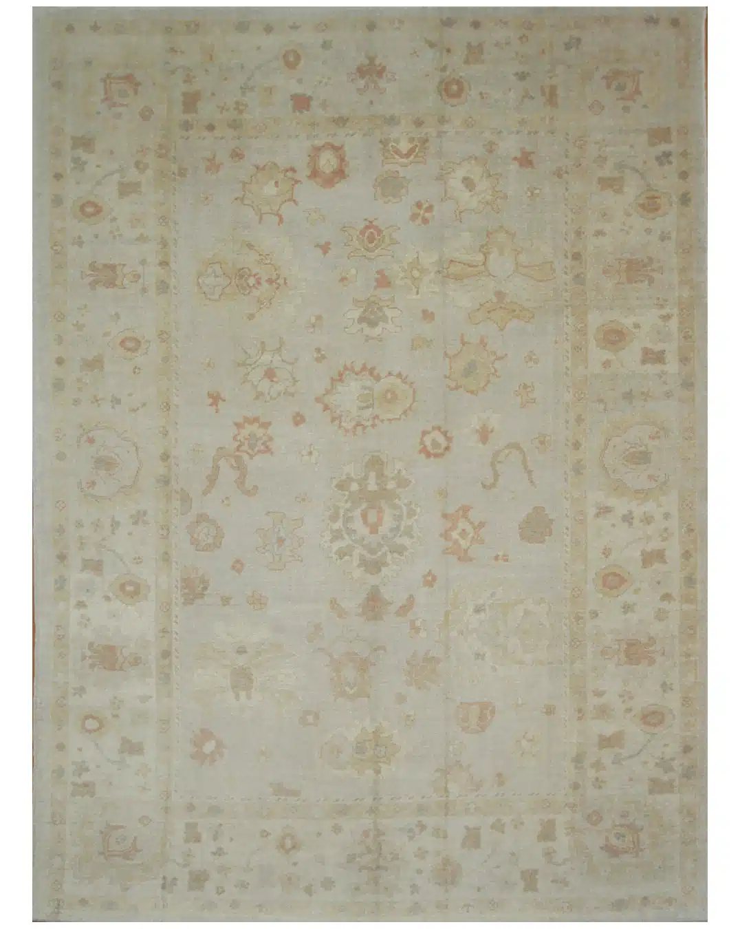 Modern Oushak rugs capture the timeless appeal of antique versions using lighter palettes and more open layouts, blending traditional Turkish motifs with contemporary softness. Hand-knotted in wool with good density, these pieces offer a plush texture and gentle fading that mimics vintage charm. This large example’s neutral tones and refined details provide a versatile, timeless foundation.