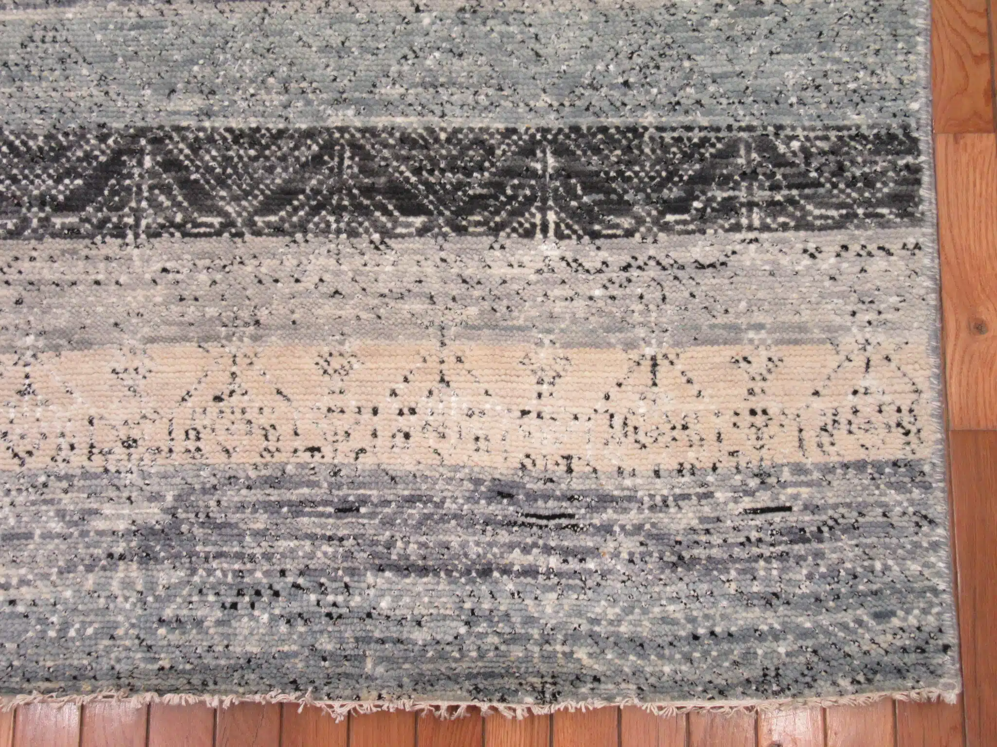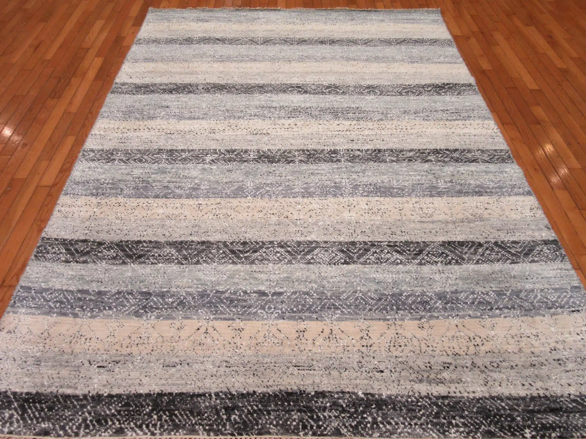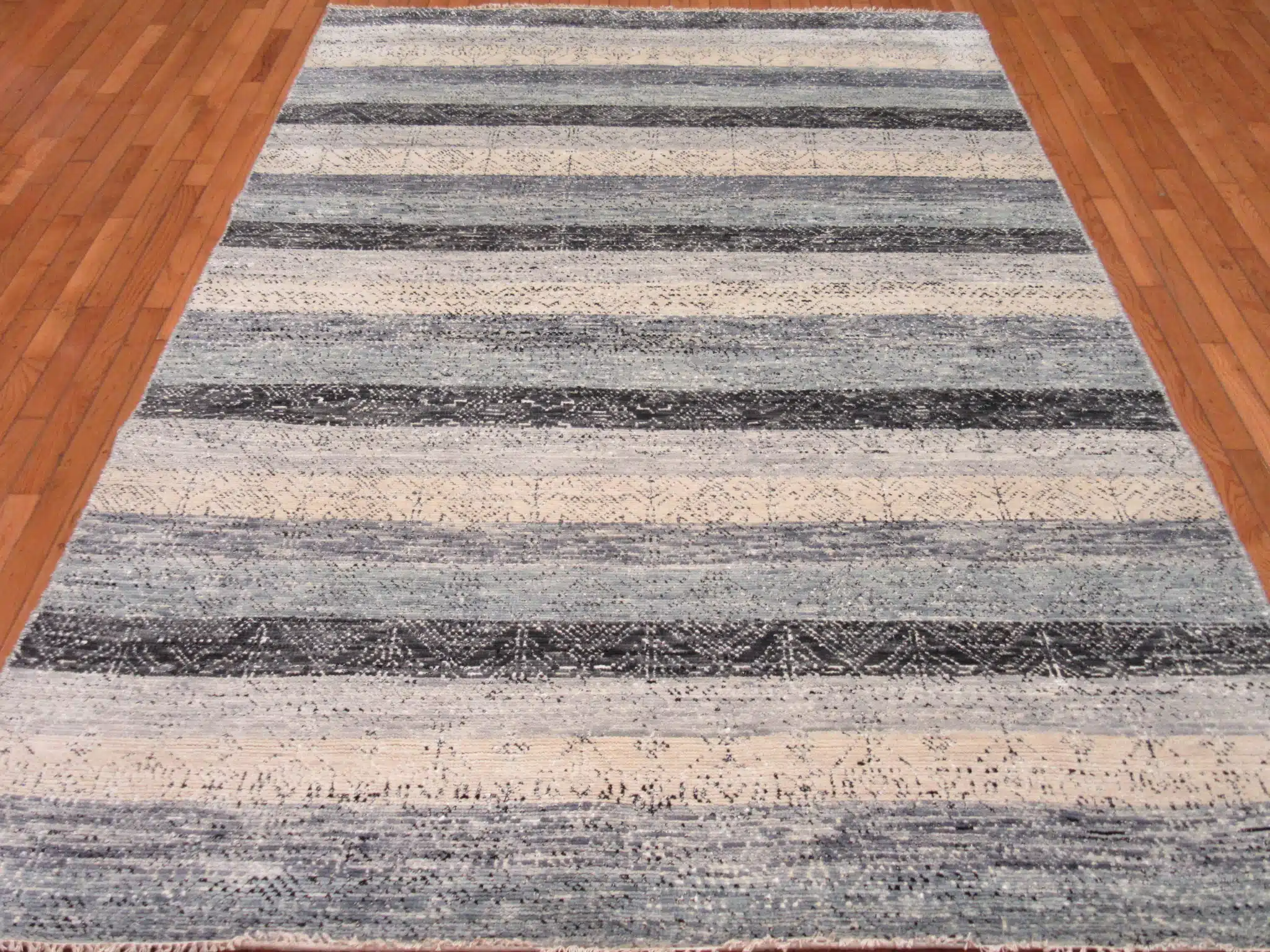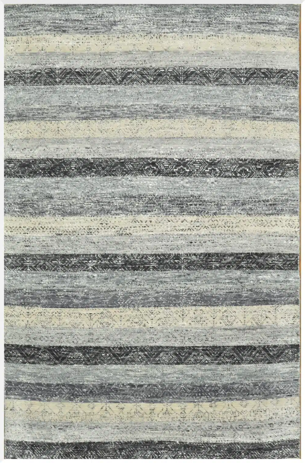 This modern Indian rug features horizontal banded stripes layered in soft neutrals that create depth, movement, and visual harmony. The calming blend of charcoal, gray, and ivory invites warmth while maintaining a clean, contemporary aesthetic.