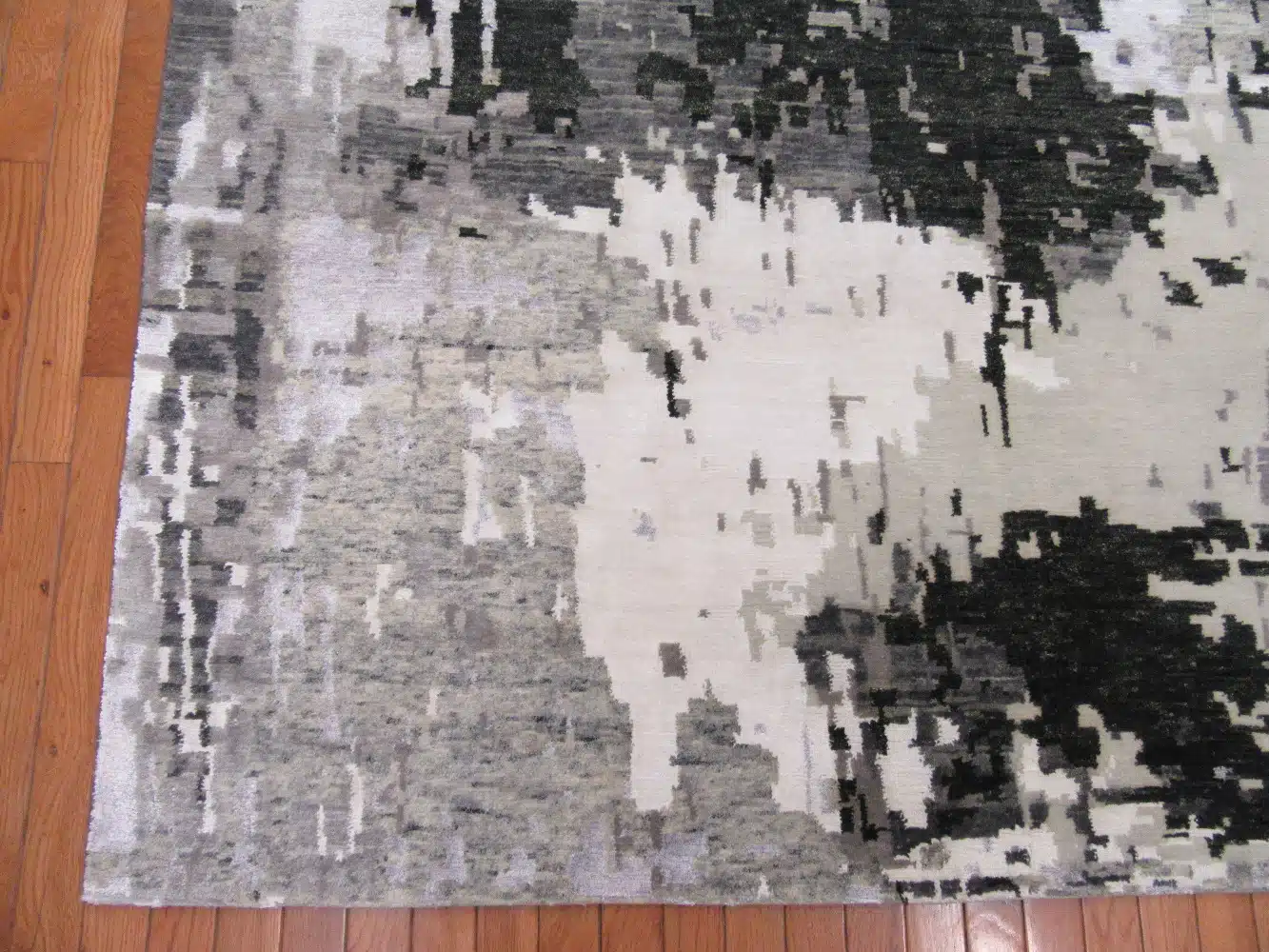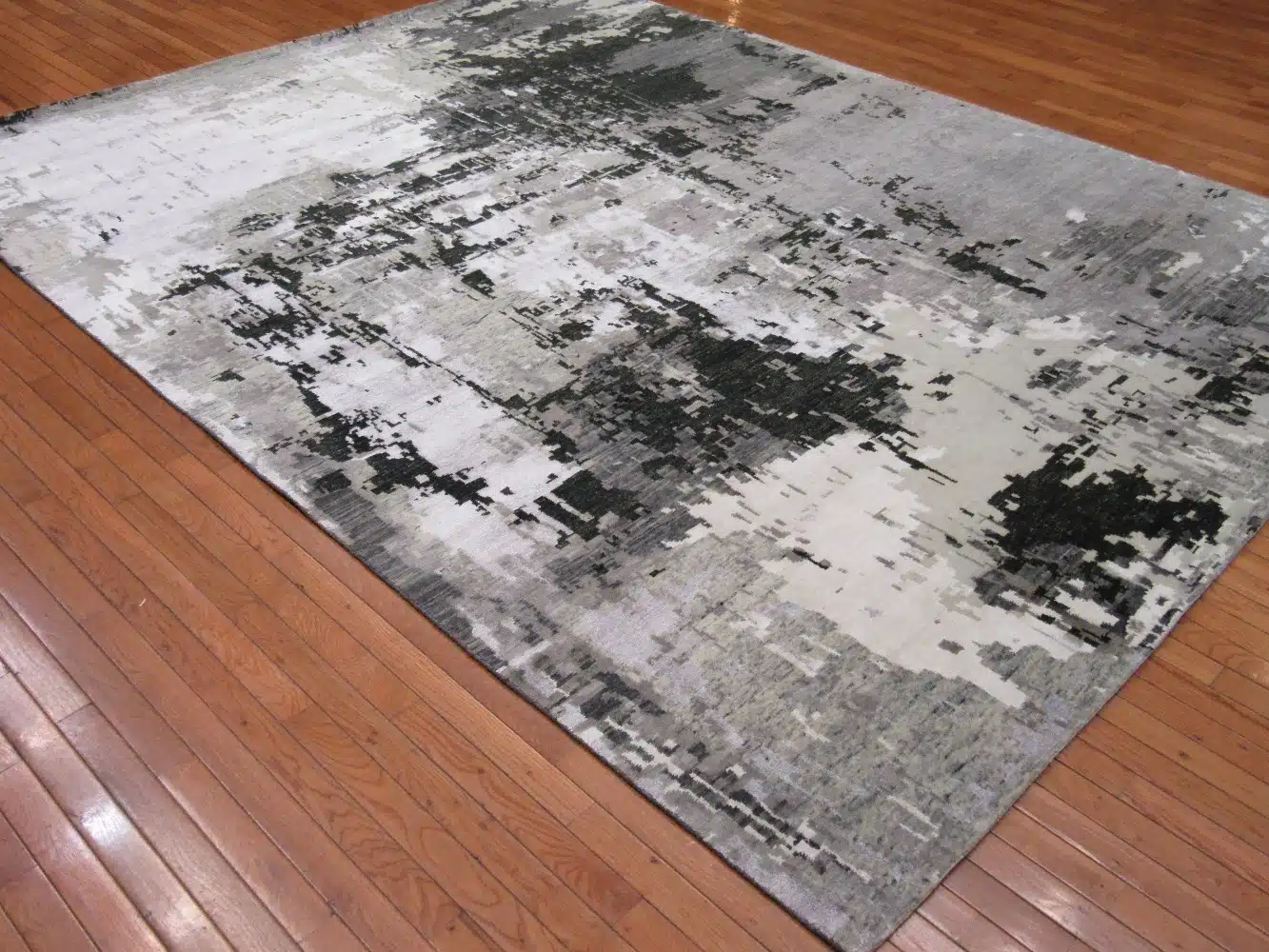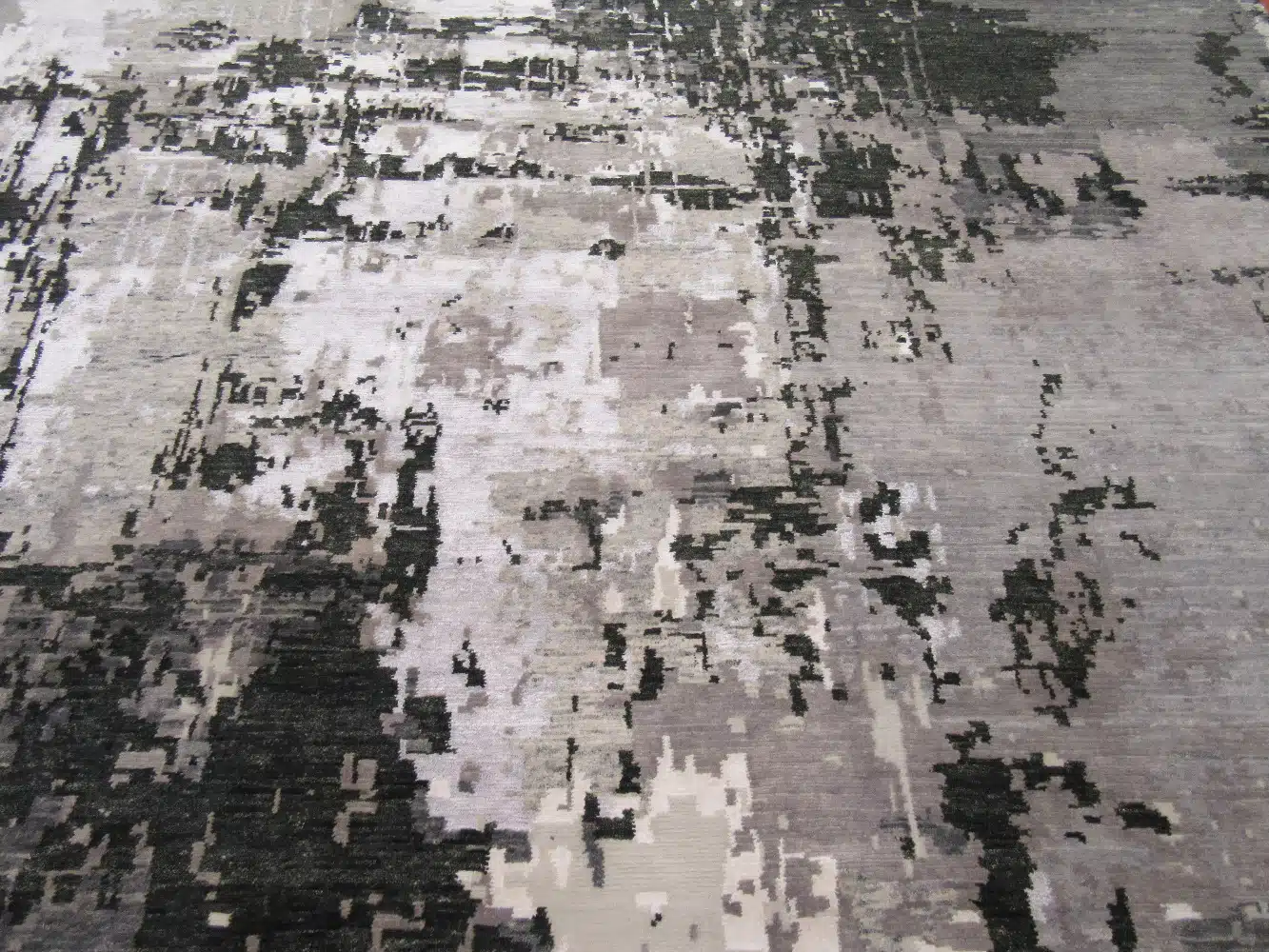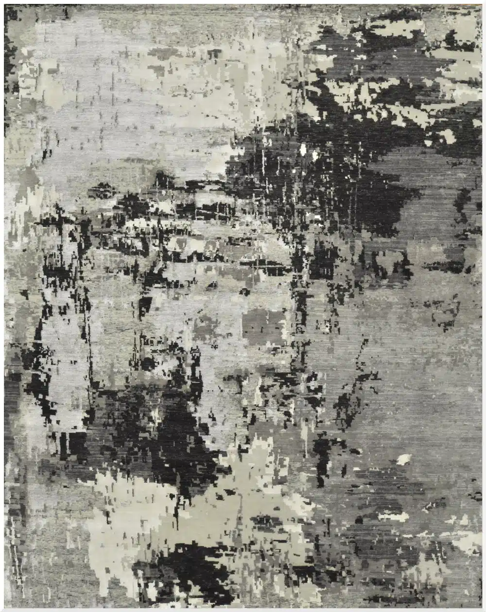 This new handmade Indian modern design rug presents an abstract, layered pattern with soft brushstroke textures and mottled color blending across the field. The design creates a distressed, artistic effect with overlapping grey tones transitioning into beige and charcoal areas, giving it a sophisticated, painterly appearance. The subtle variations and irregular edges evoke a contemporary abstract painting while maintaining the quality of traditional hand-knotting.