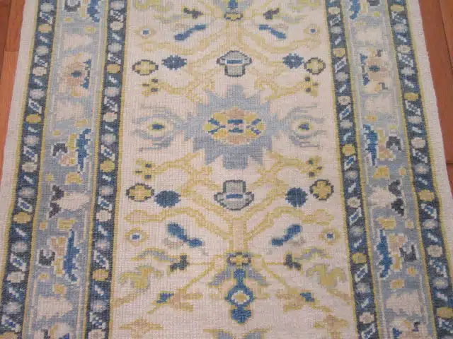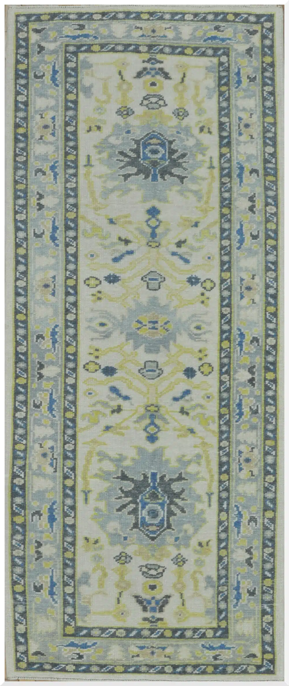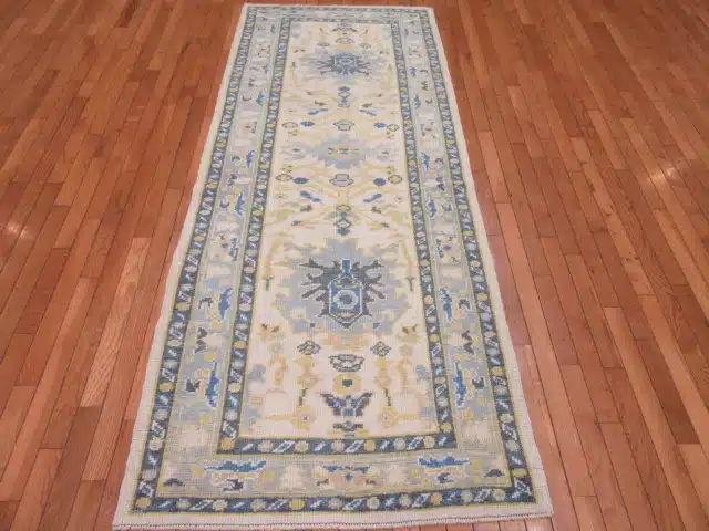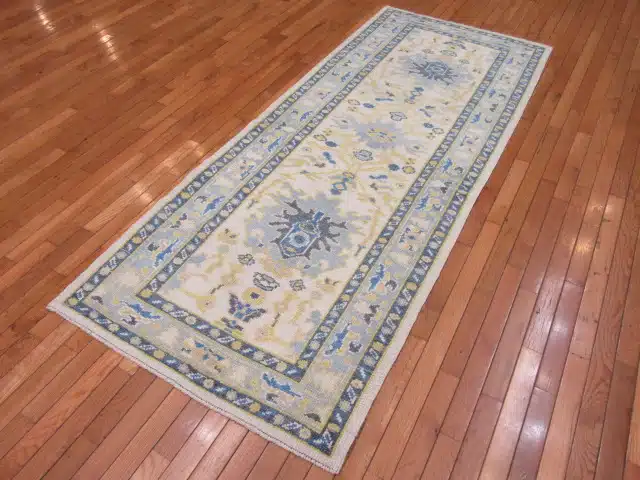 Oushak rugs from western Turkey are known for their large-scale, open designs and soft natural palettes since the Ottoman period. This contemporary runner version maintains the classic style using fine hand-knotting and wool, offering timeless elegance with practical proportions for hallways and corridors, while achieving consistent quality and durability.