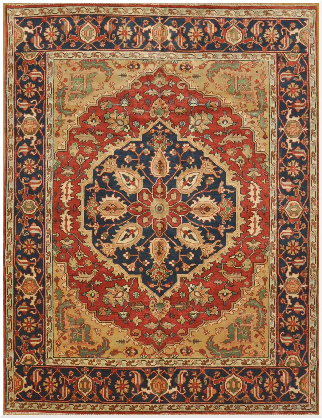 This new hand-knotted rug from India draws inspiration from classic Persian Serapi designs, featuring a large central medallion on a rich red field. The medallion is filled with intricate floral and vine patterns in navy, cream, and gold, creating a balanced and symmetrical composition. A wide navy border with repeating palmettes and corner spandrels frames the rug, adding depth and elegance to the overall look.
