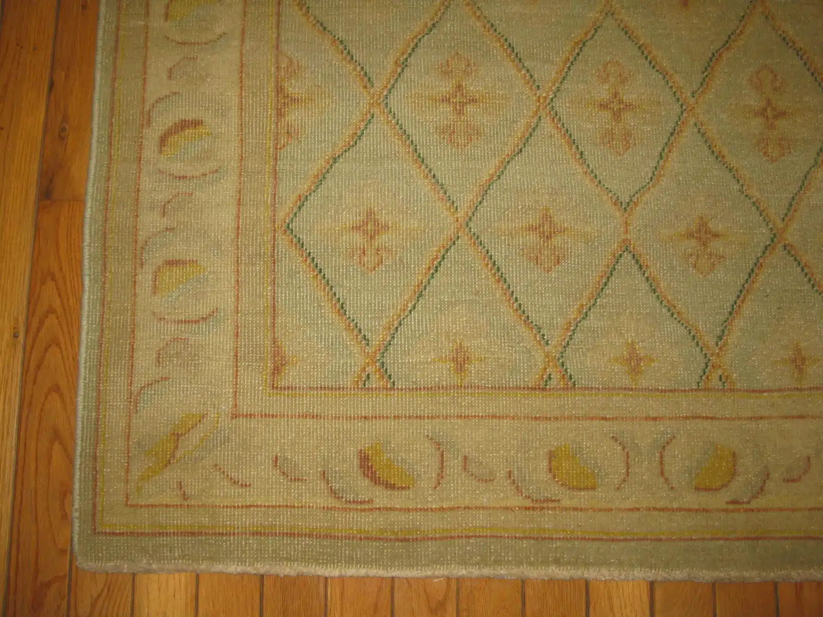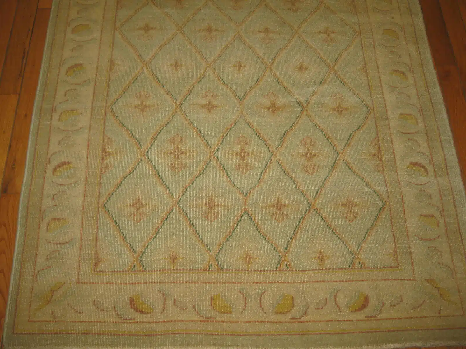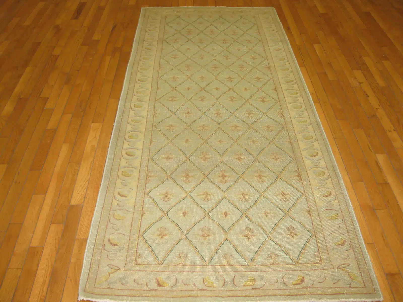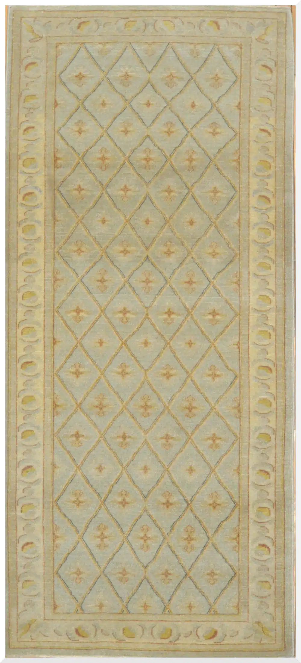 This new handmade Egyptian Agra runner rug features a repeating diamond lattice pattern filled with delicate floral motifs and small medallions along its length. The soft beige field is accented by warm terracotta and gold details, framed by wide borders with repeating vines and flowers. The open, symmetrical design and gentle color palette create a calm, classic appearance suitable for long narrow spaces.