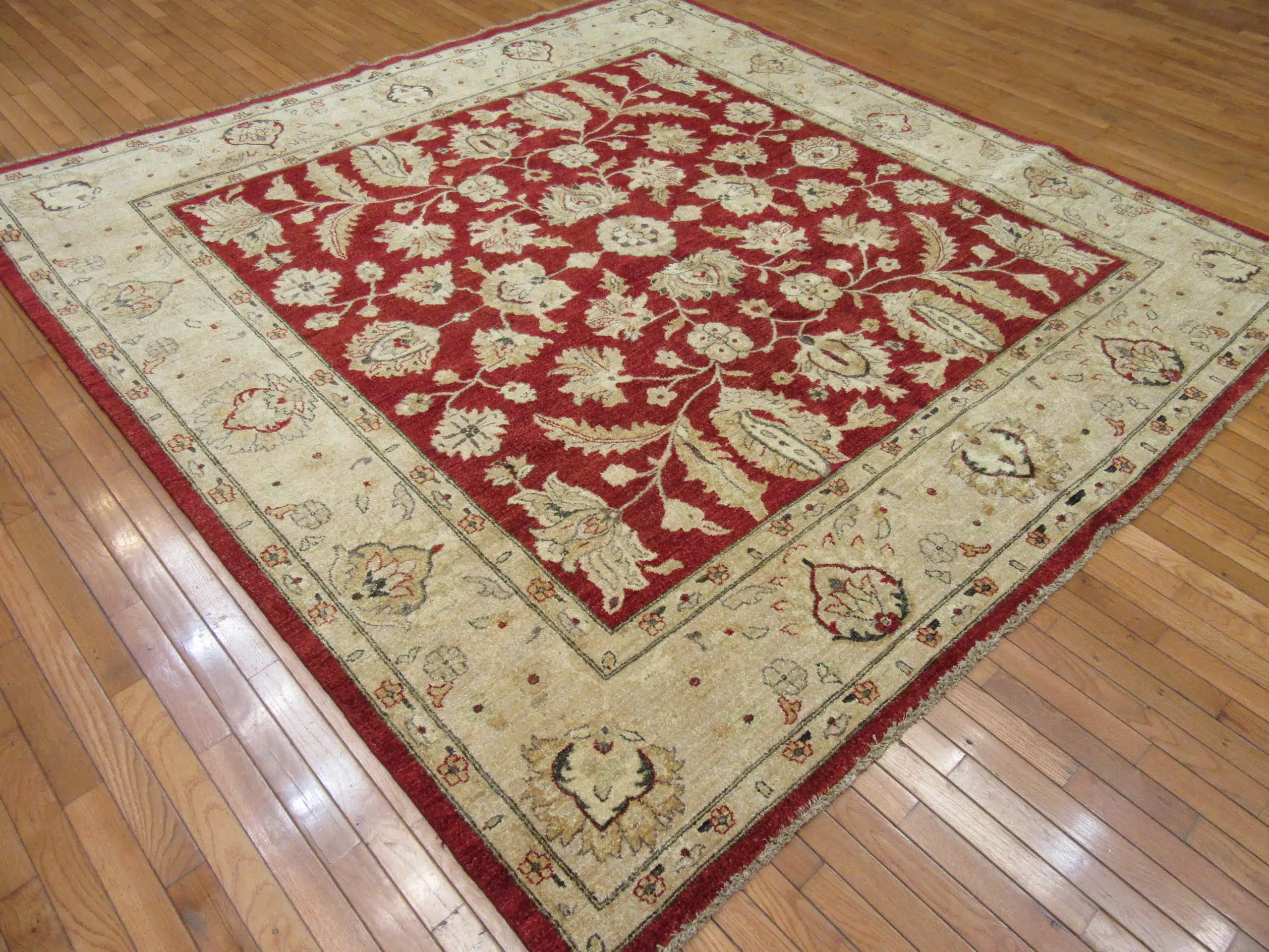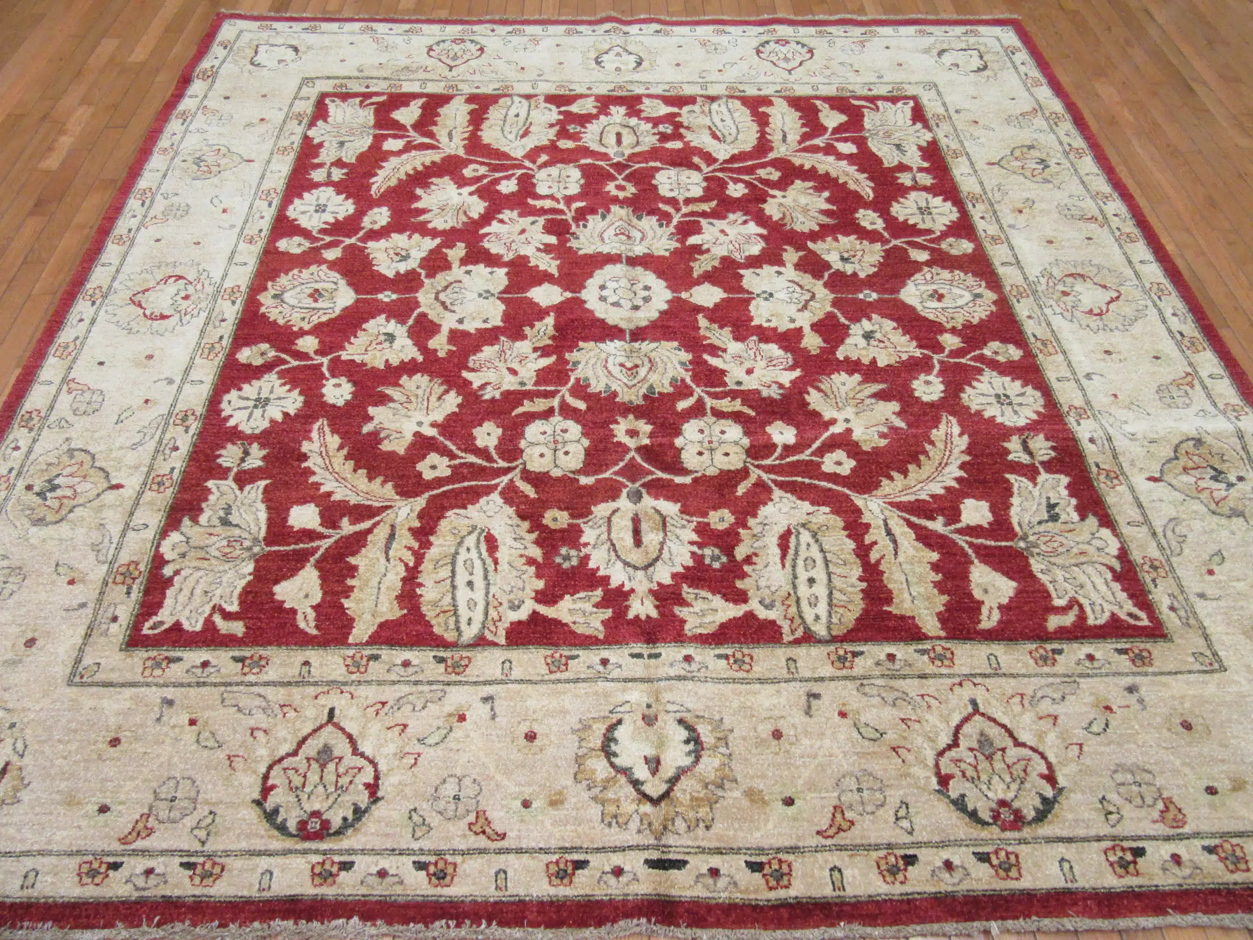 New hand knotted square Pakistani oriental rug with a deep red floral field and ivory border, crafted in wool and perfect for balanced living or dining spaces.