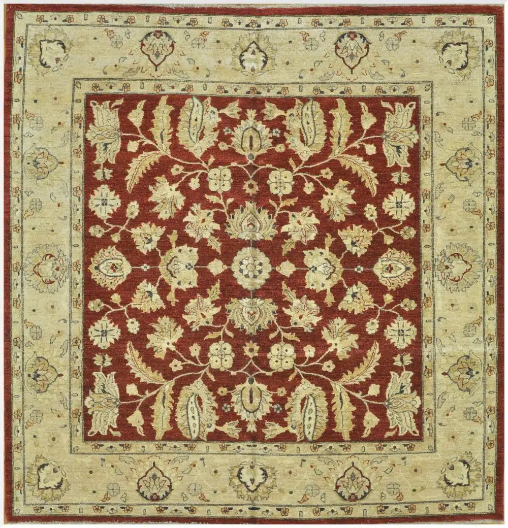 This new square handmade Pakistani oriental rug features a rich red field filled with an elegant all-over floral pattern, framed by a soft ivory border. The balanced square format and classic design give the rug a refined transitional character, blending traditional motifs with a clean, decorative layout.