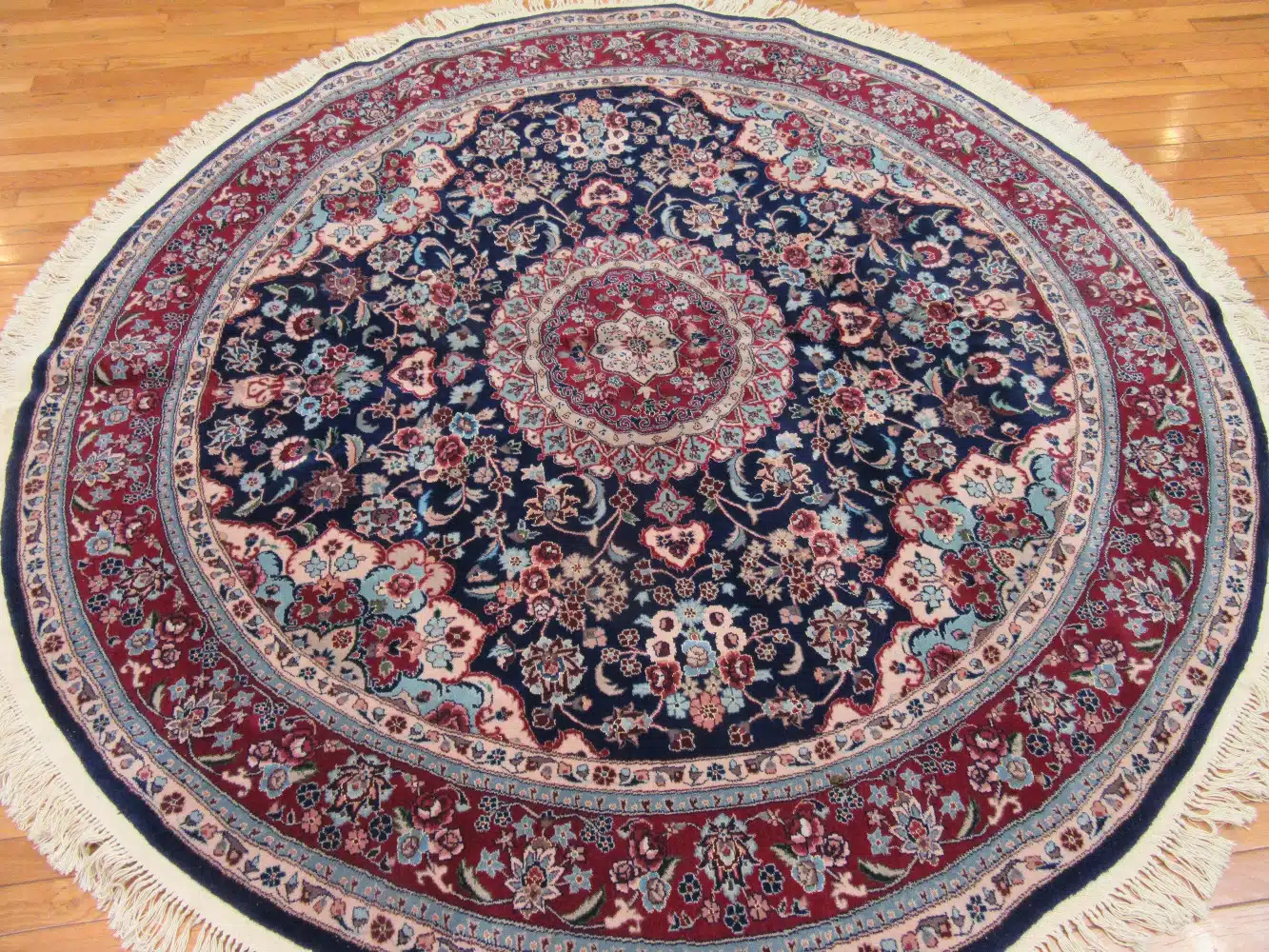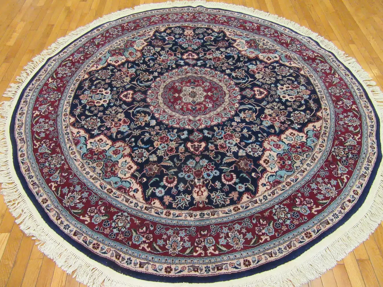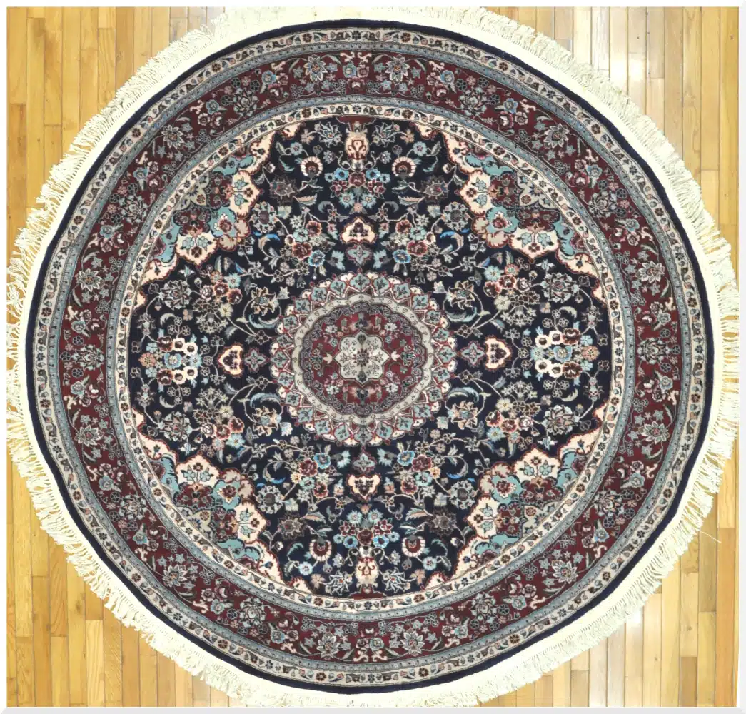 A 7-foot round rug like this one fits well under a round dining table, in an entry foyer, or as a centerpiece in a living room seating area. The deep navy color grounds the room while the lighter floral details bring warmth and movement. Wool construction means it resists wear, cleans easily, and maintains its appearance for many years.