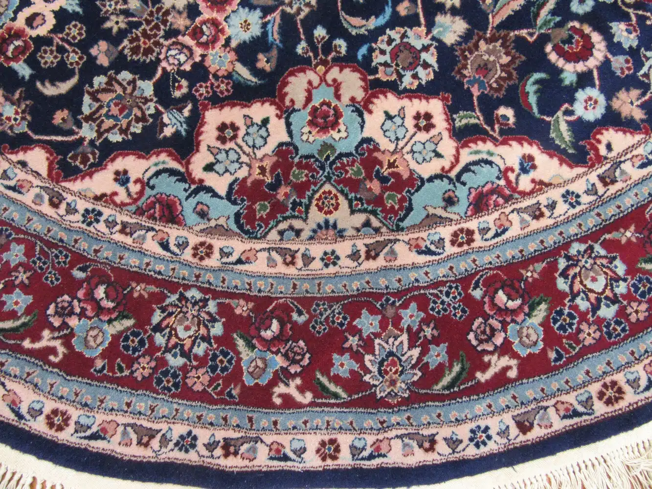 This handmade round Chinese Oriental rug displays a symmetrical central medallion surrounded by layers of floral scrolls, lotus flowers, and cloud-like motifs. The navy blue background provides a rich, elegant base while the multiple borders feature classic geometric and vine patterns in contrasting colors. The fringe around the edge adds a traditional finishing touch.