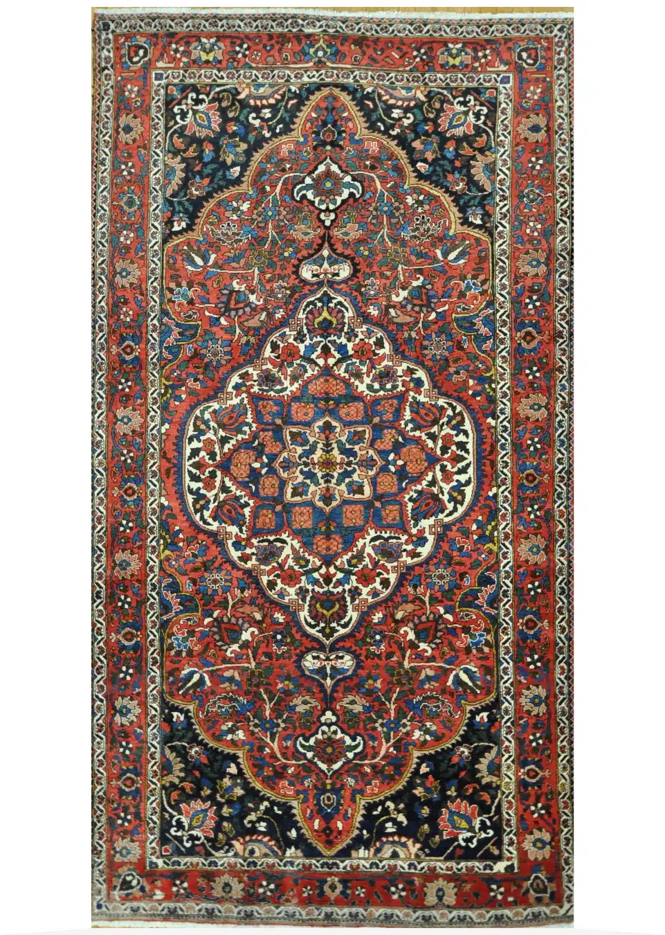 This semi-antique Persian Bakhtiari rug showcases a classic all-over garden design with a central medallion and intricate floral vines on a vibrant red field. The large diamond-shaped medallion is filled with detailed geometric and floral elements in navy, cream, and turquoise, surrounded by repeating flower motifs and stylized leaves that create a lush, garden-like feel. A wide navy border with corner spandrels and continuous floral patterns completes the balanced composition.