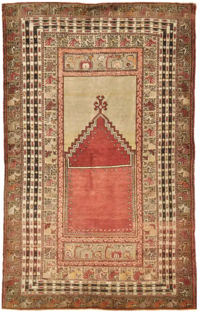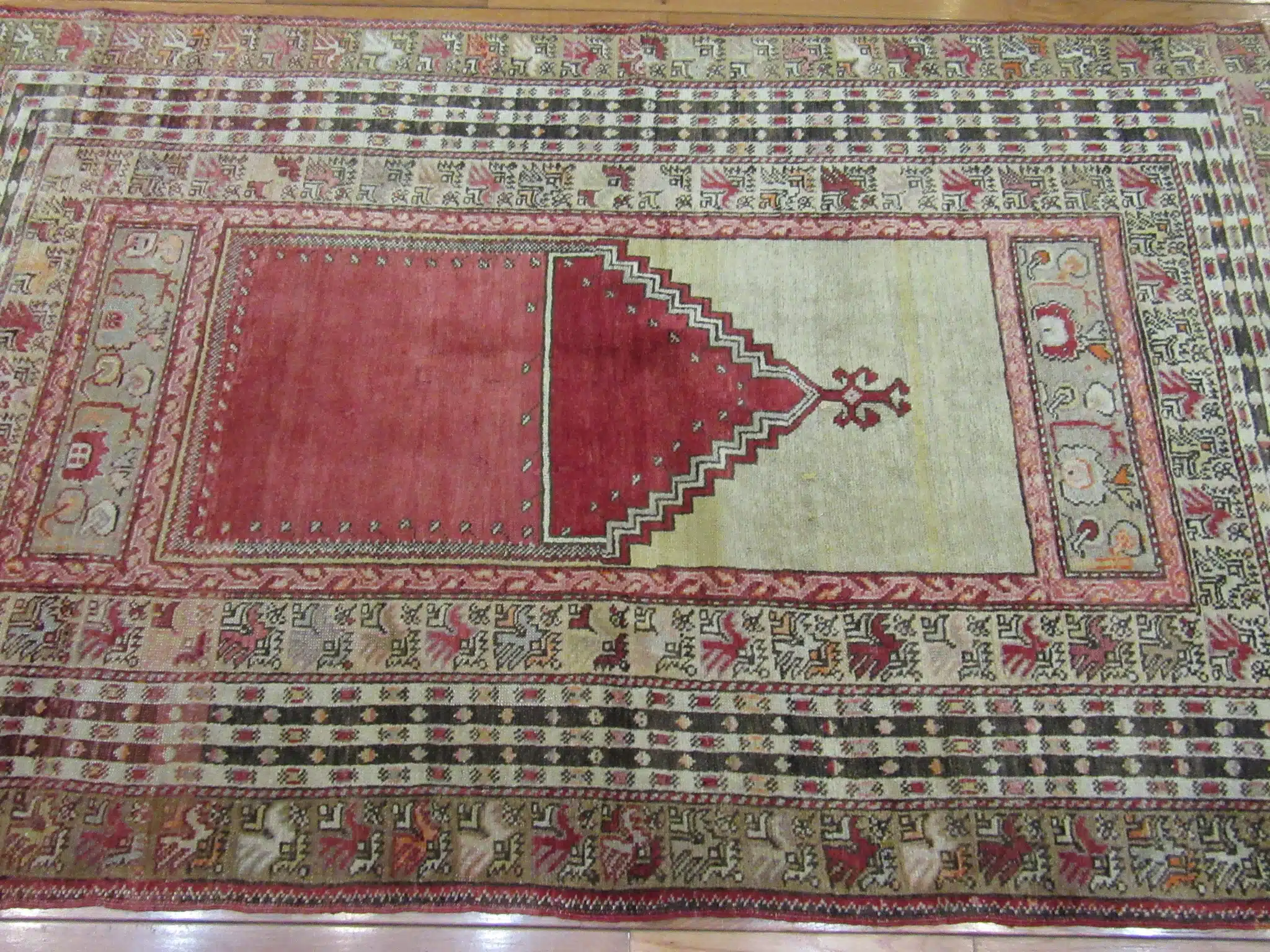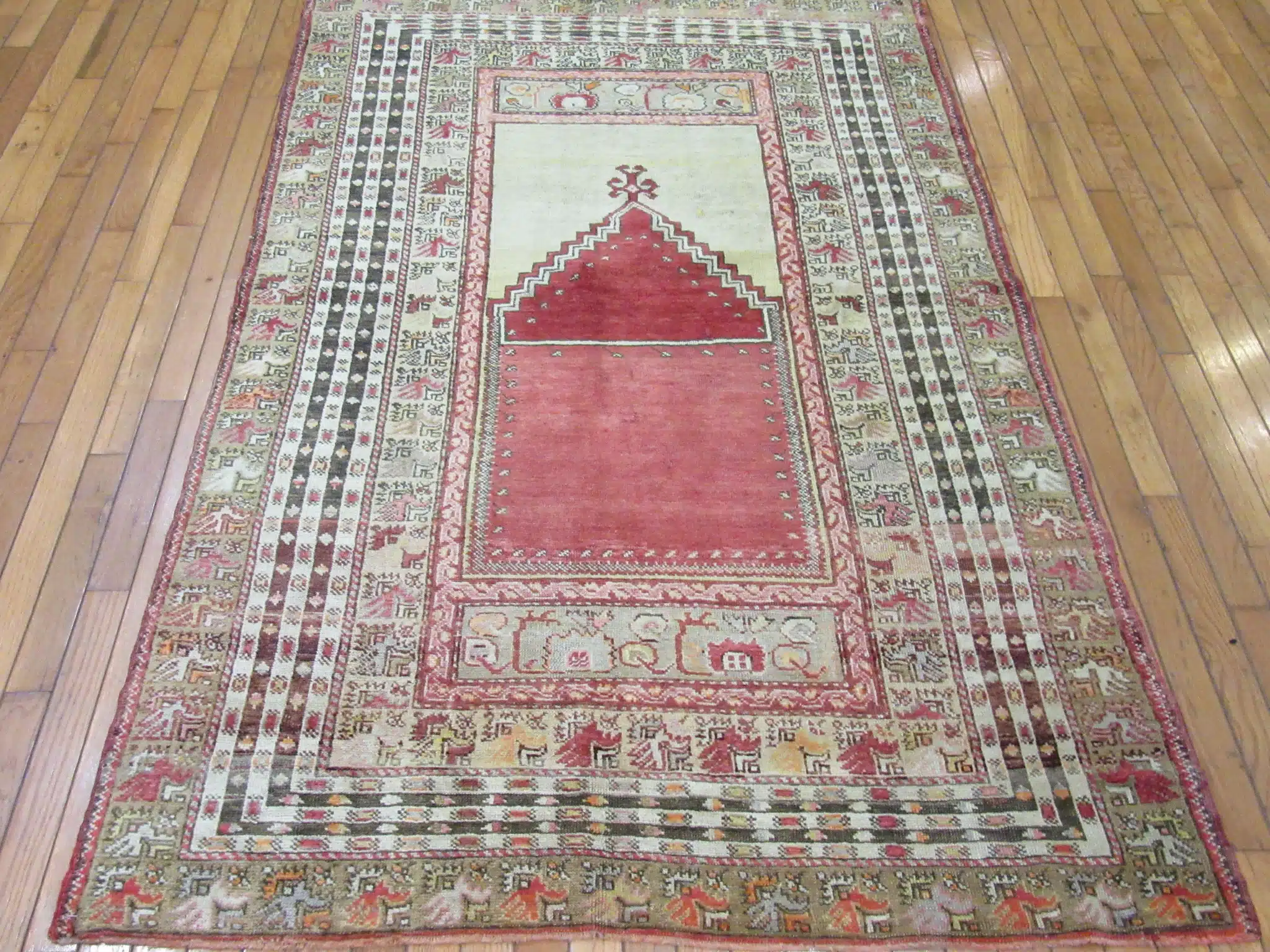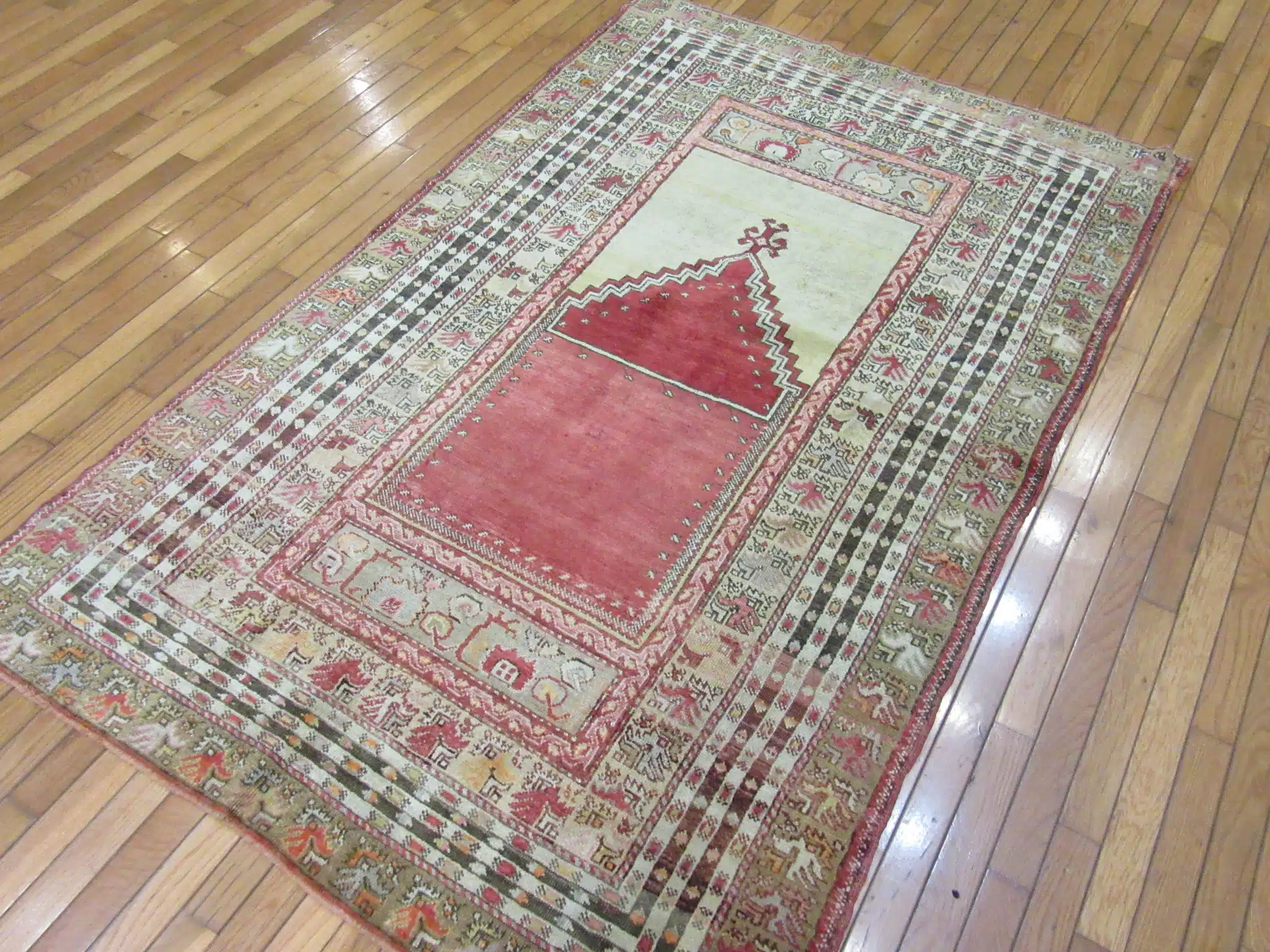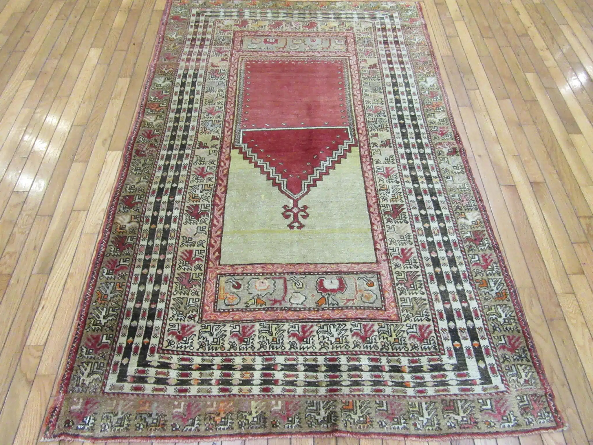 This is a finely hand-knotted traditional Turkish rug with a Mehrab design pattern. It is made with 100% Fine quality wool pile on wool foundation. It is in great condition.