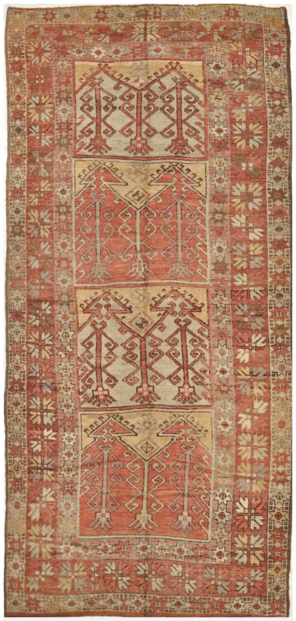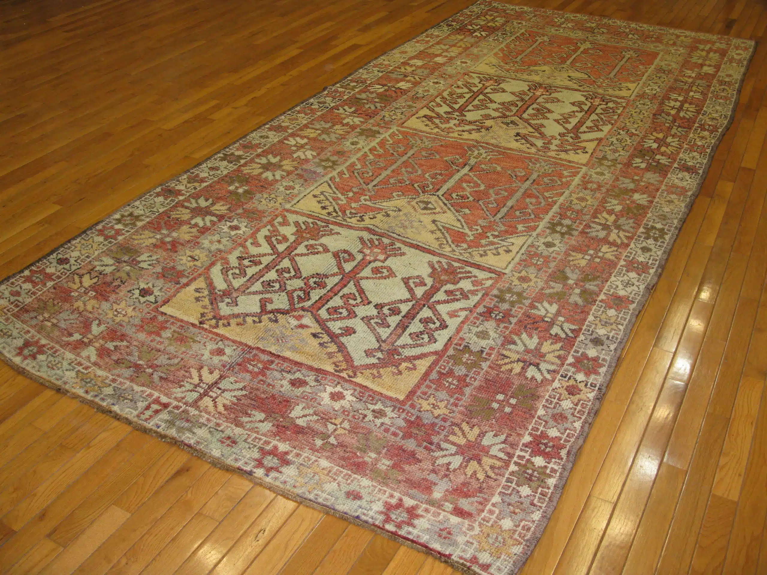 This semi-antique Turkish gallery runner presents a distinctive stacked four-panel composition, a design format traditionally associated with architectural balance and rhythmic repetition. Each panel is framed with angular tribal motifs, creating a strong vertical flow ideal for elongated spaces such as hallways or galleries.