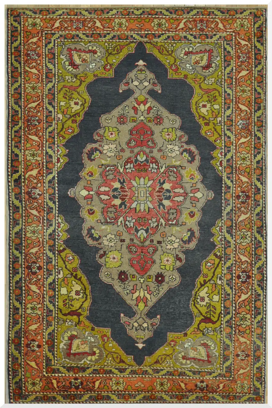 This vintage Turkish rug features a rich navy blue open field with a detailed central medallion in terracotta red, golden yellow, and sage accents, framed by intricate geometric borders. Hand-knotted in wool with vegetable dyes, it offers timeless traditional beauty in excellent condition. See the long description for more details.