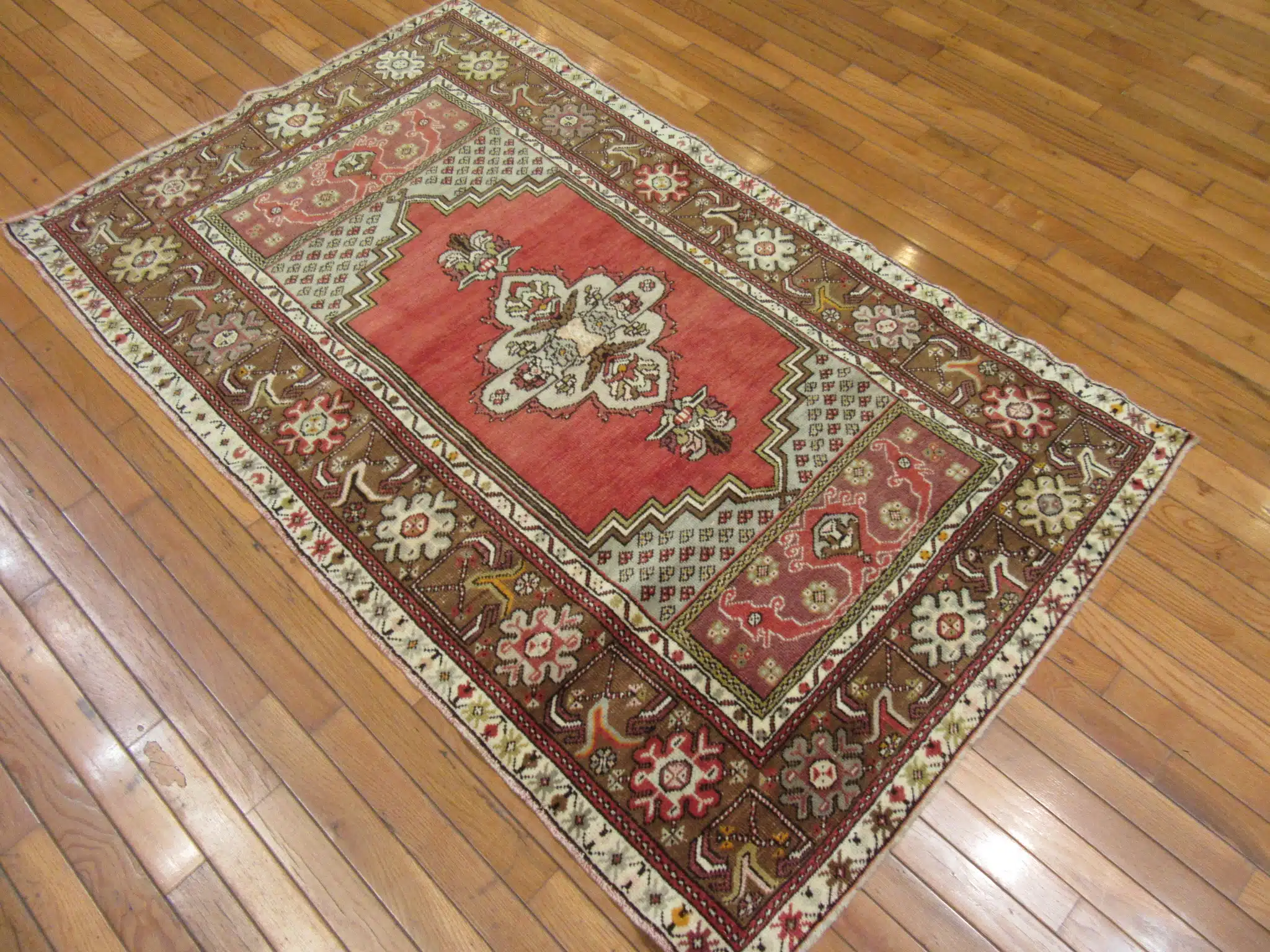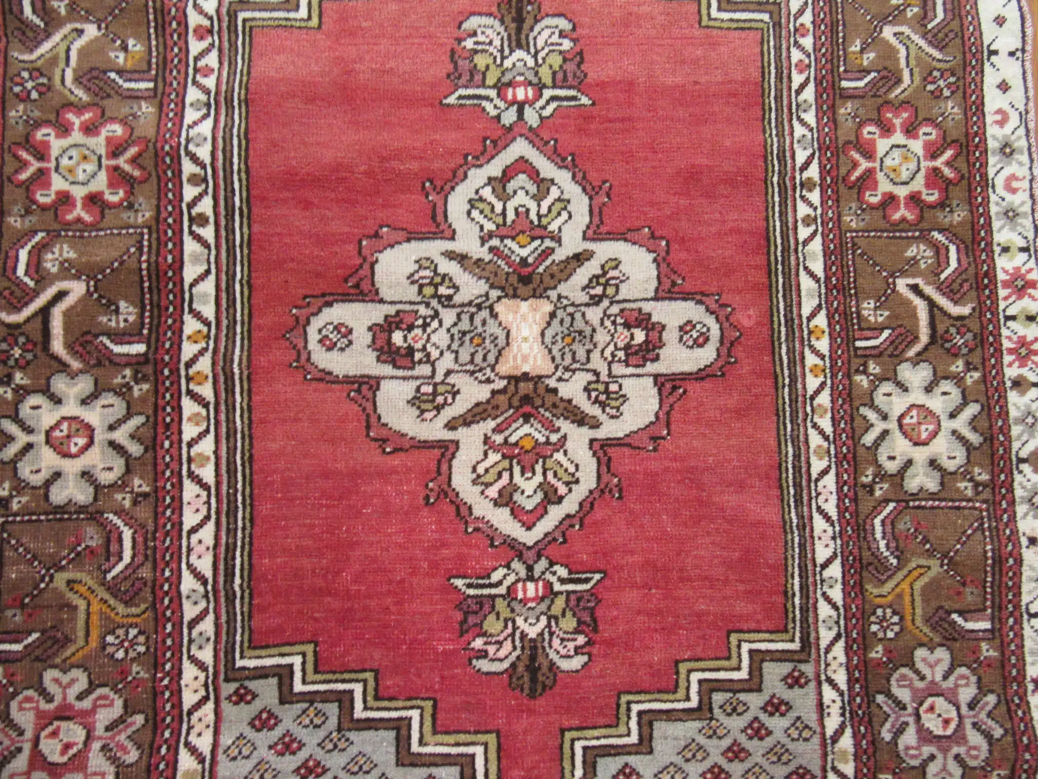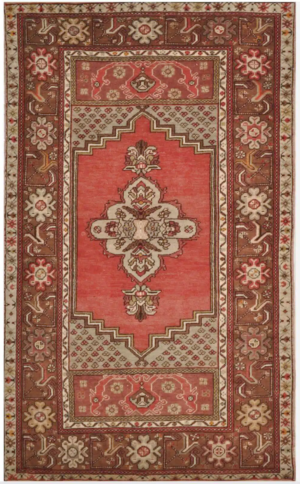 This vintage hand-knotted Turkish Anatolian rug displays a balanced central medallion framed by richly detailed borders, reflecting traditional Anatolian design with a versatile, transitional appeal. The warm rust-red field is complemented by ivory and soft beige accents, creating depth without overwhelming the space.