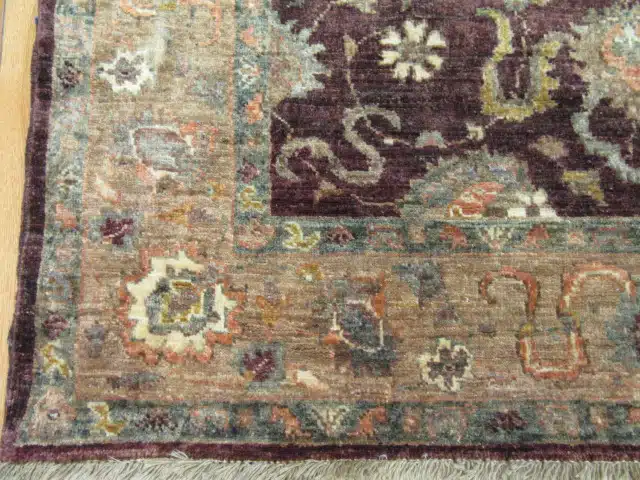 A wide border in soft gold and taupe tones frames the rug beautifully, adding warmth and balance while enhancing the intricate detailing throughout the piece. Subtle hints of ivory and muted blue add depth without overwhelming the composition.