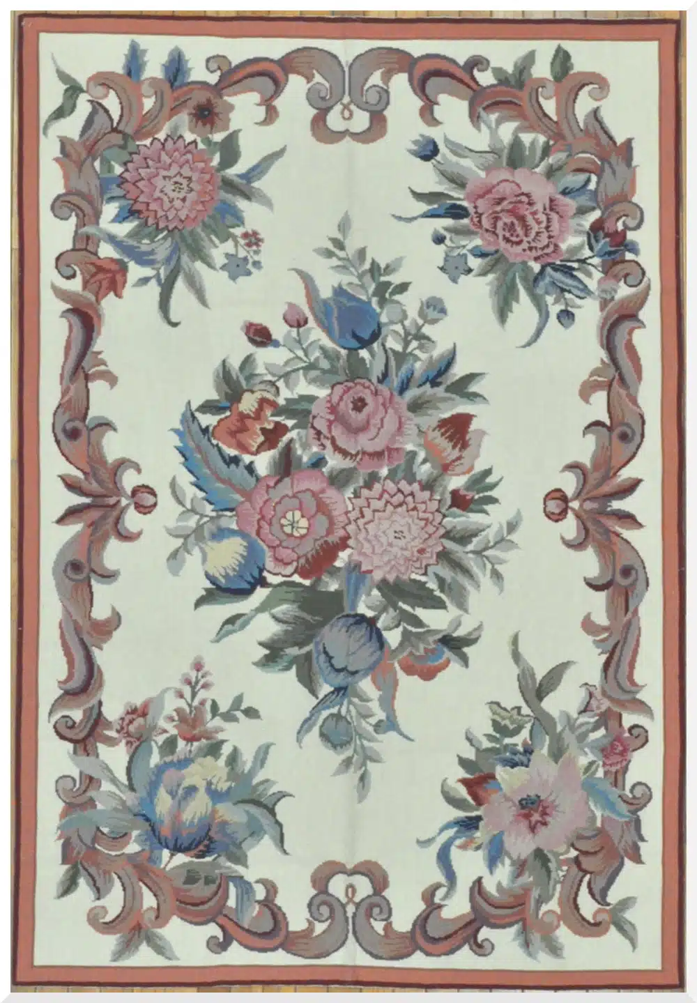 This beautiful handmade needlepoint rug features a refined floral composition inspired by classic European décor. A series of lush flower bouquets—crafted in delicate wool stitching—fills the center field, showcasing roses, peonies, and leafy arrangements rendered with painterly shading and detail.