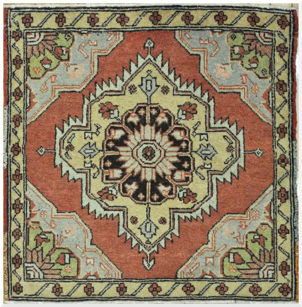 This square vintage Turkish Anatolian rug features a bold central medallion in ivory and black with hooked outlines on a rich rust background, surrounded by geometric corner spandrels and small floral fillers. The wide border repeats tribal motifs in matching colors, creating a strong, balanced composition typical of village weavings.