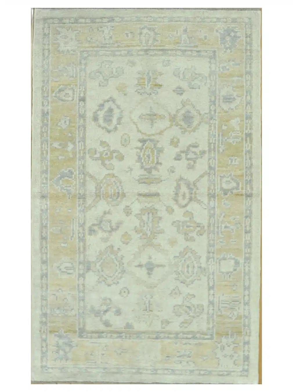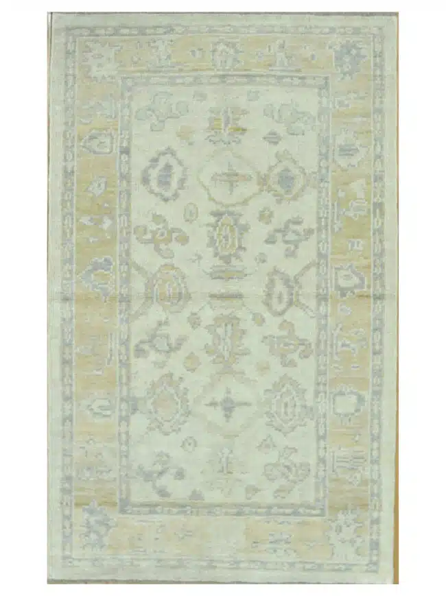 This new small Turkish Oushak rug features a delicate all-over design of soft, flowing vines and stylized floral medallions arranged across a gentle ivory field. The pattern is open and airy with larger central elements flanked by smaller motifs, giving it a relaxed yet refined look. A simple wide border in pale beige frames the composition with matching subtle floral details.
