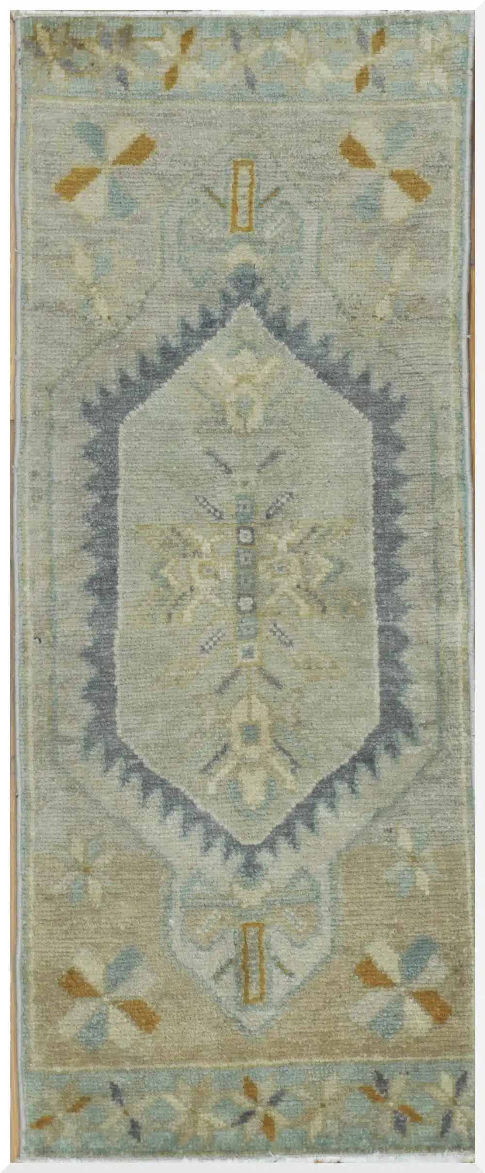This beautiful Turkish accent rug showcases a delicately faded central motif surrounded by subtle floral and geometric patterning. The soothing blend of beige, powder blue, and warm sand creates a peaceful and inviting look that complements a wide range of interiors.