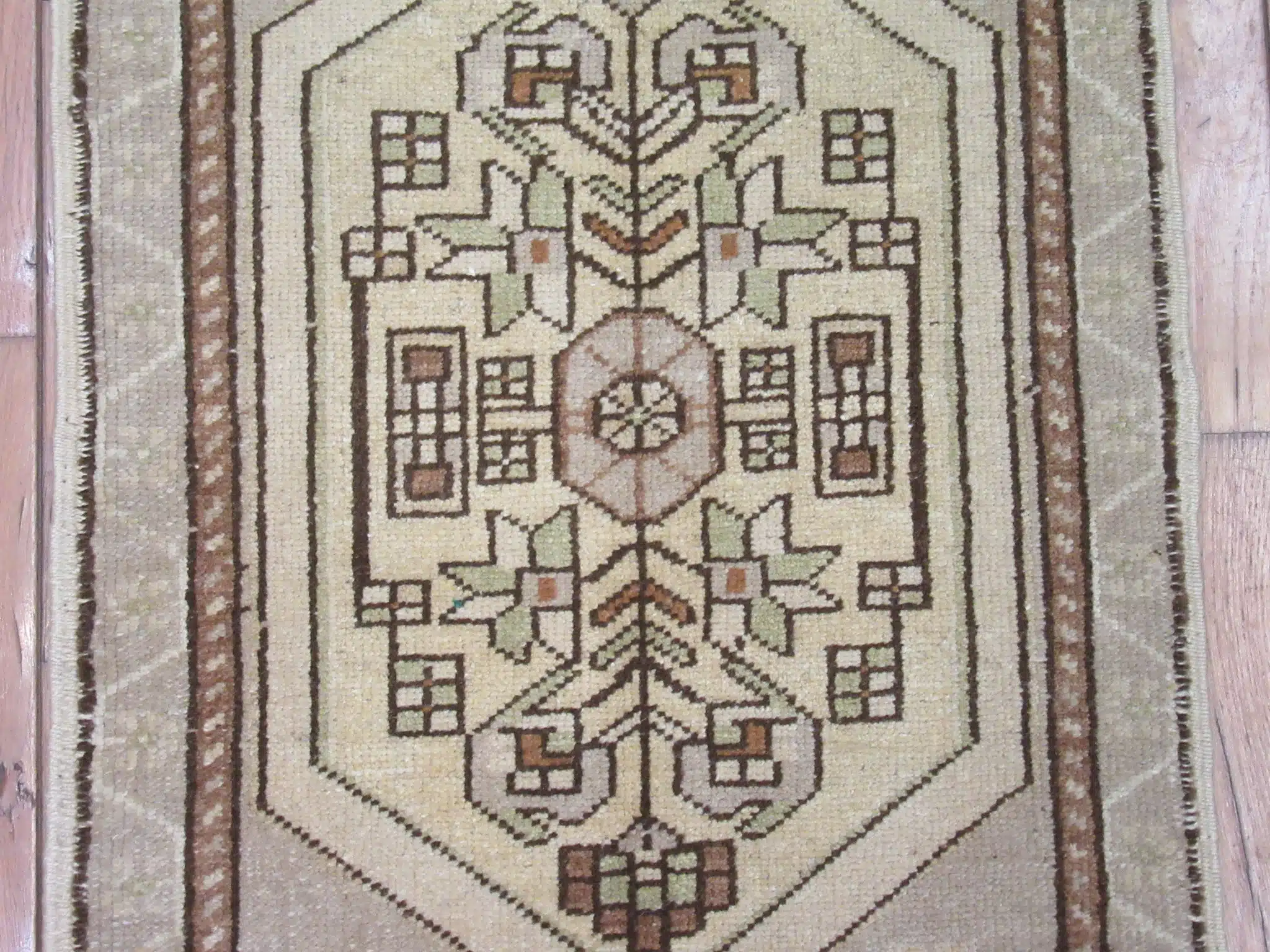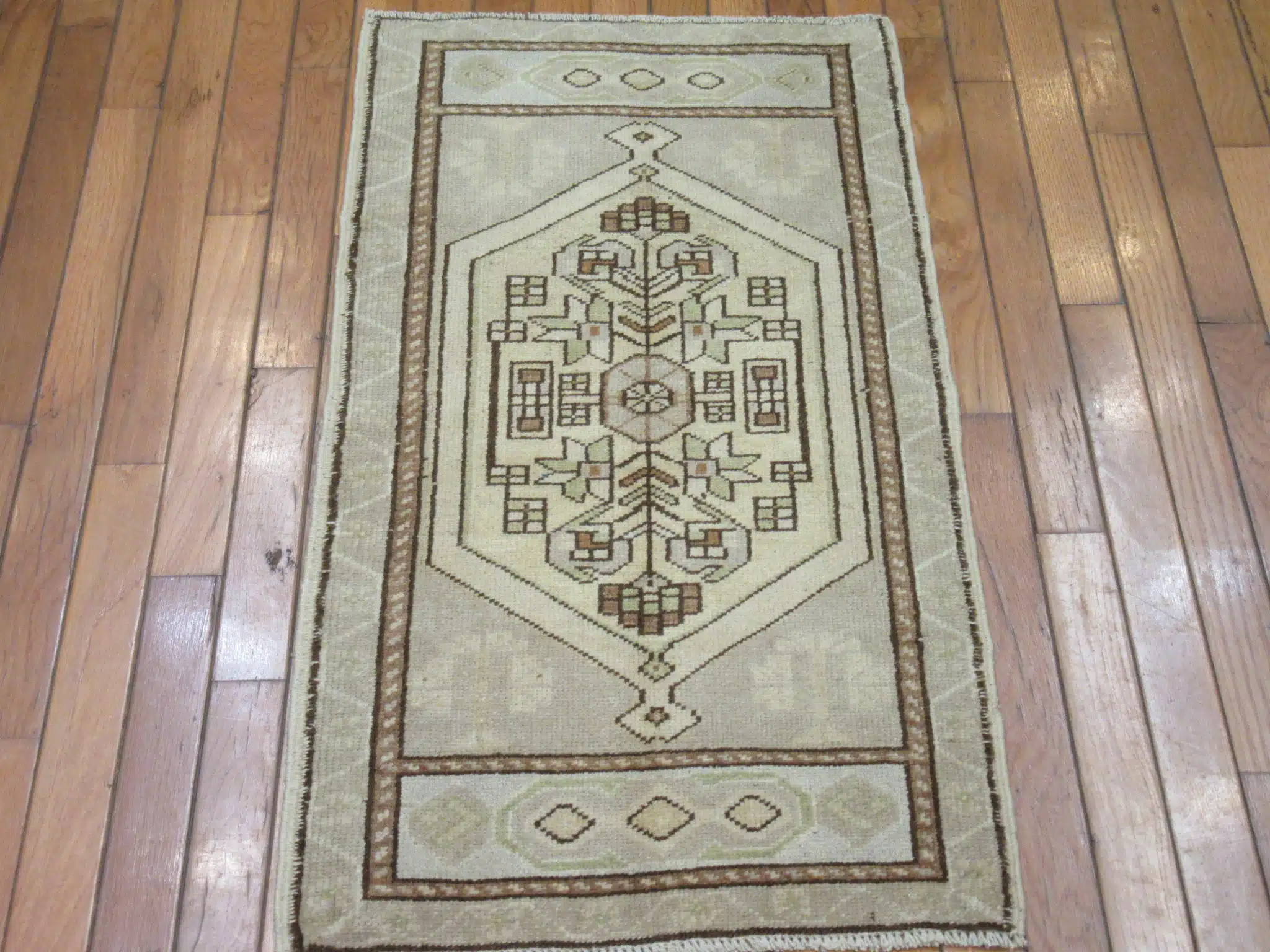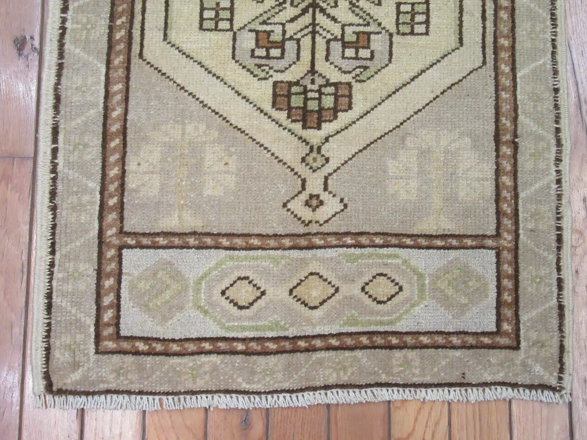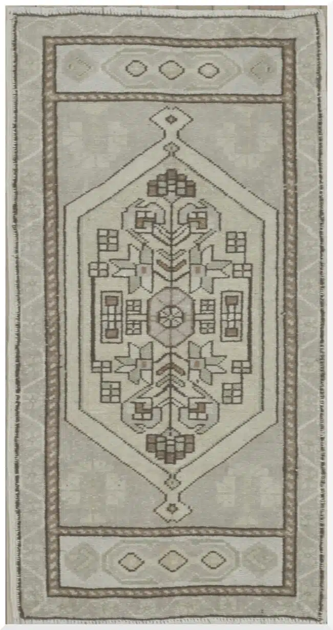 This elegant Turkish accent rug features a central geometric medallion framed by soft architectural borders inspired by traditional Anatolian village designs. The warm ivory background is layered with subtle beige and walnut brown detailing, creating a calm yet visually engaging composition.