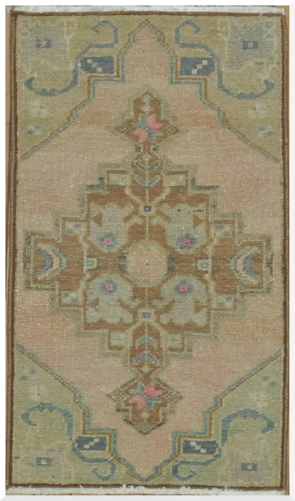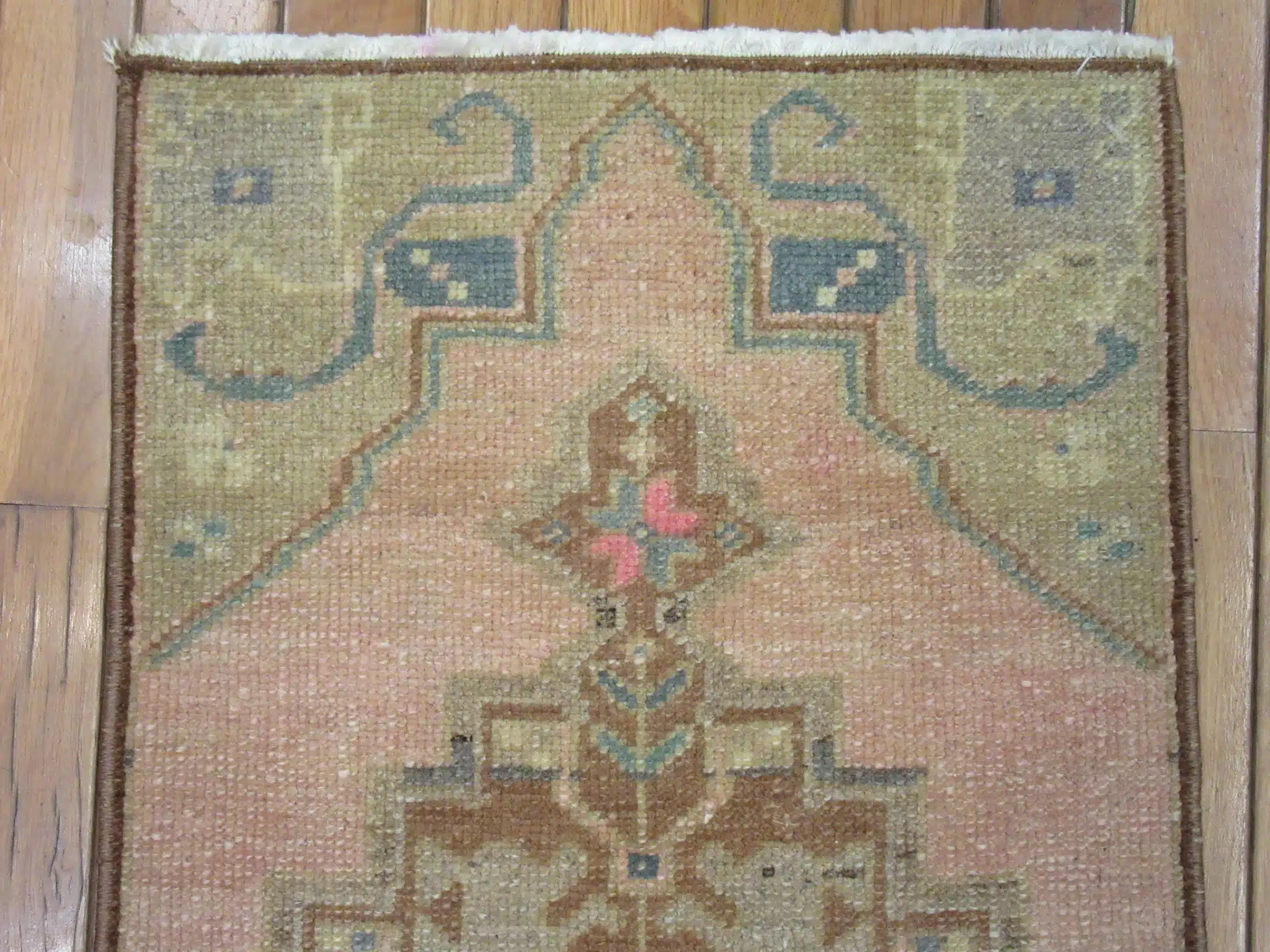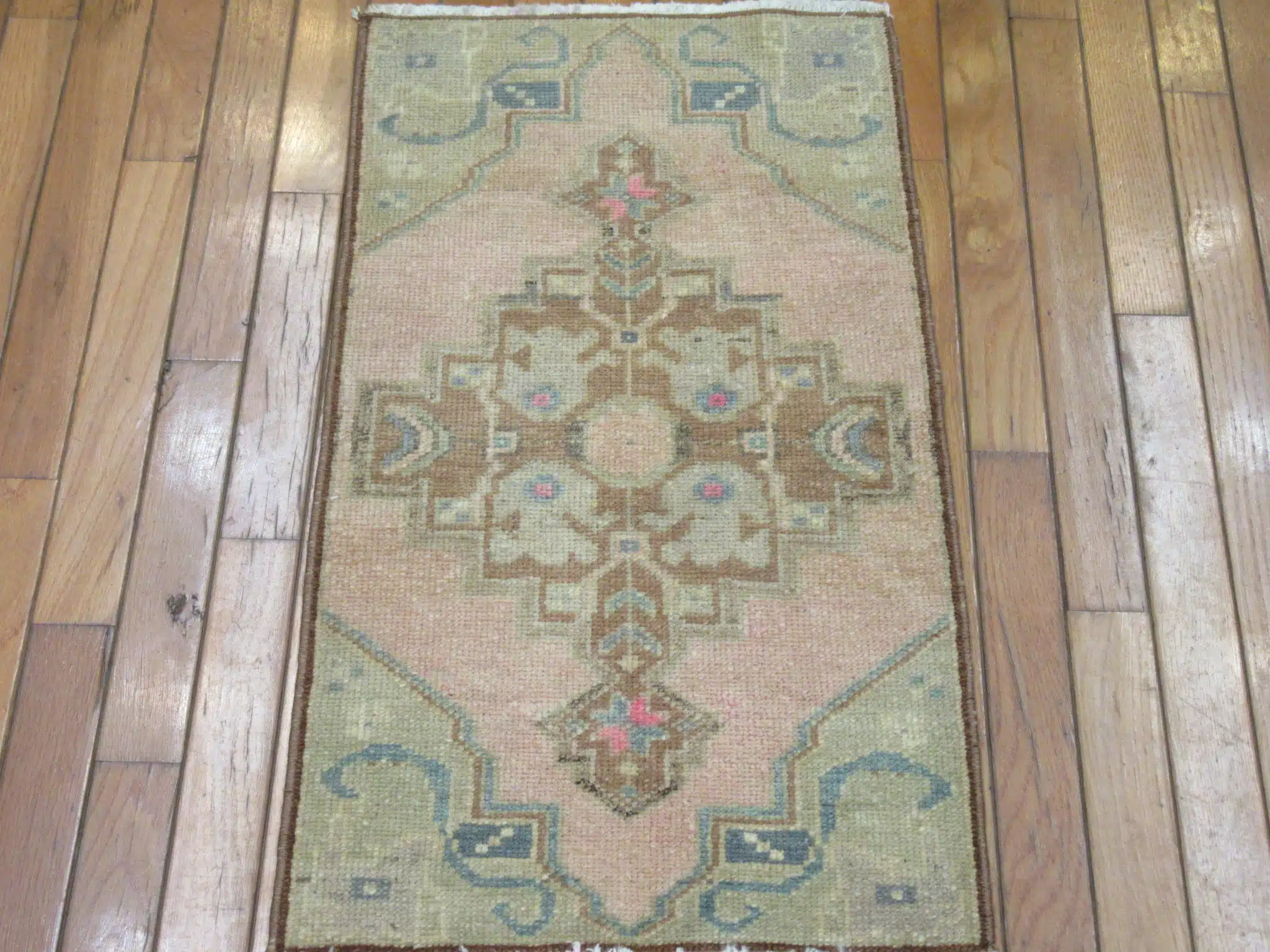 This Turkish runner showcases a beautifully aged central medallion set against a warm beige background, accented with delicate pastel tones that bring a gentle warmth and charm to any space. The soft fading creates an authentic vintage look while maintaining a balanced and graceful presence.