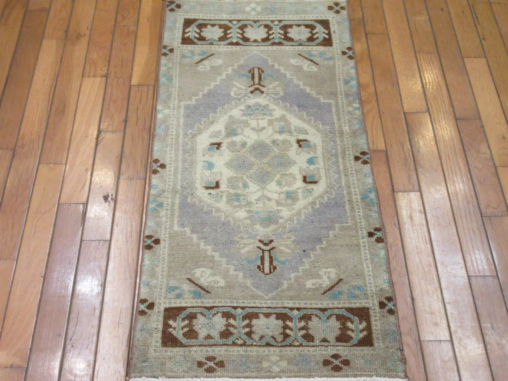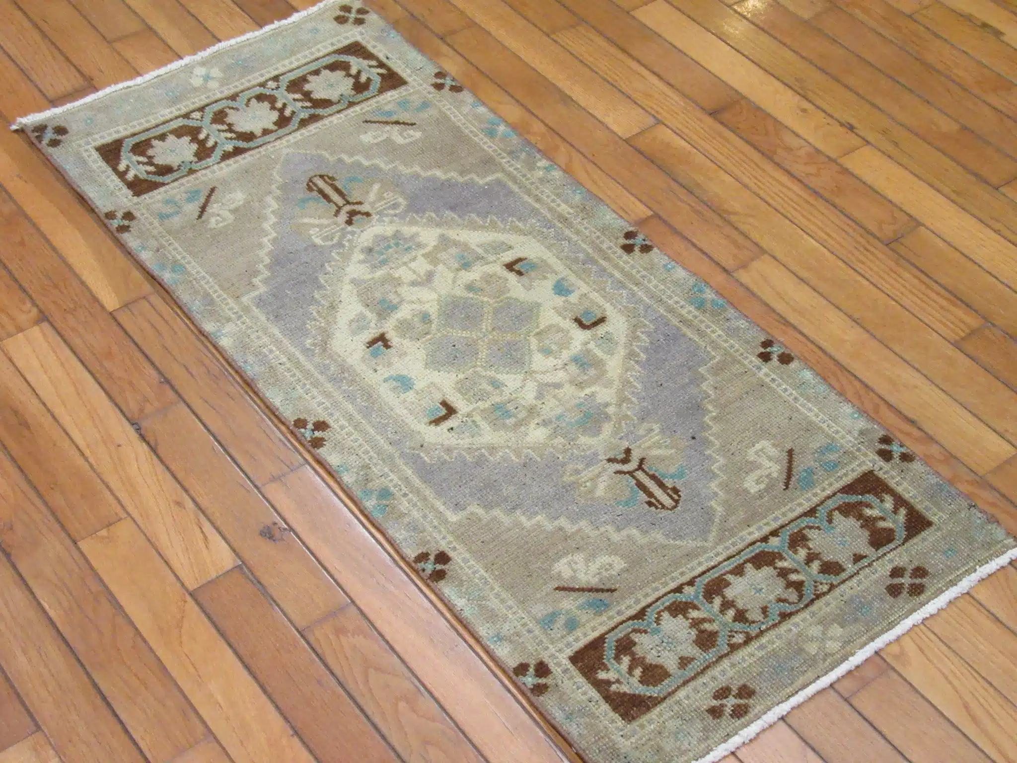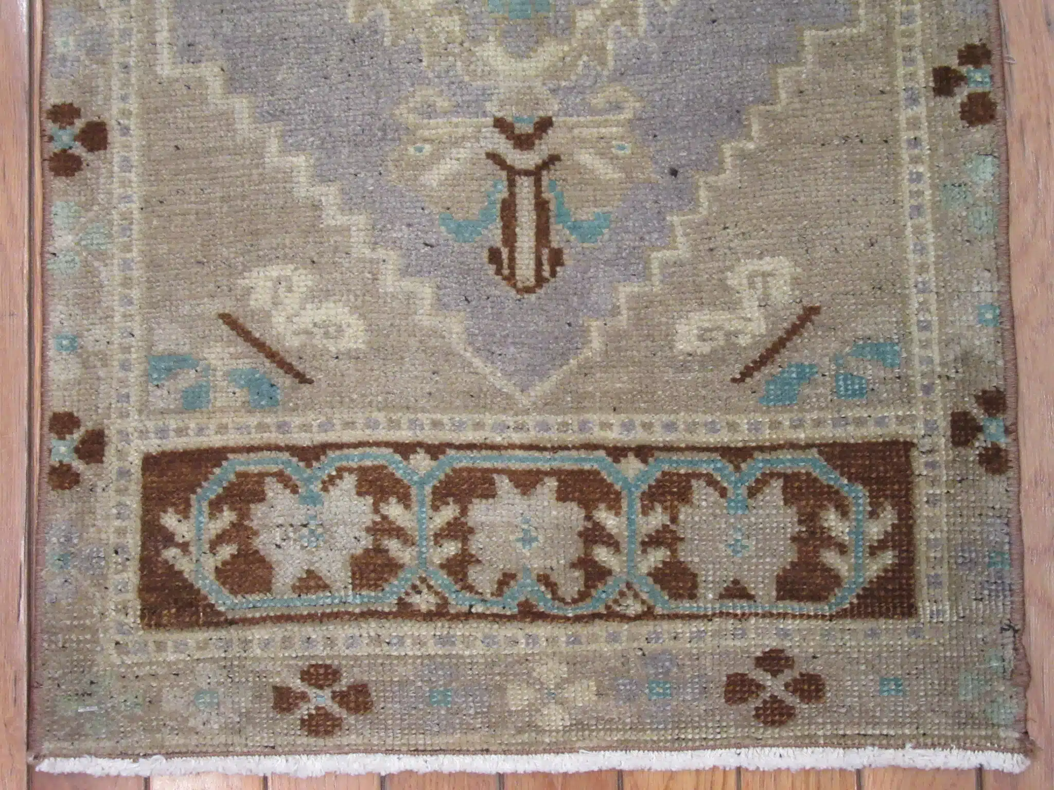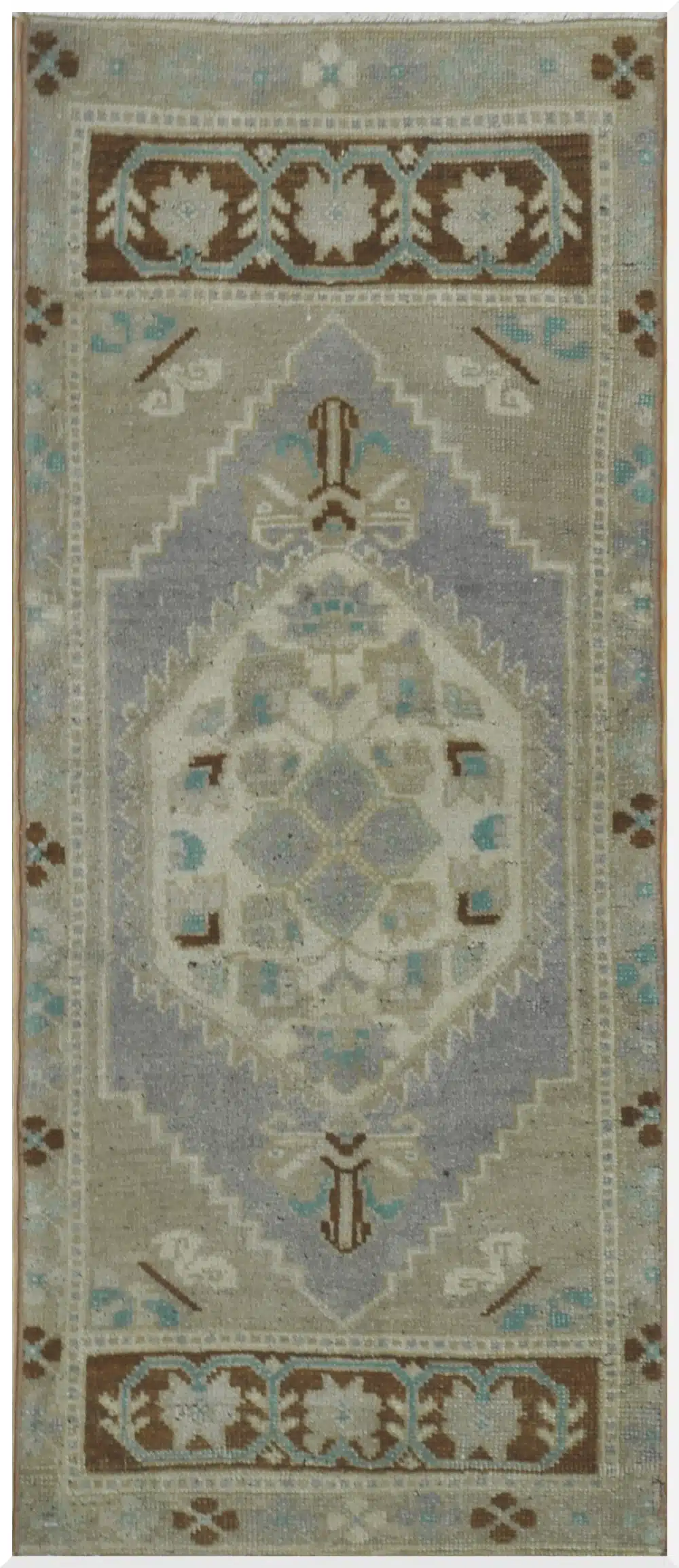This handmade Turkish runner features a soft neutral foundation accented by pale blue and warm brown geometric motifs. The design reflects traditional Anatolian influence, simplified into a transitional style that feels both timeless and contemporary.