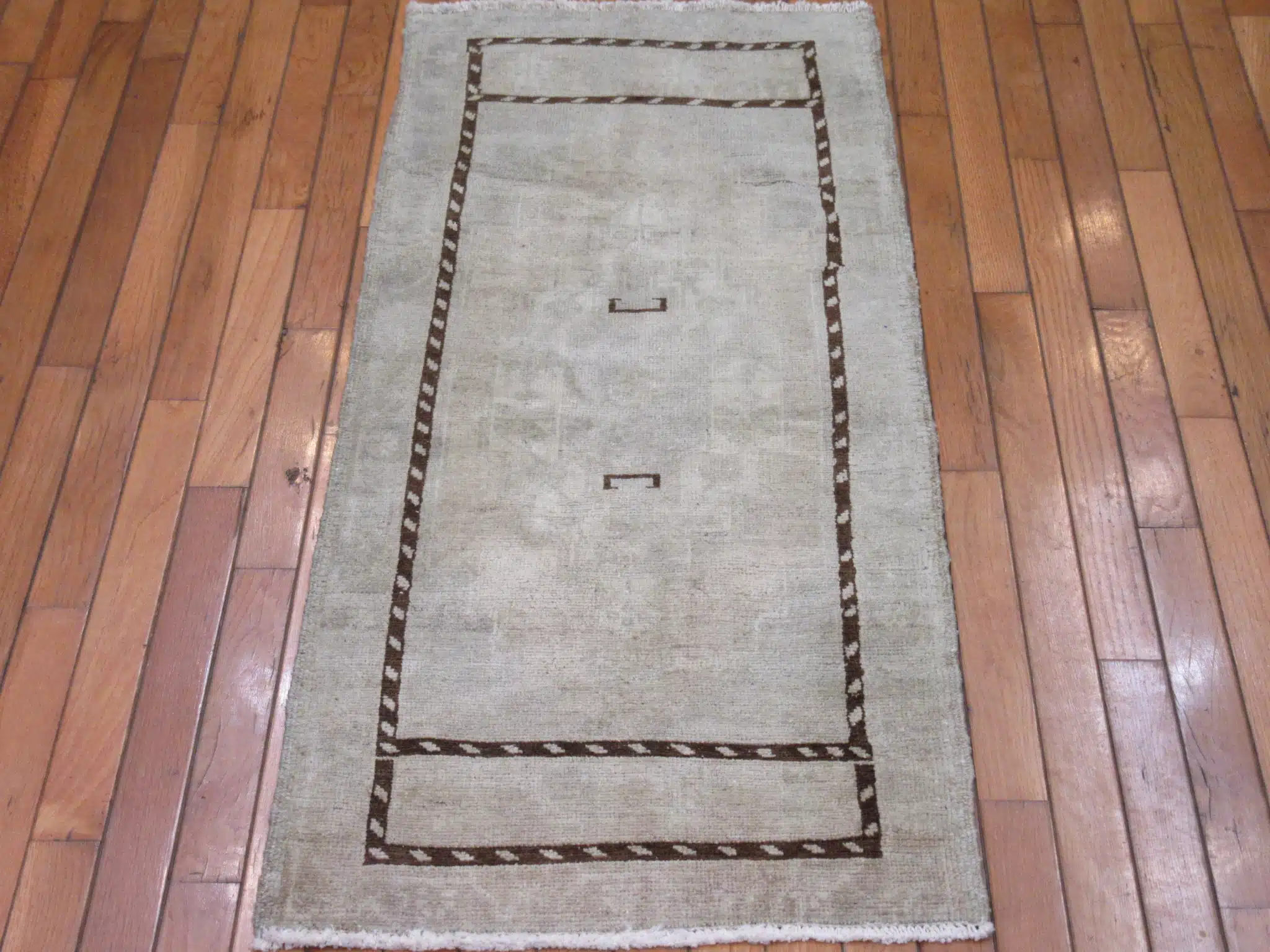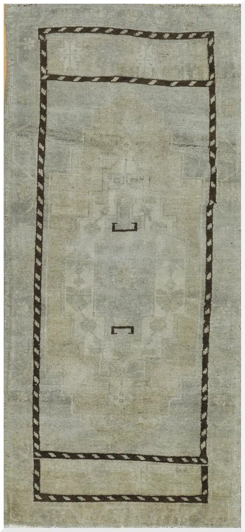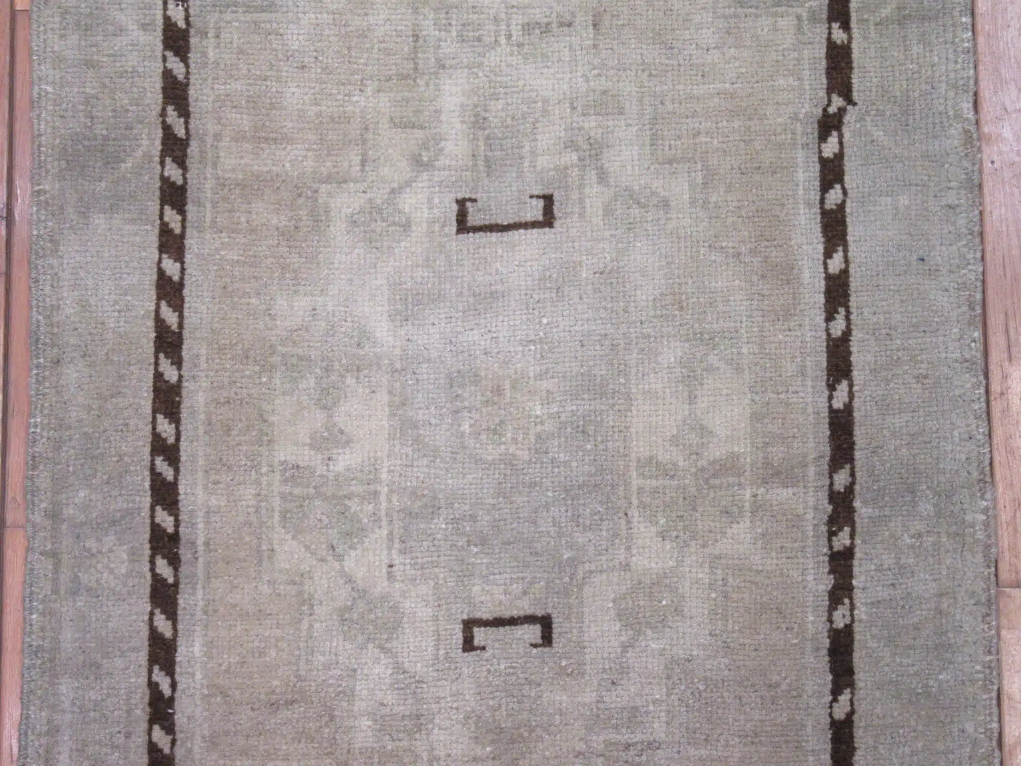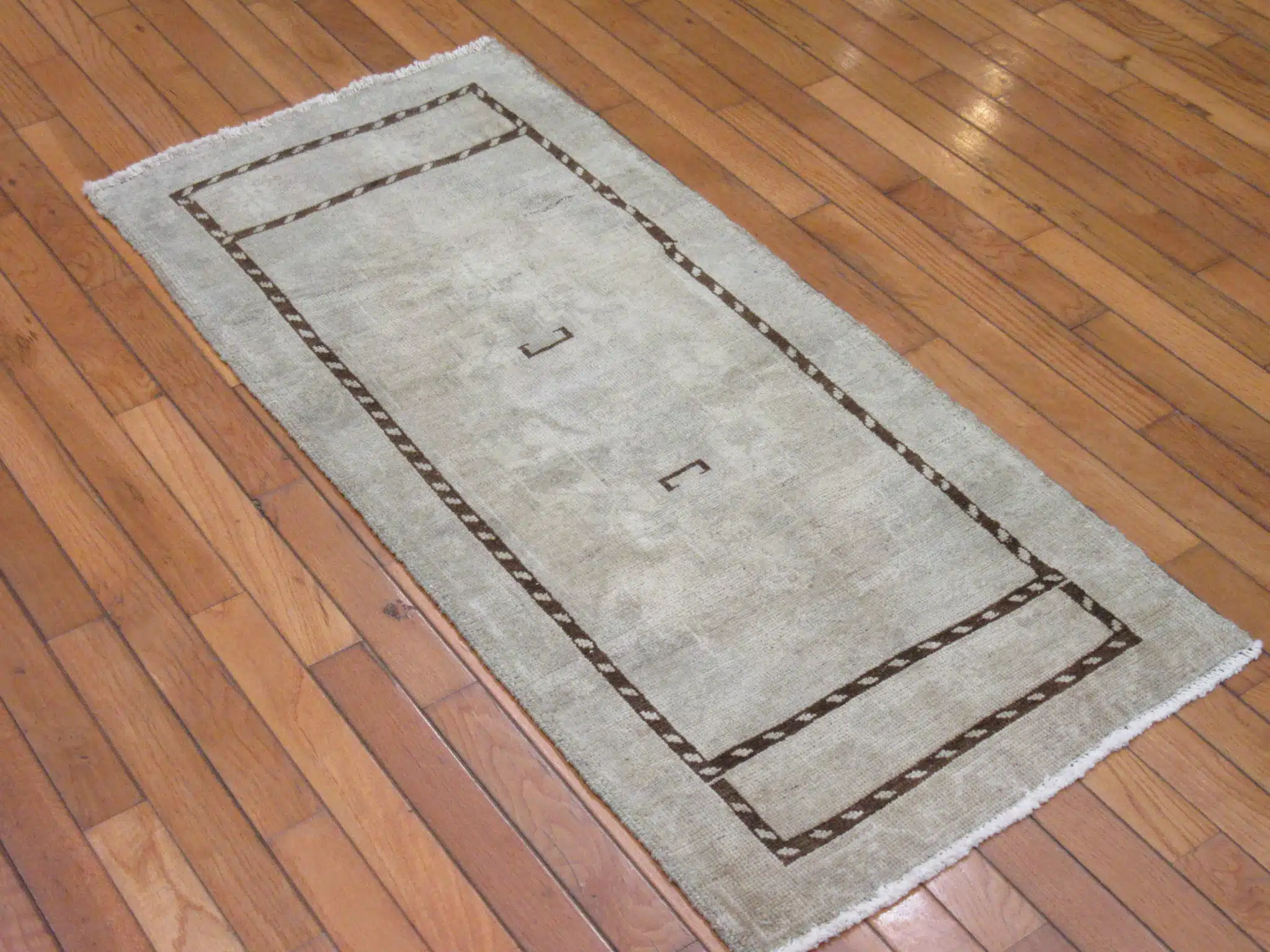 This elegant handmade Turkish runner showcases a refined minimalist design framed by a bold geometric border. Its soft ivory field creates a calm foundation while the dark brown linear detailing adds structure and contrast in a clean, modern layout.