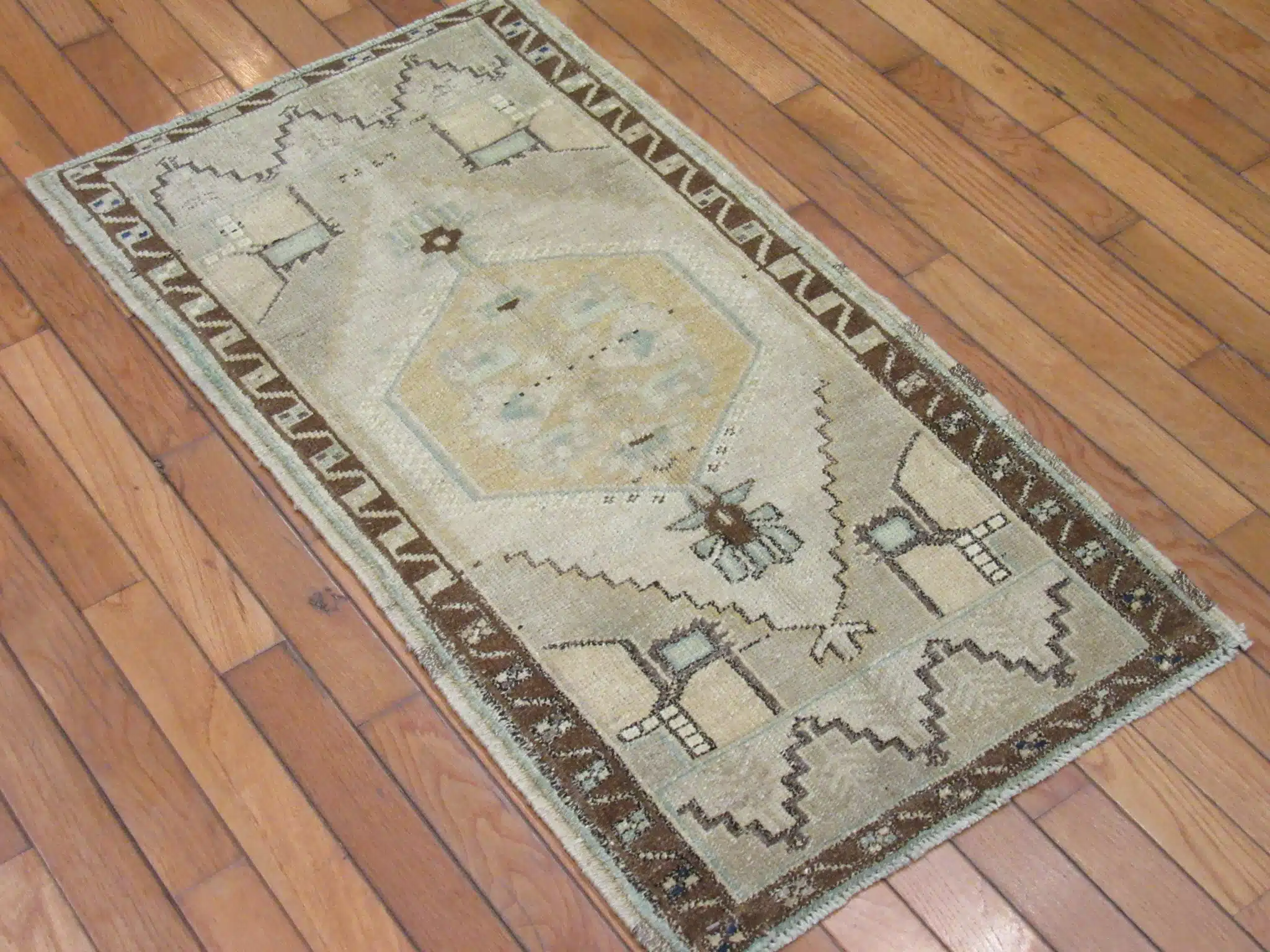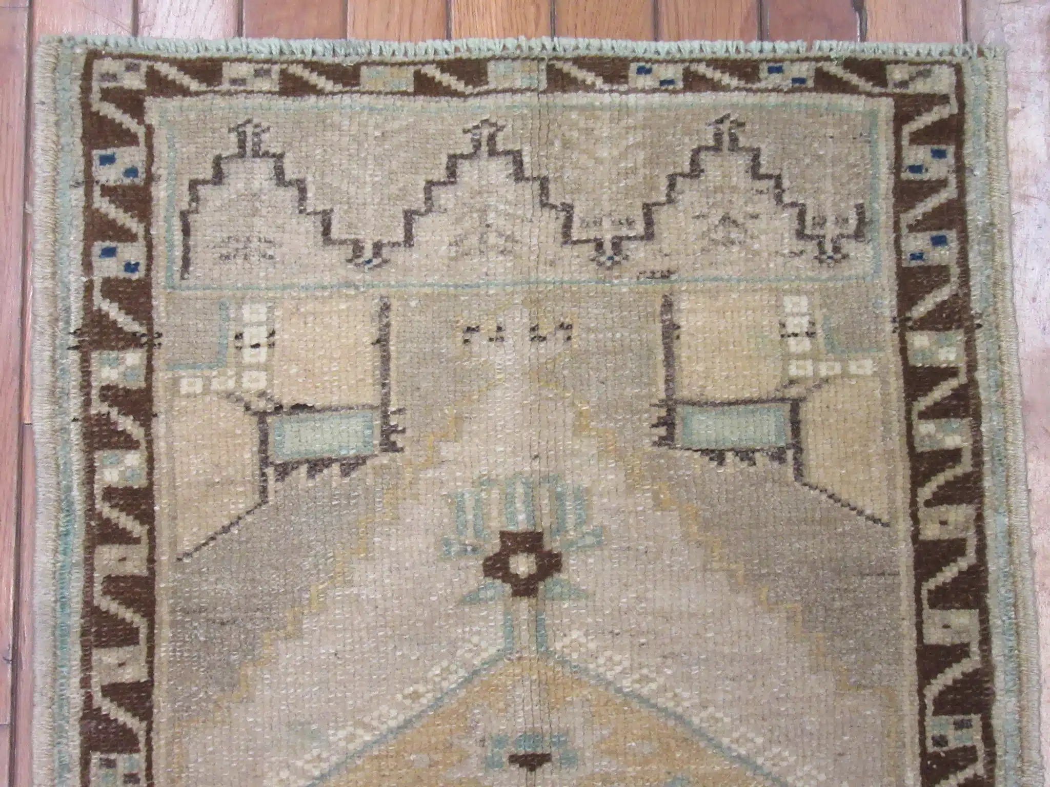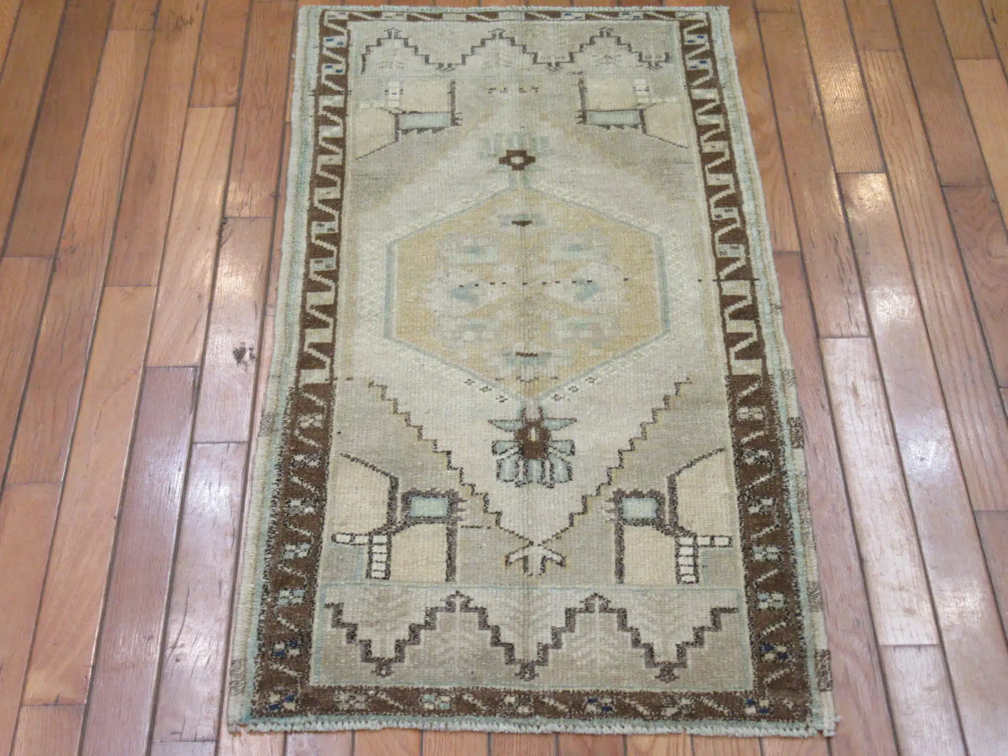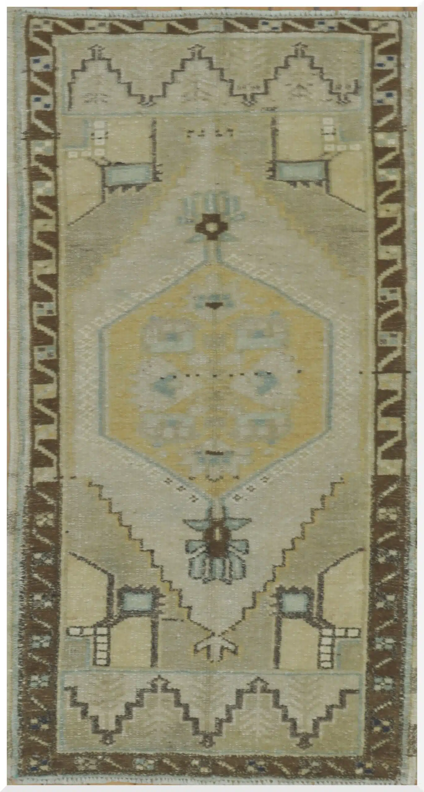 This unique handmade Turkish rug features traditional symbolic motifs arranged in a balanced tribal-style composition. The central figure, flanked by protective geometric forms and framed by a bold border, reflects ancient Anatolian design language passed down through generations of weavers.