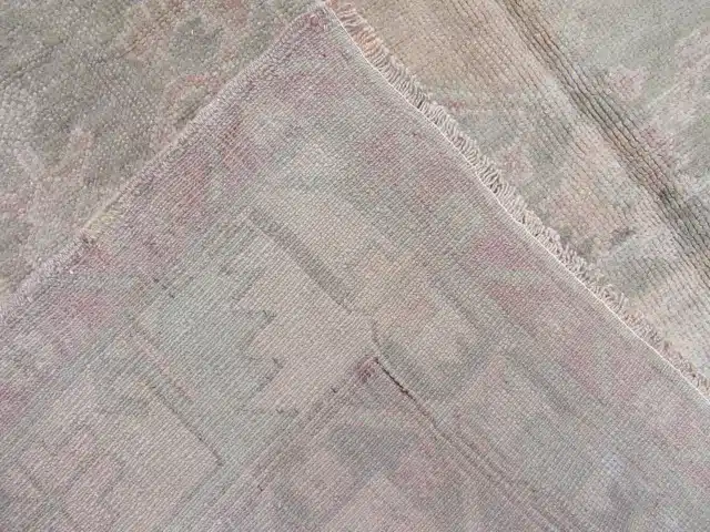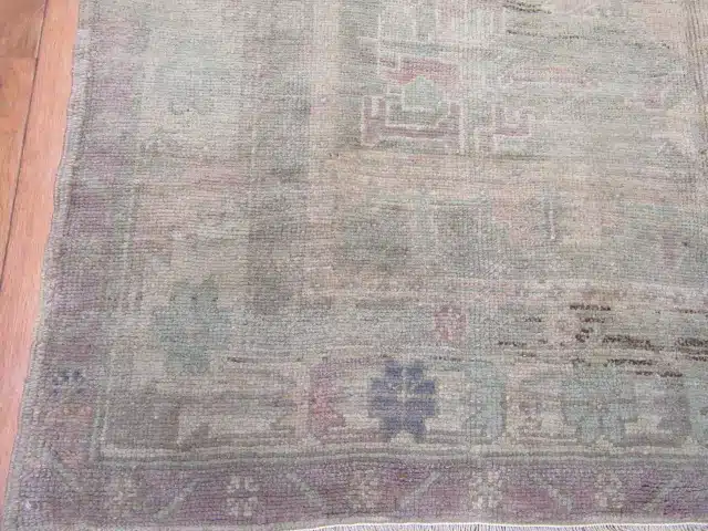 Crafted with wool pile on a wool foundation, the rug offers a soft texture with lasting durability. Its gentle wear enhances the vintage appeal without compromising structure or integrity.