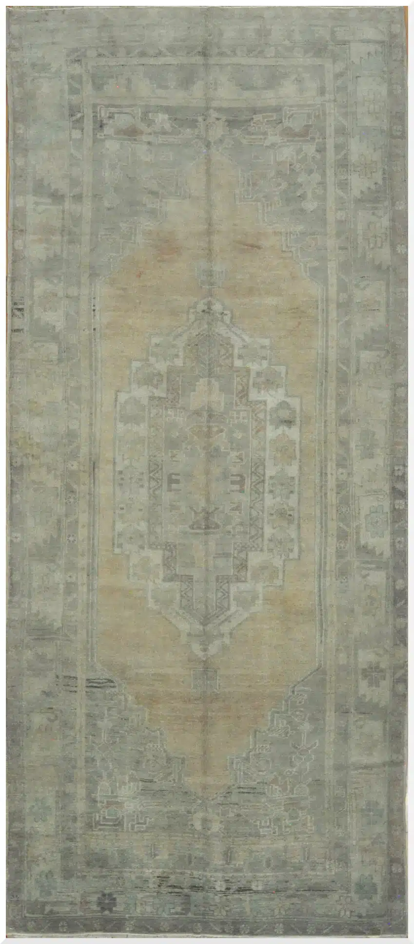 This vintage hand knotted Anatolian runner showcases a beautifully subdued and antique-washed palette, creating a calm and understated presence. The design features simplified geometric medallion motifs that gently emerge from the soft neutral background, giving the rug a timeless and architectural character.