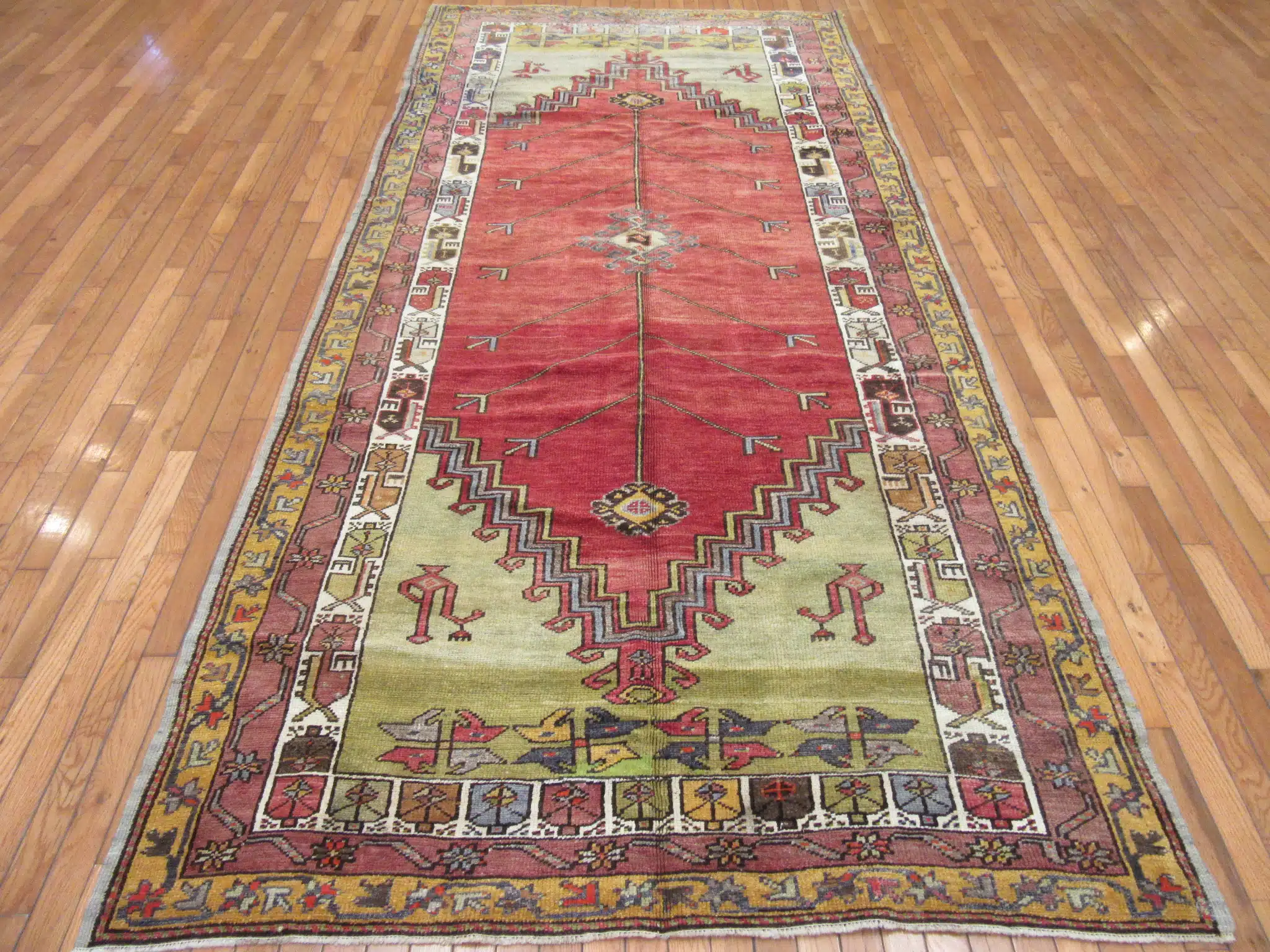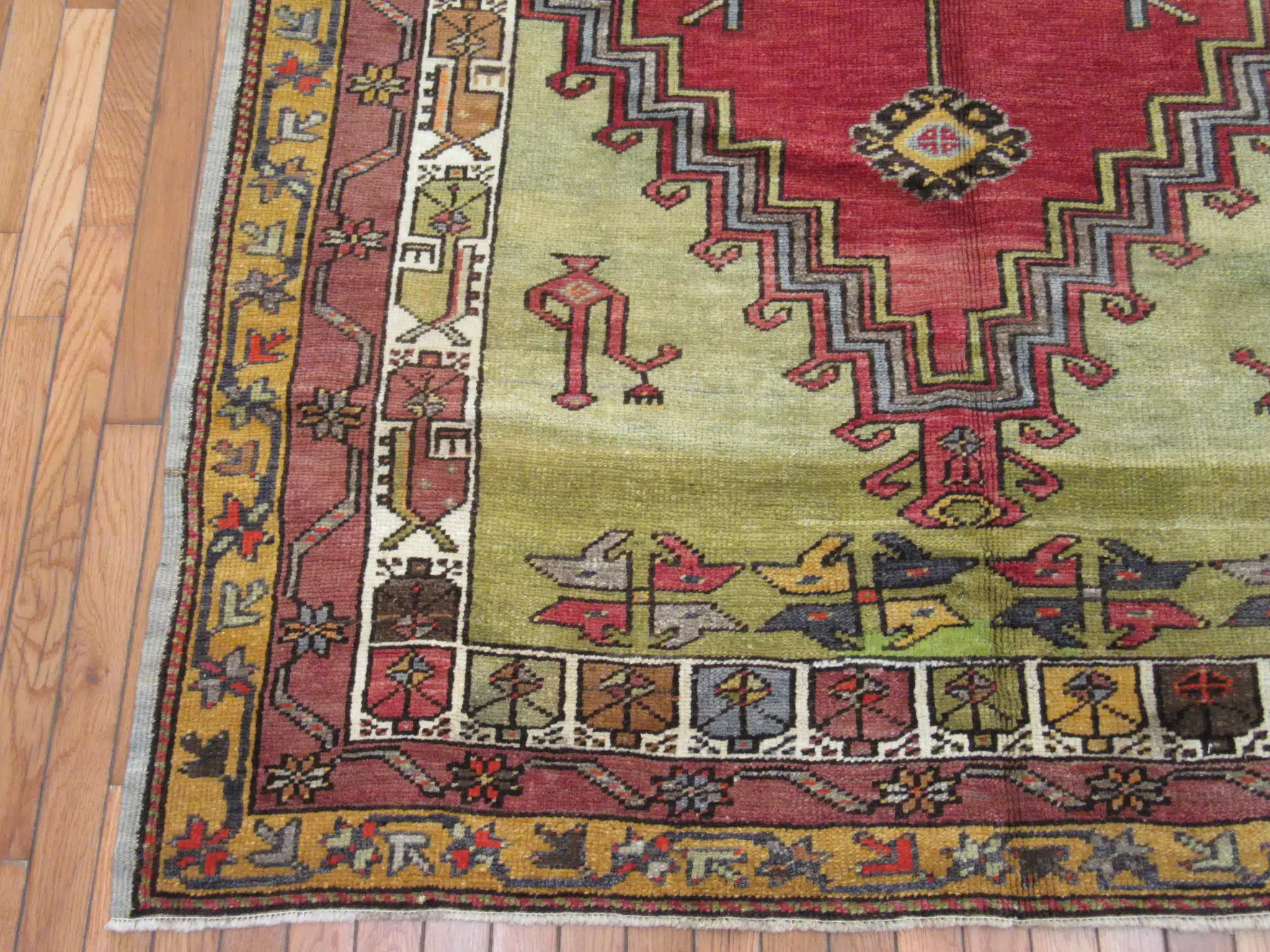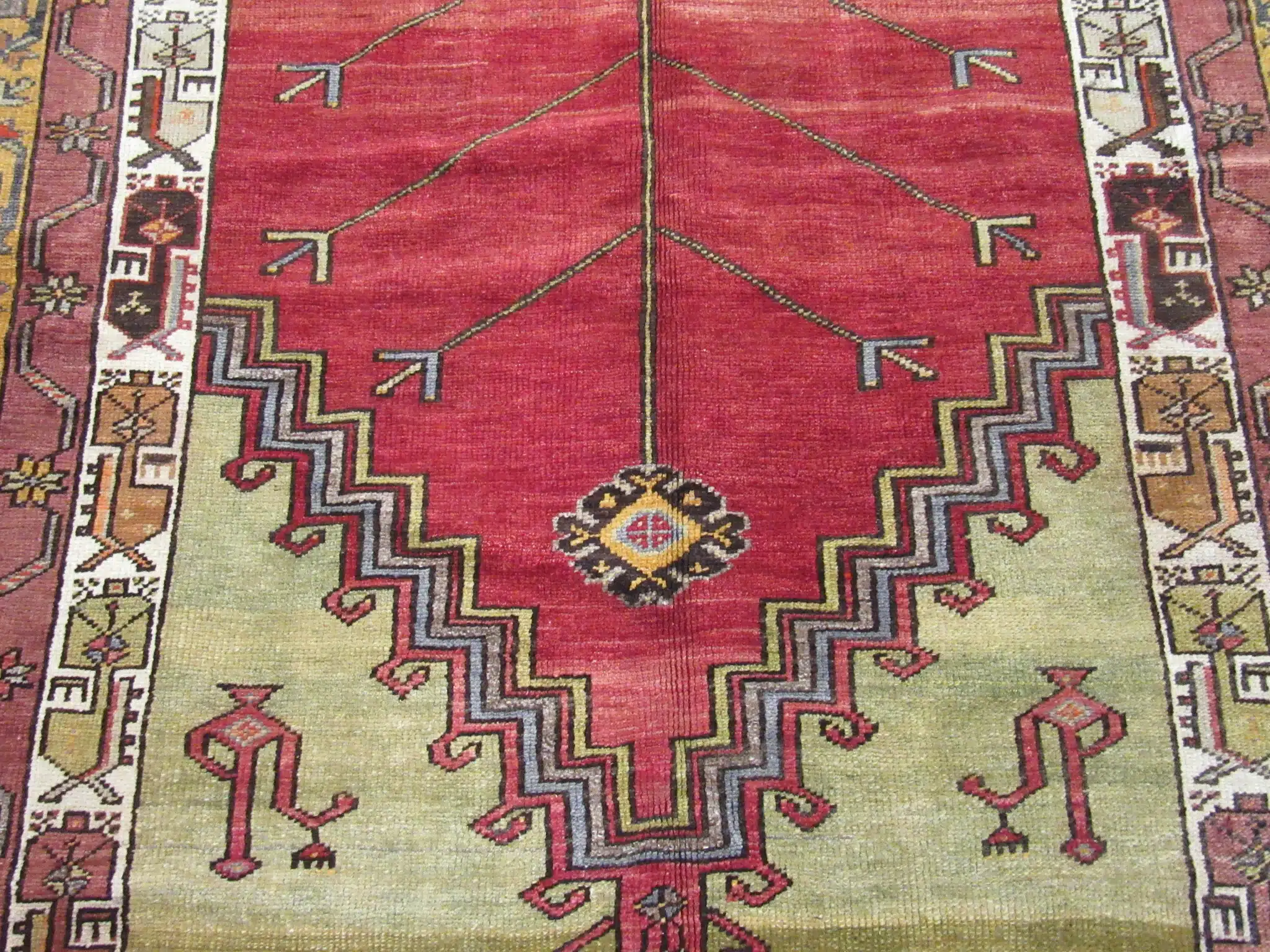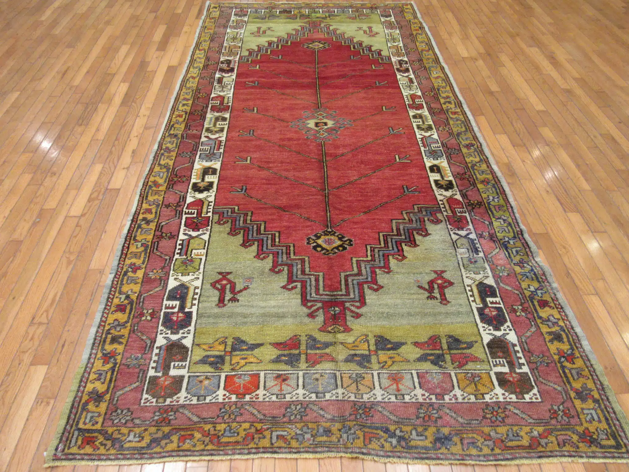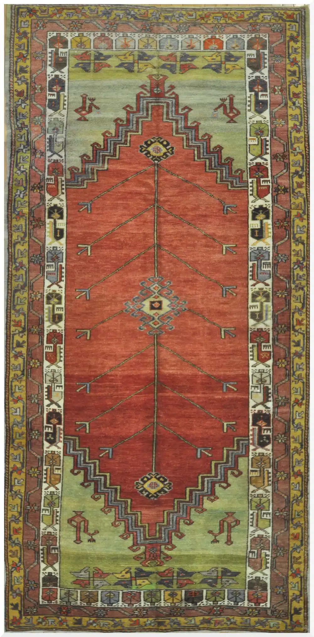 This vintage hand-knotted Turkish rug originates from the Anatolian region and features a bold tribal composition centered around a stylized tree-of-life motif. The elongated format is defined by a rich brick red field, symbolizing strength and vitality, framed by contrasting sage green panels and a lively geometric border.