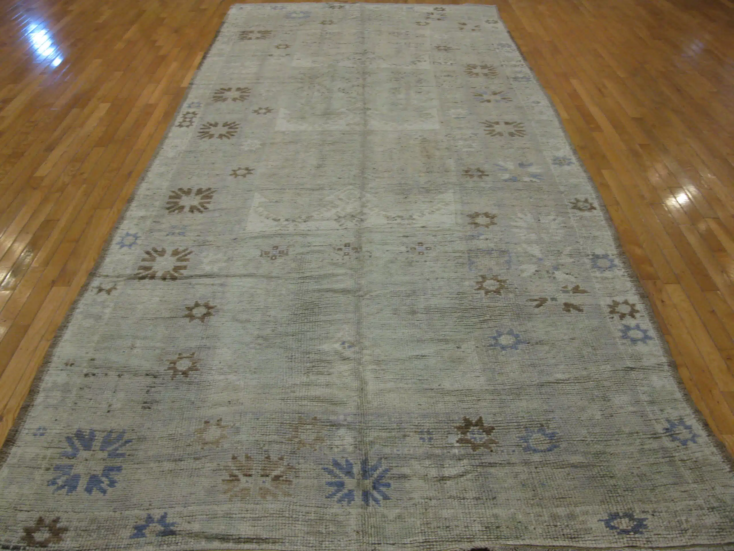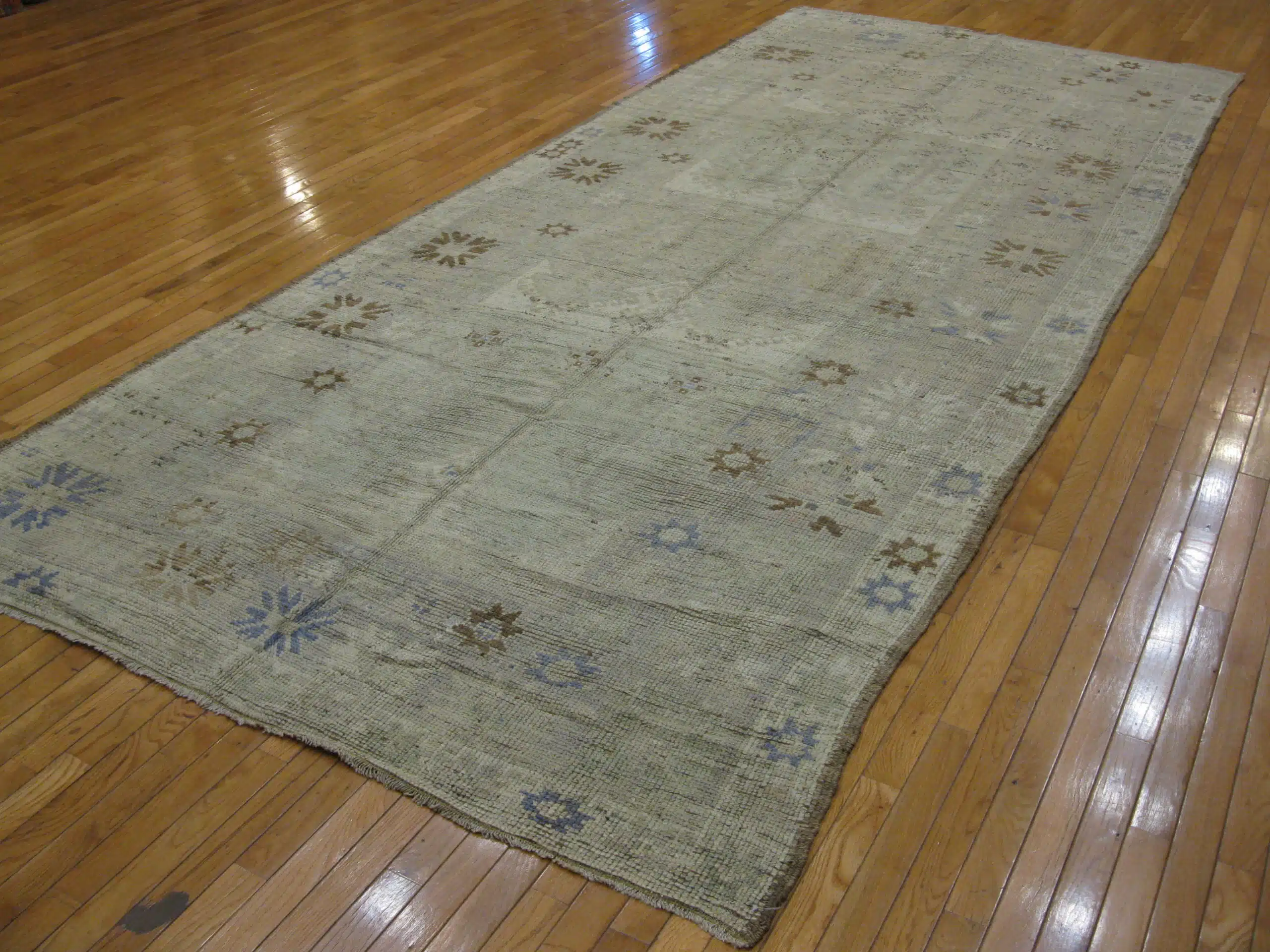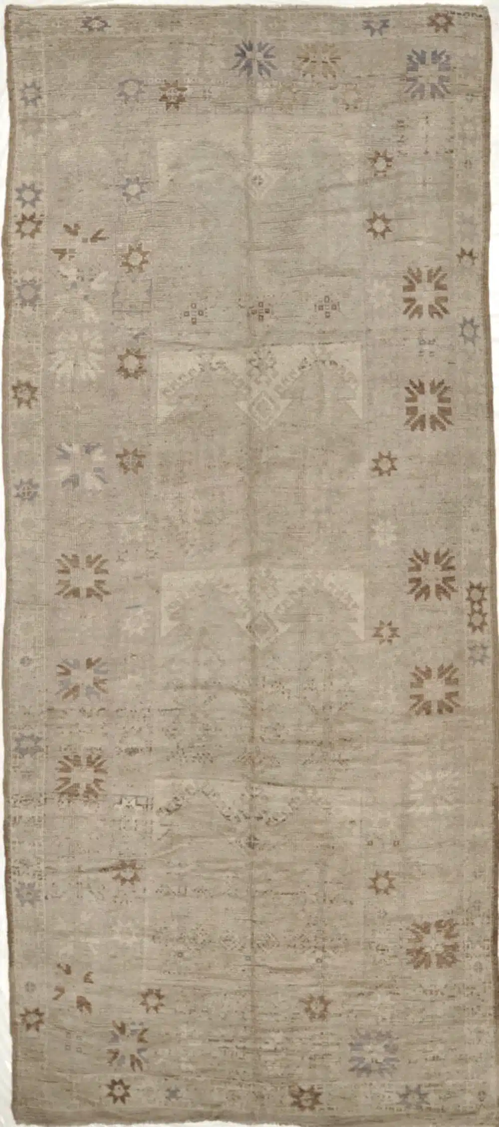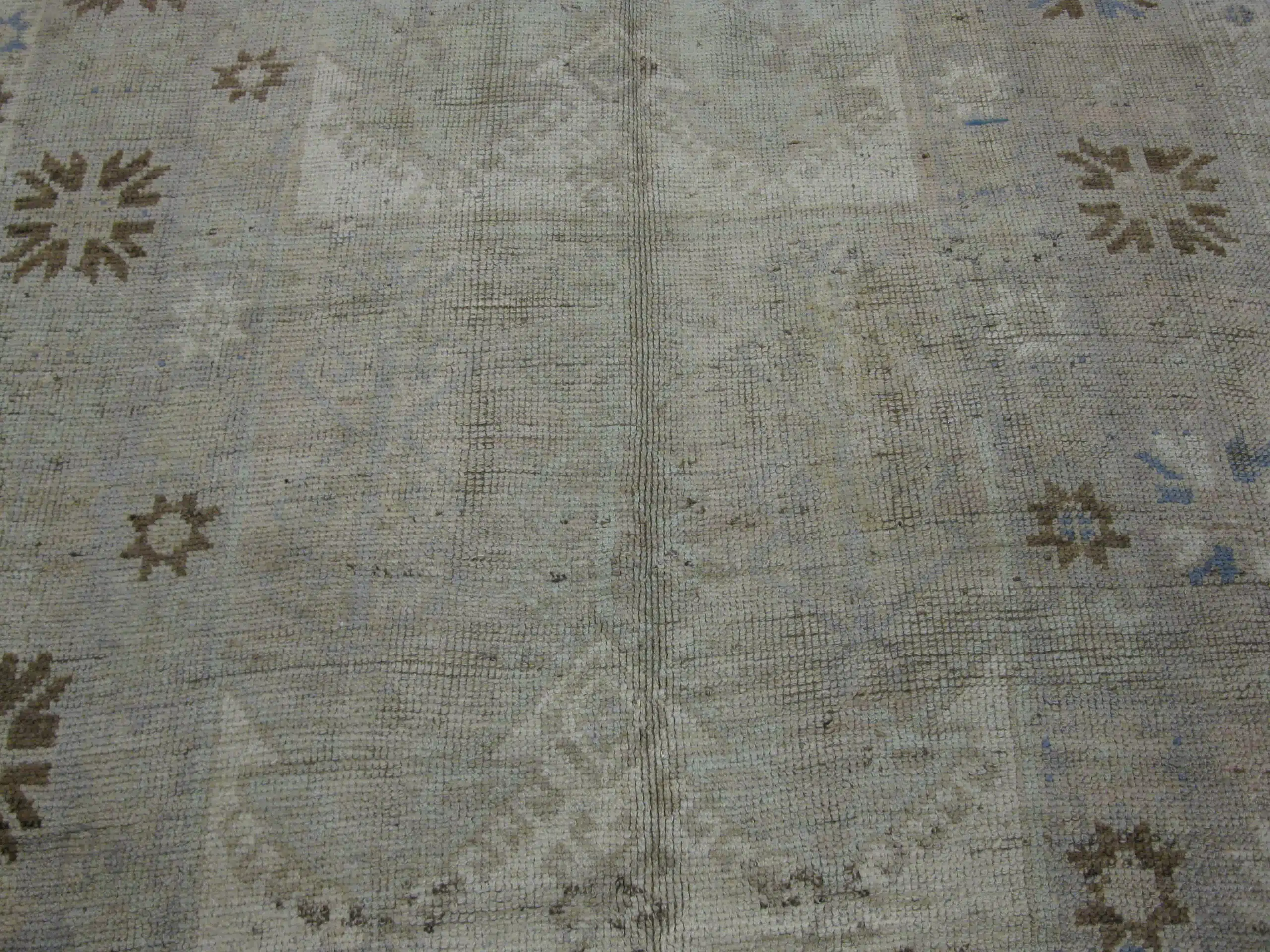Hand knotted in Anatolia using high-quality wool, the rug reflects traditional Oushak-inspired weaving with simplified symbols and softened forms. The gentle abrash and naturally aged wool create depth and texture while maintaining a calm, neutral presence.