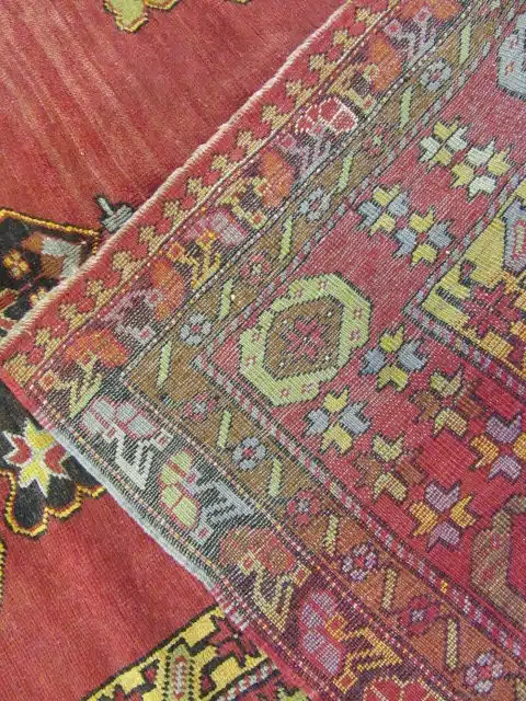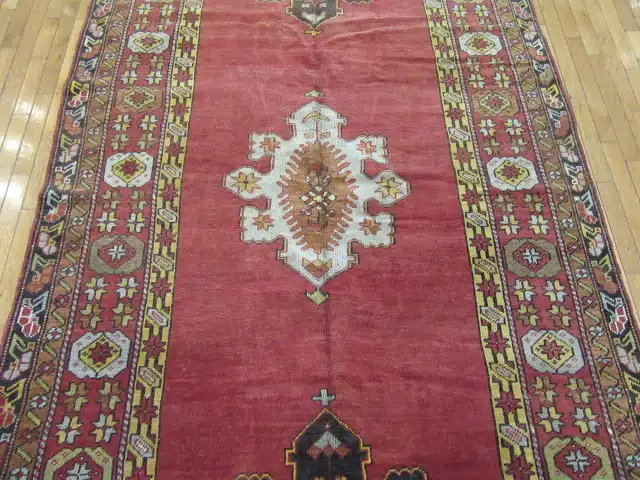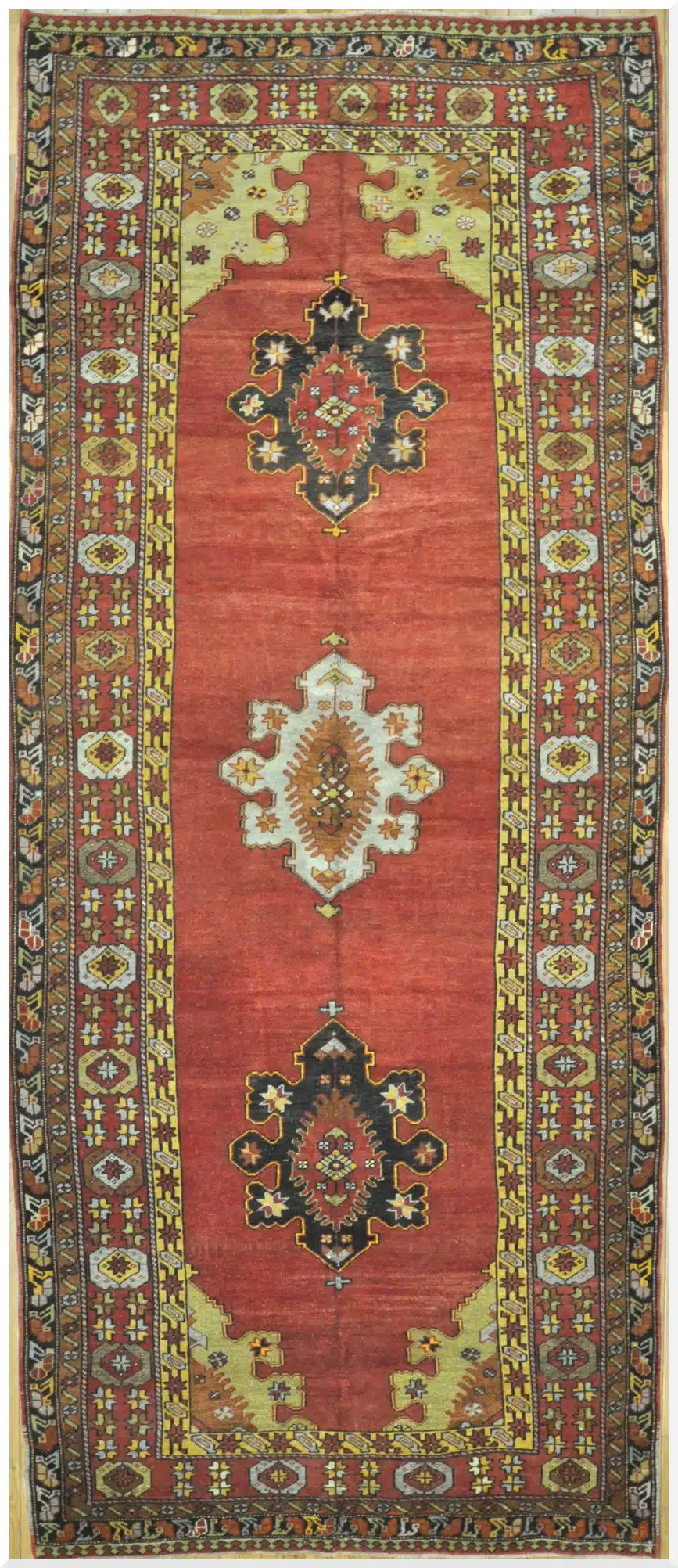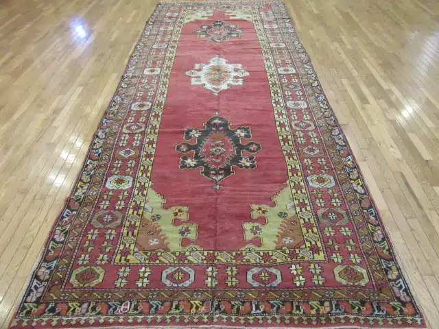 This vintage hand-knotted Turkish rug from Central Anatolia features a striking elongated format highlighted by bold medallion motifs arranged along a rich brick red field. The balanced symmetry and strong geometric forms reflect classic Anatolian weaving traditions, where design and symbolism are deeply rooted in regional heritage.