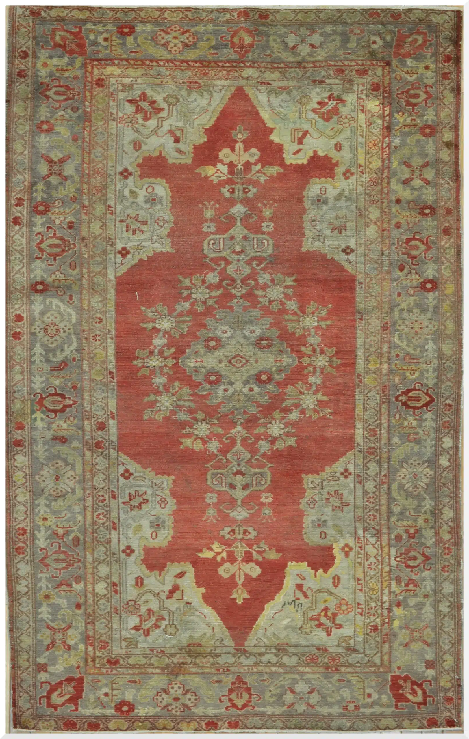 This vintage Turkish Oushak rug showcases a classic elongated medallion composition set against a warm rust-red field, softened by a surrounding ground of muted sage and aqua tones. The balanced layout and generous negative space are hallmarks of traditional Oushak design, known for its refined elegance and timeless appeal.